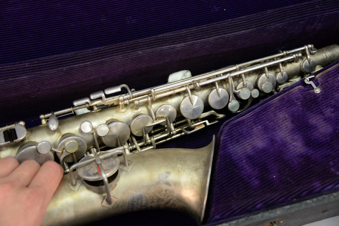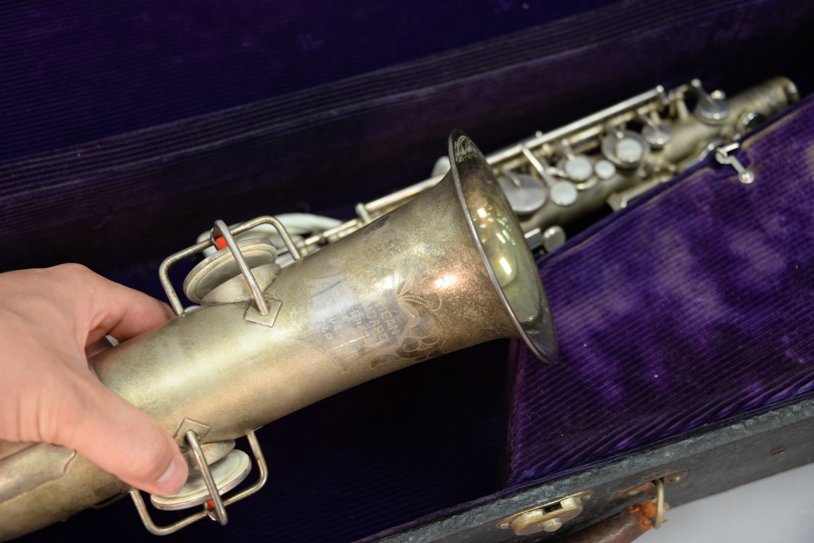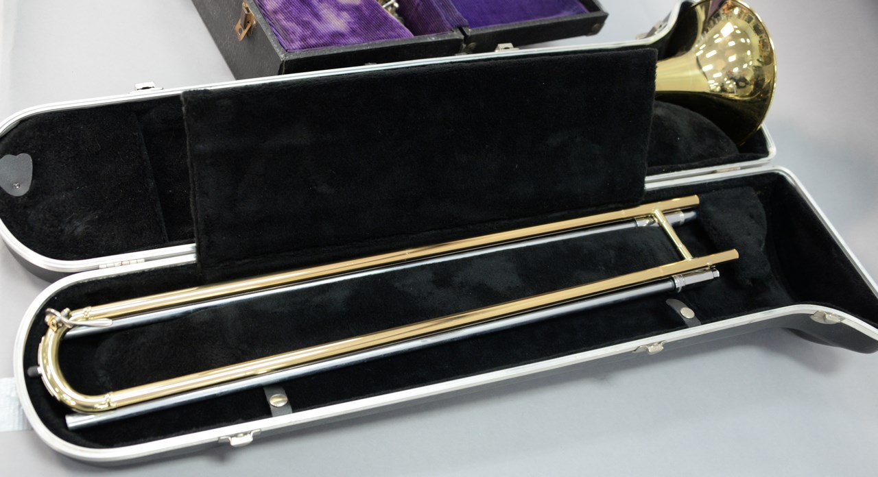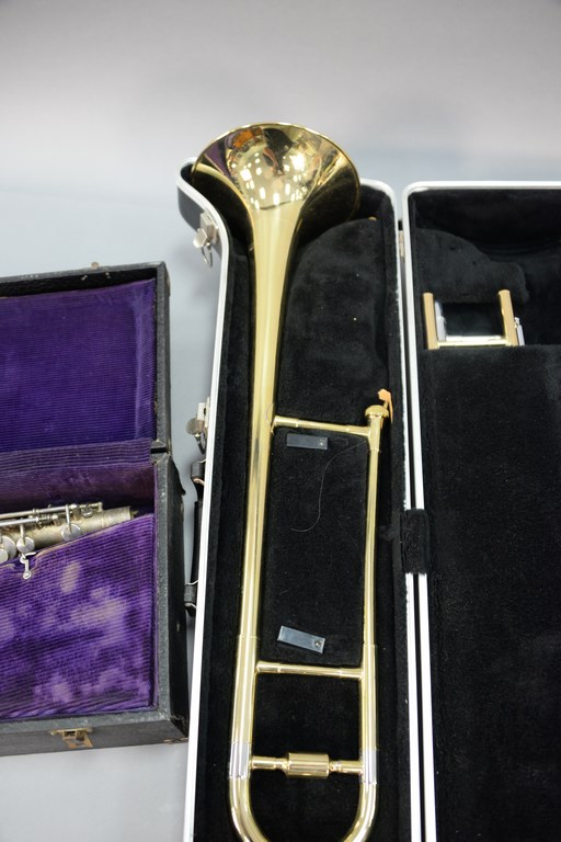 Two instruments including American Standard Saxophone high grade lg. 24 in. and a Zeus brass trombone lg. 27 1/2 in..