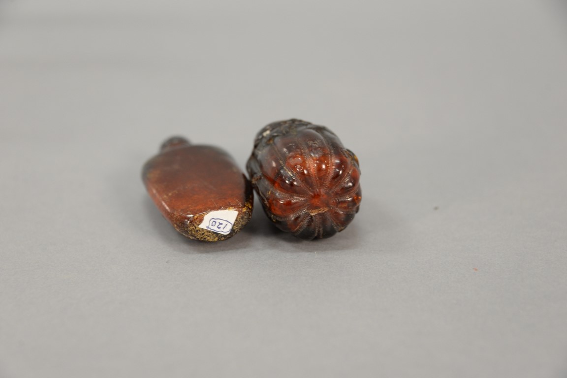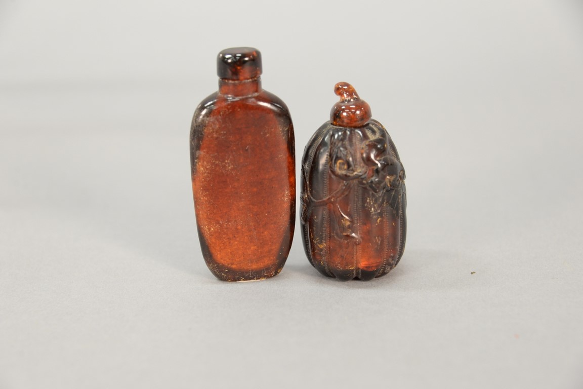 Two large amber snuff bottles including one depicting horses with pine trees and the other in the form of a gourd. ht. 2 1/2in. to 3in.