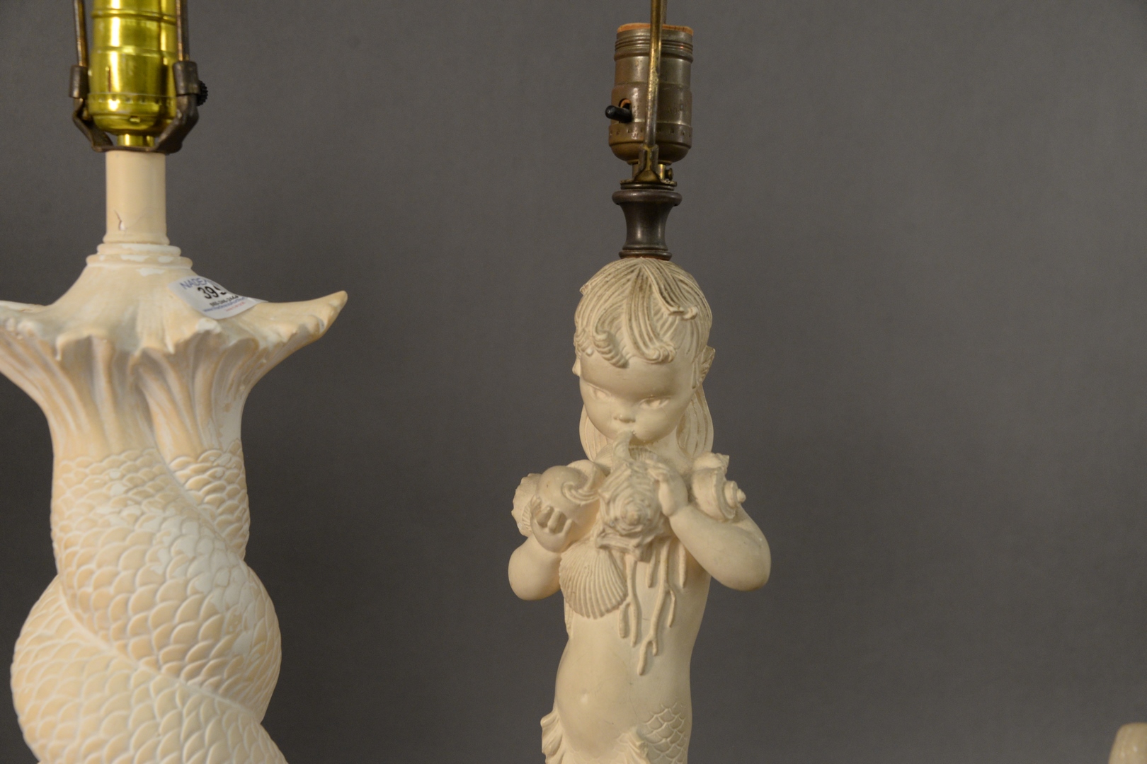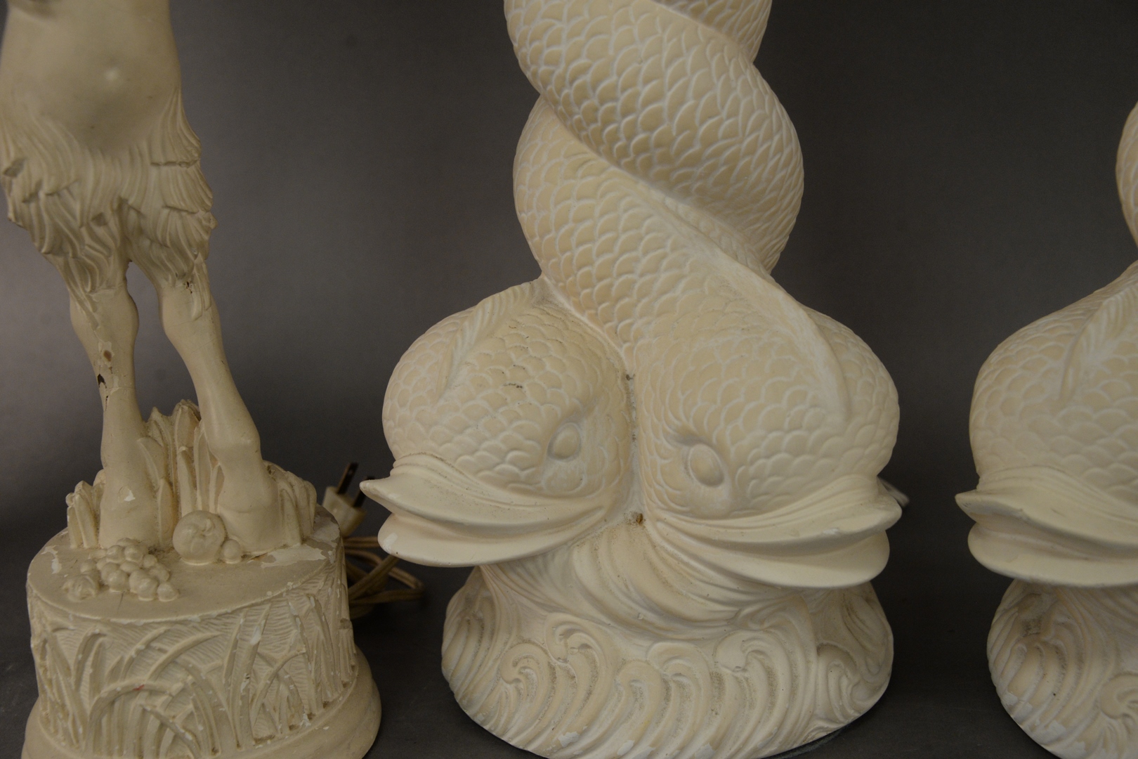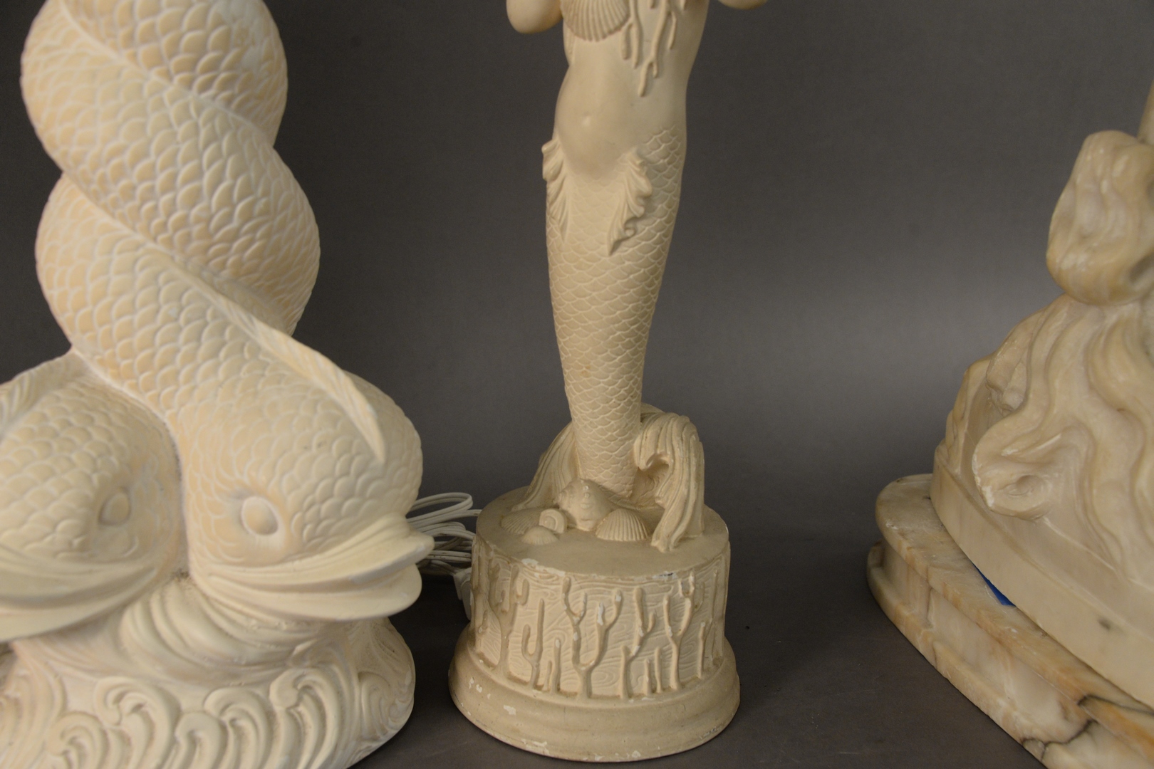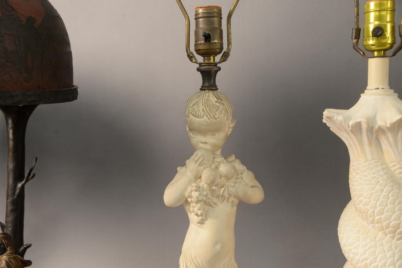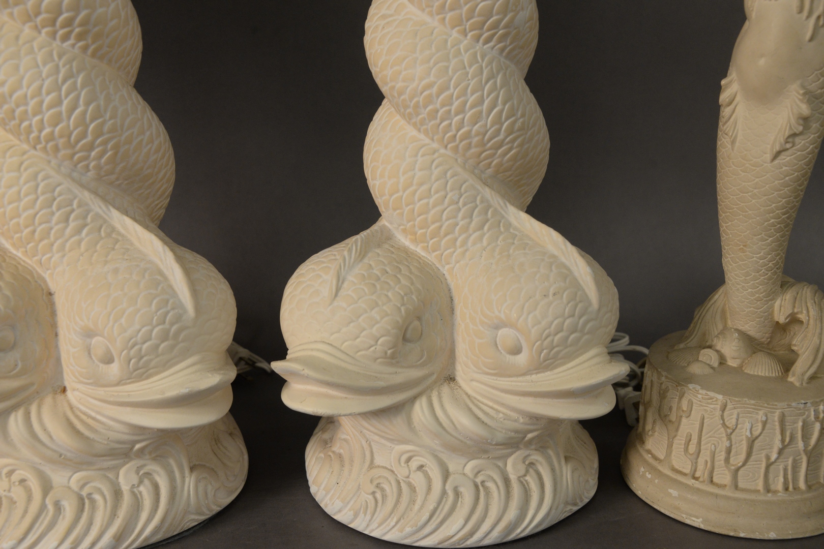 Lot 399: Two Pairs of Plaster Table Lamps, to include a pair of mermaid children form lamps, one holding shells, the other having fruit along with a pair of intertwined dolphin base table lamps, overall each height 31 inches.