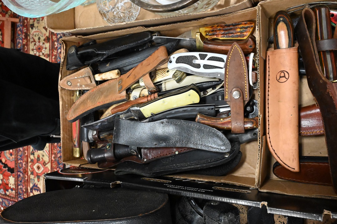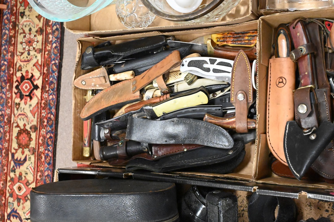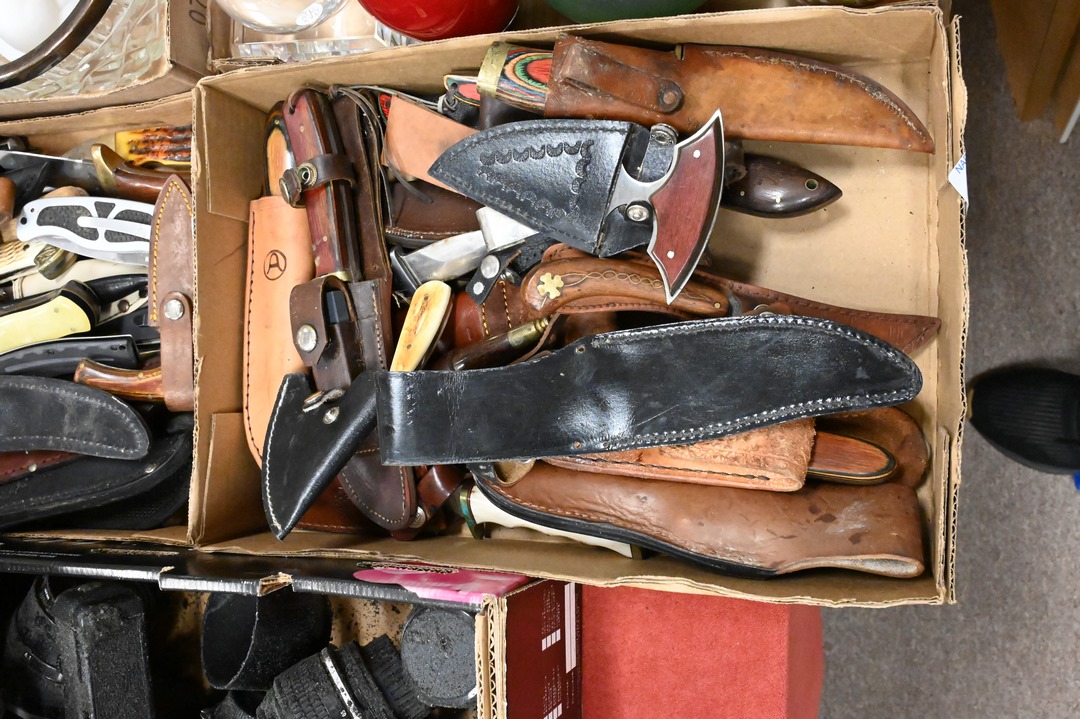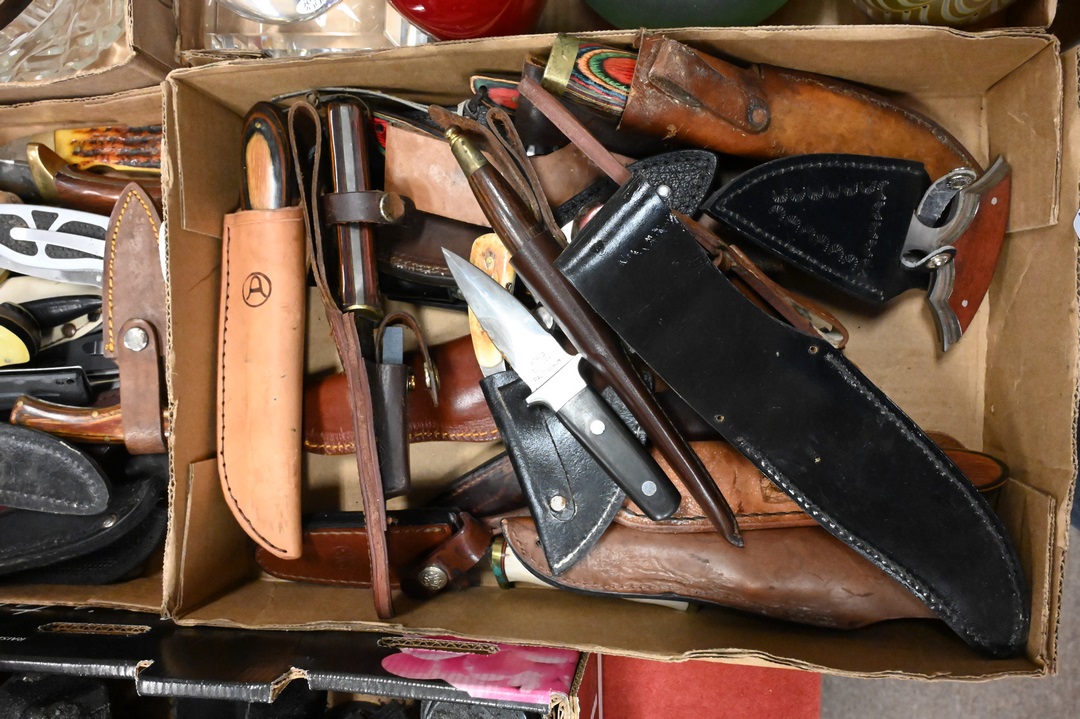 Two Tray Lots of Pocket, Buck and Straight Knives, along with leather sheaths, Provenance: Estate of Cyril H. Moore Jr, Kent, Connecticut.