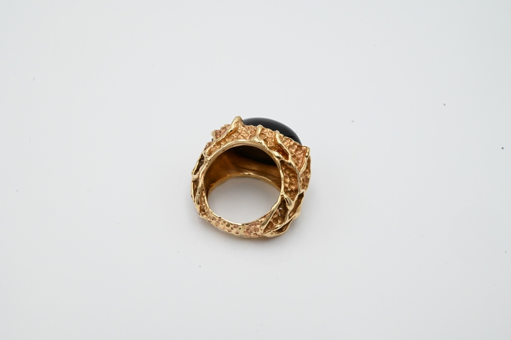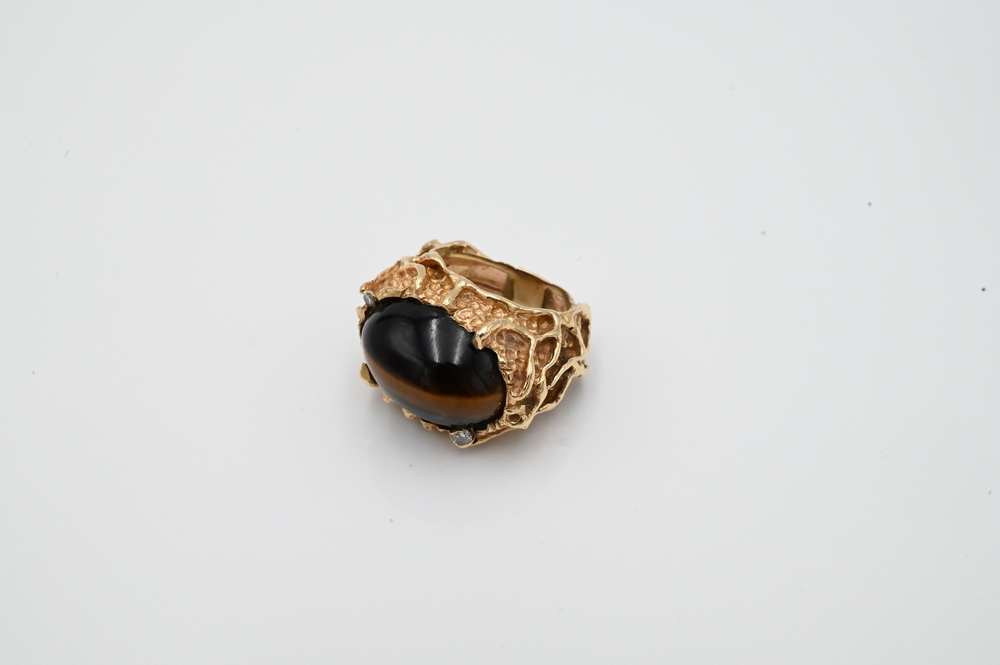 Lot 4: 14 Karat Gold Ring, set with oval cabochon tiger eye, with two small diamonds, size 6, 17.2 grams.