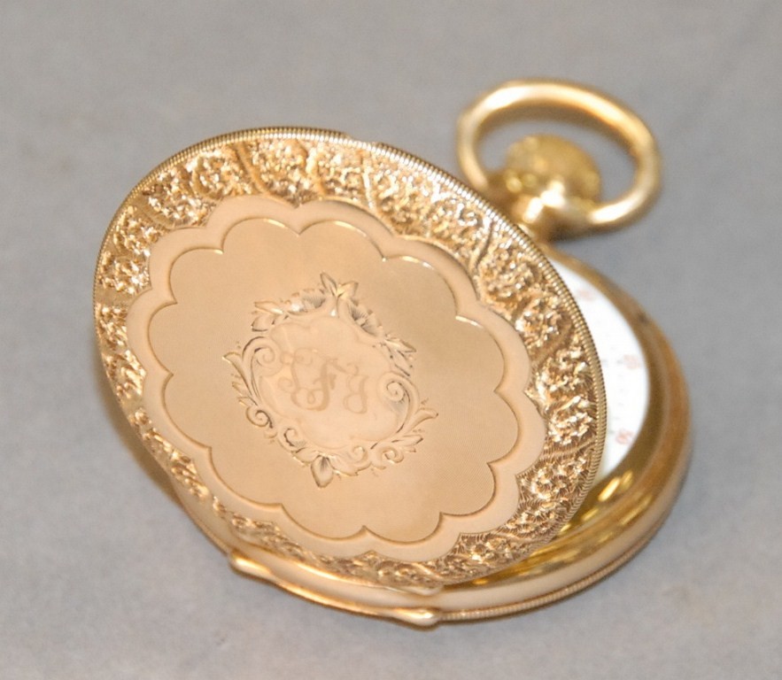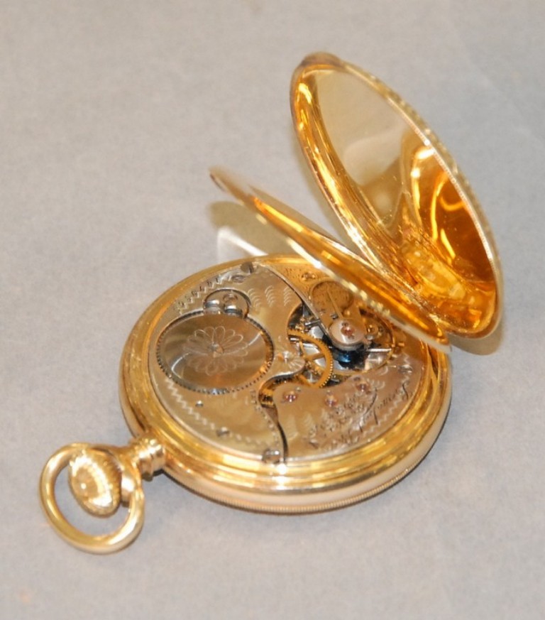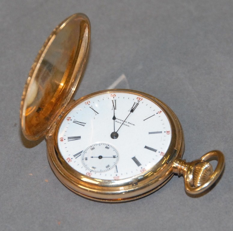 14kt gold Lambert Bros. hunting case pocket watch in crisp condition. total weight 106.6 grams