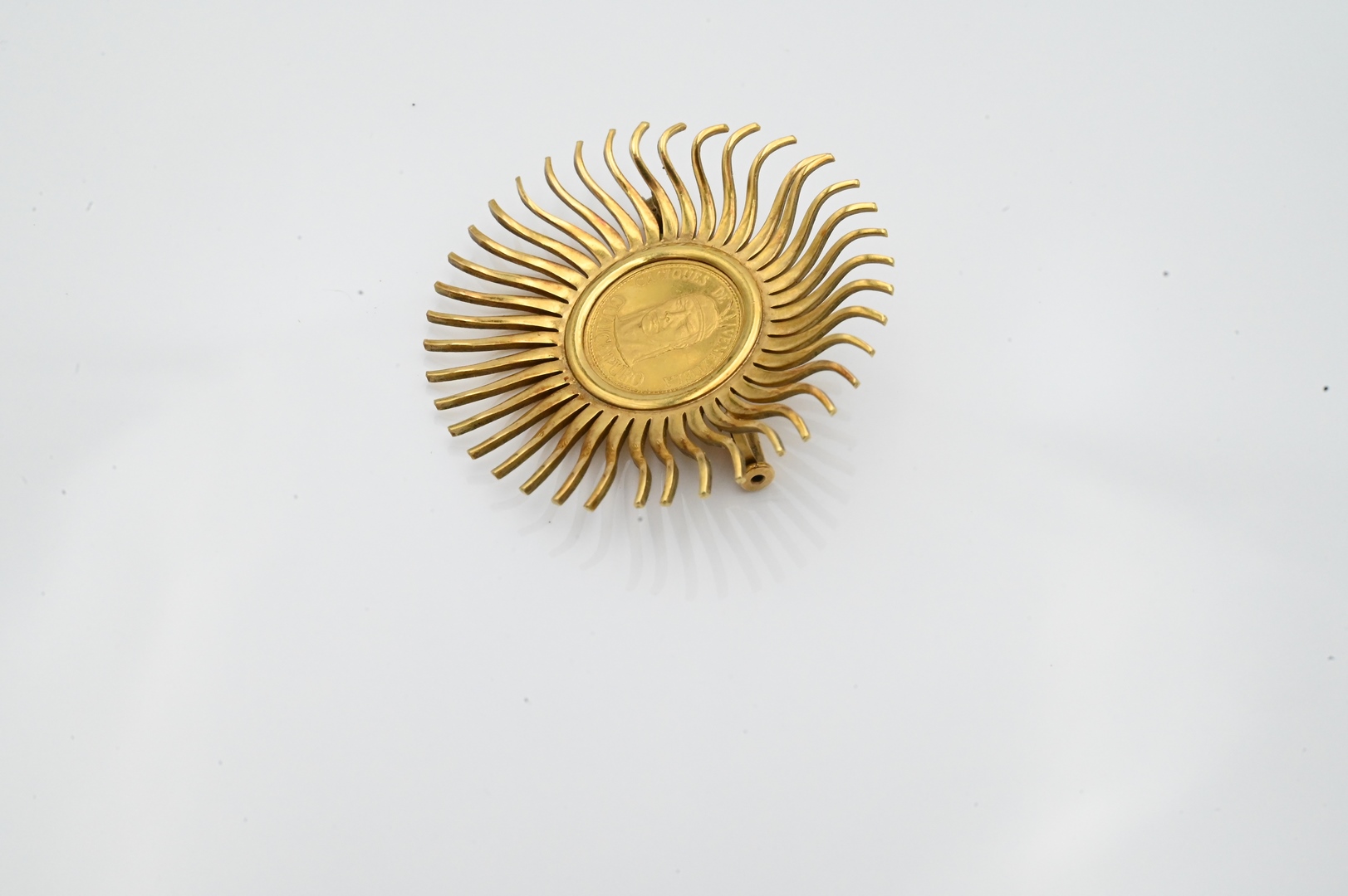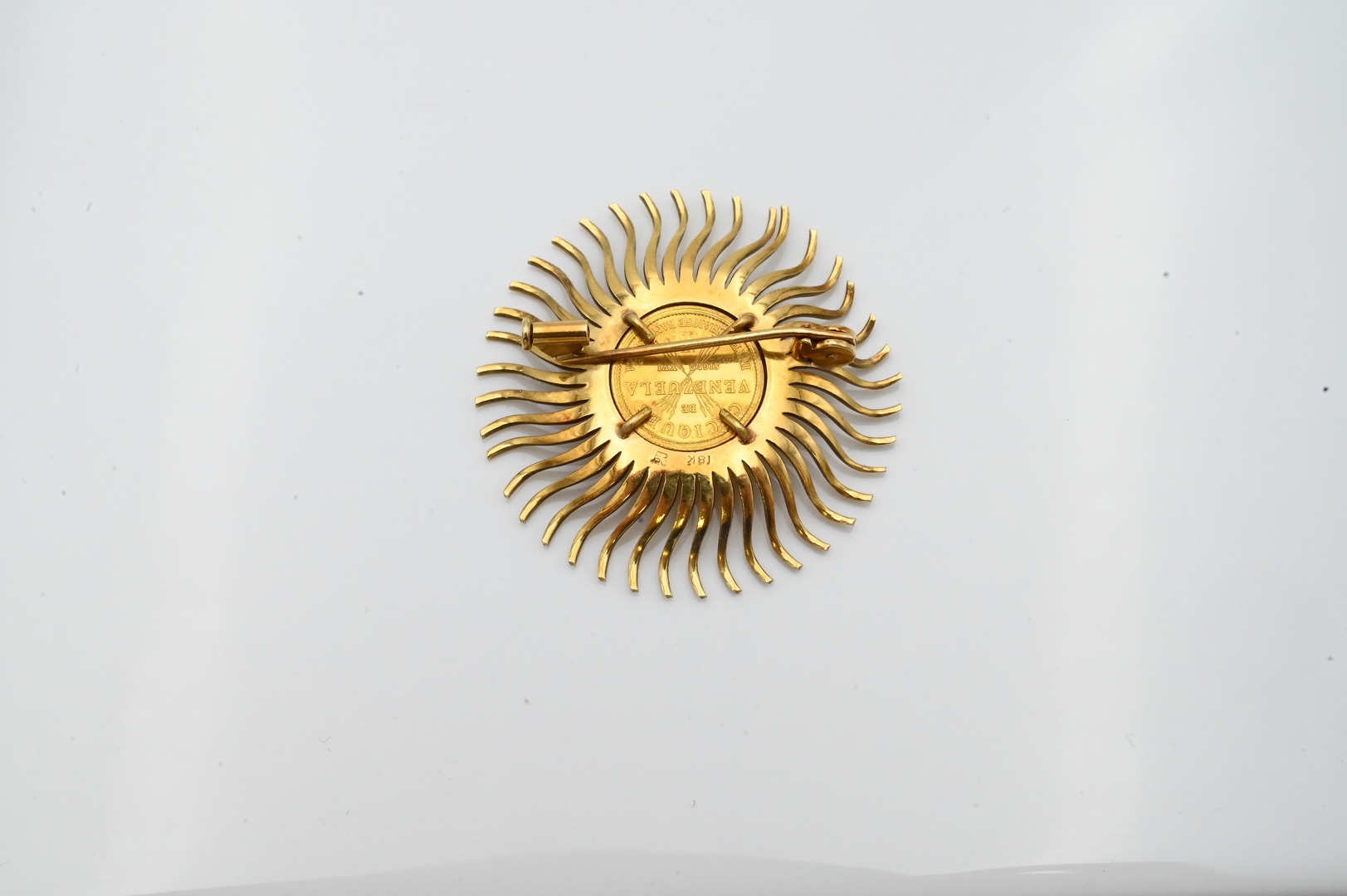 18 Karat Gold Sunburst Brooch, having Venezuelan gold coin, diameter 1 1/2 inches, 9.6 grams.