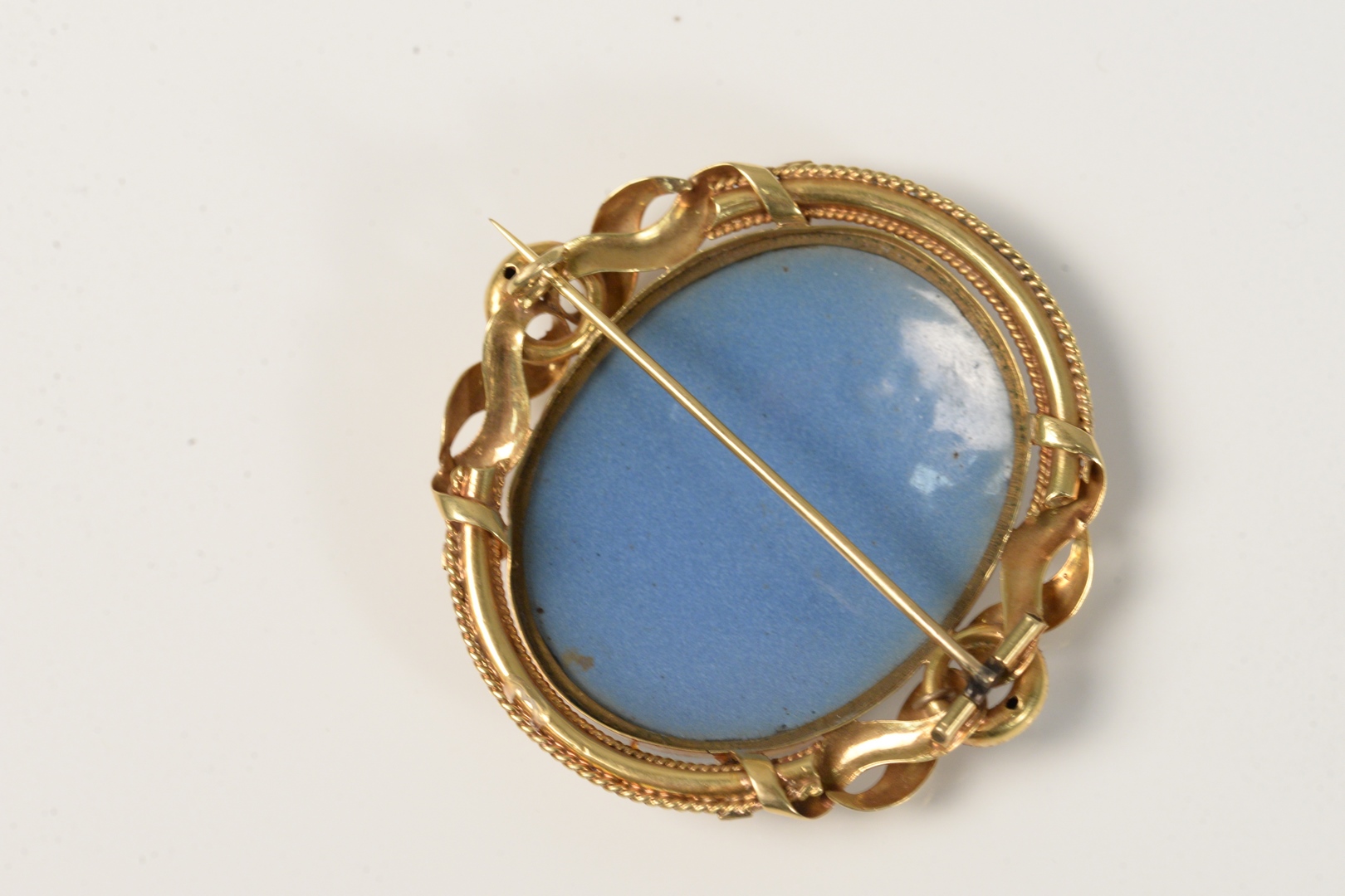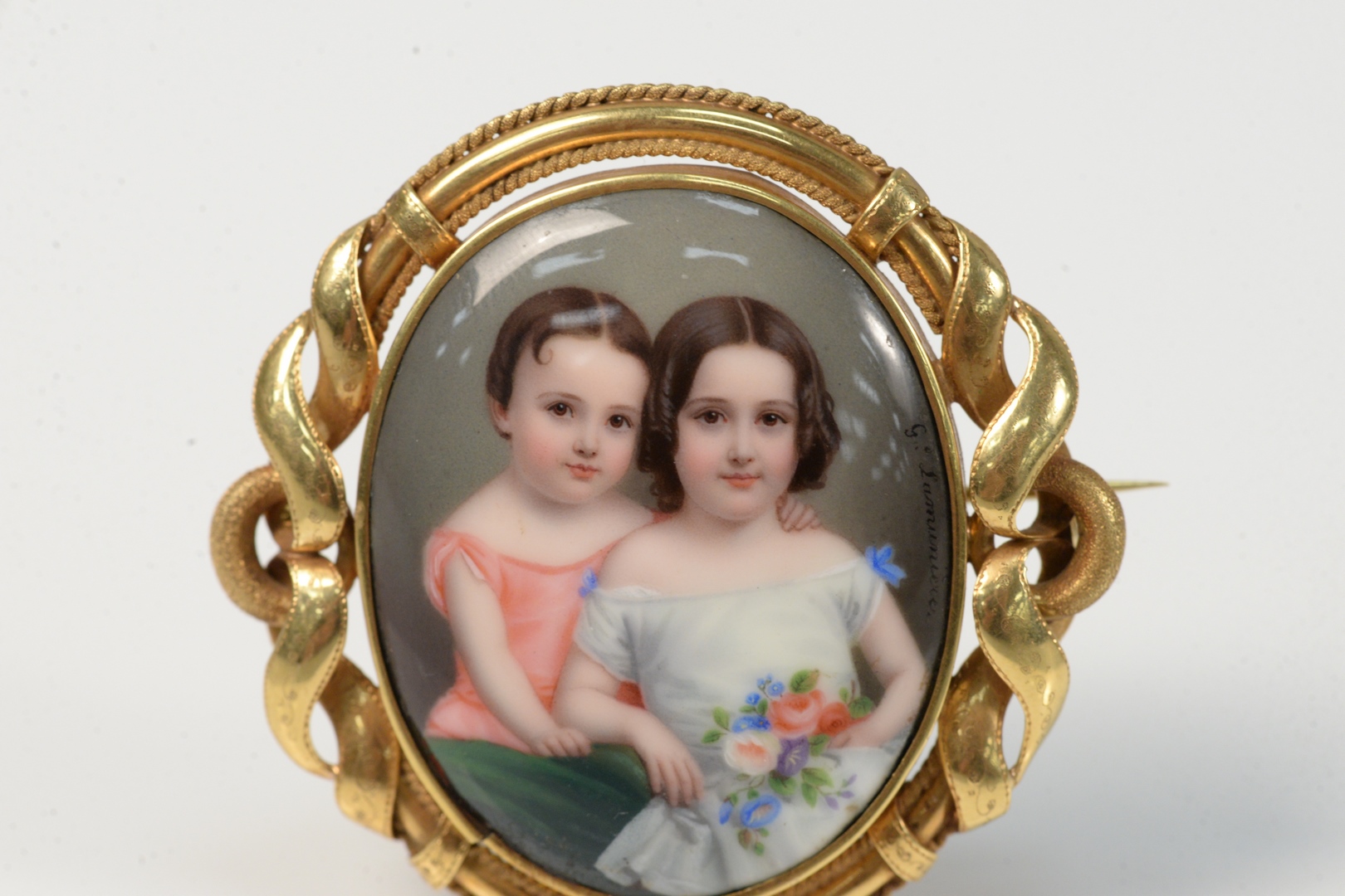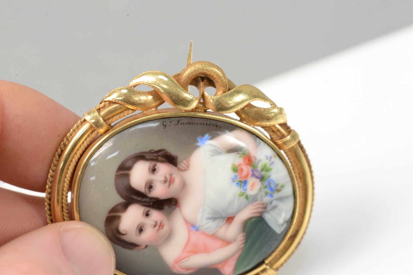 Lot 4: 18 Karat Gold Victorian Brooch set with center enamel of two children early to mid 19th century signed G. Lamuniere length 2 1/8 in…