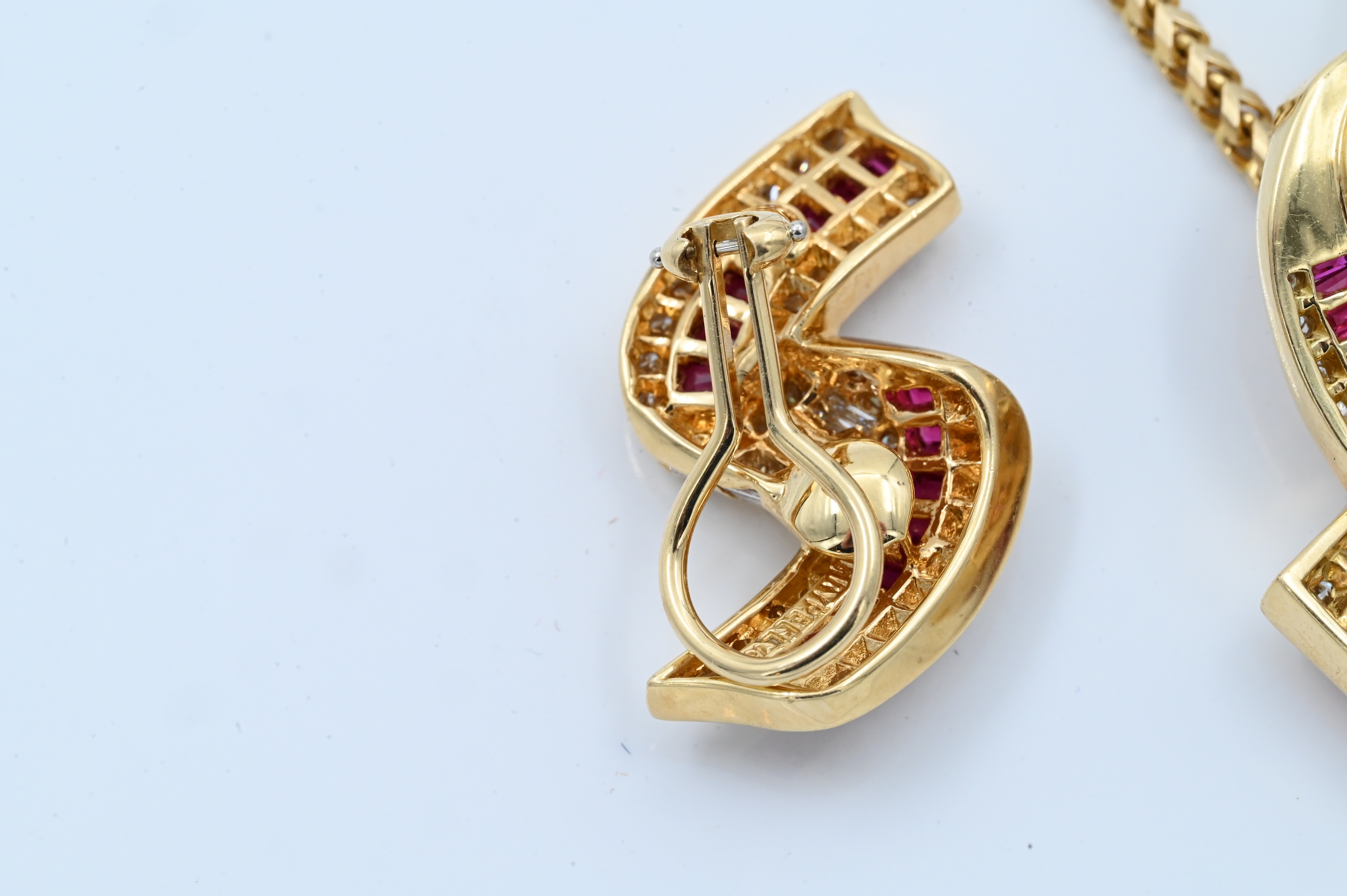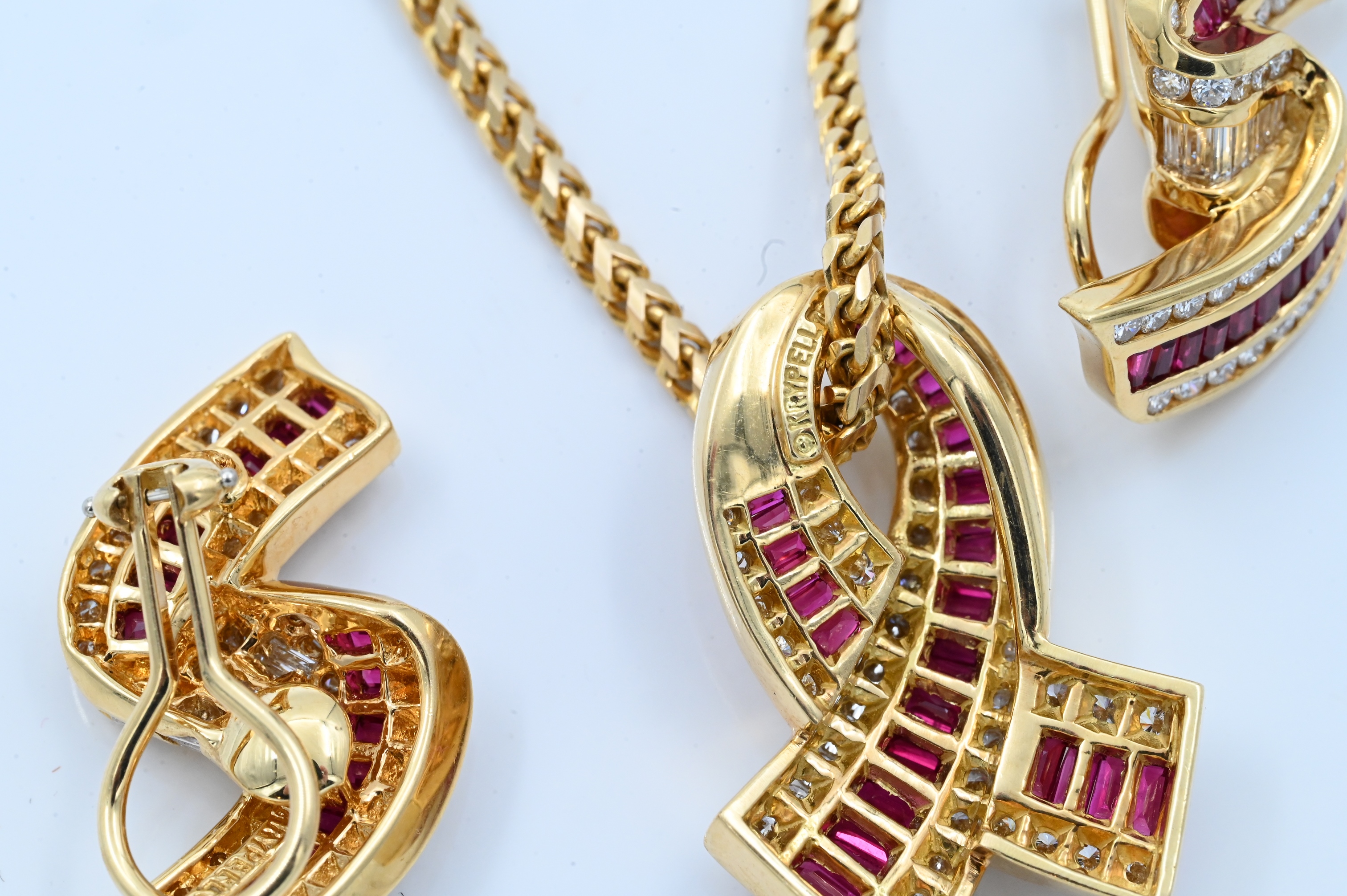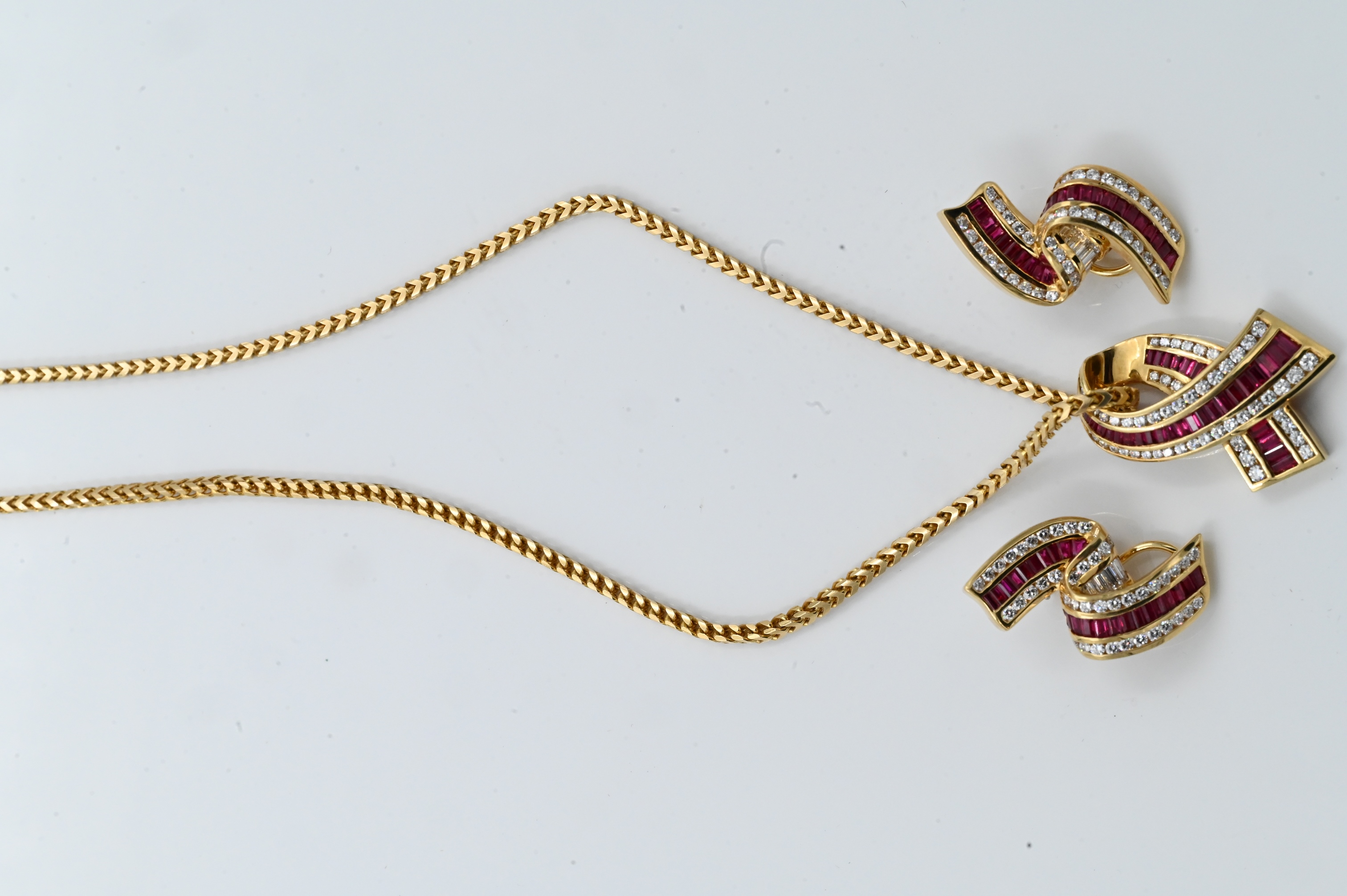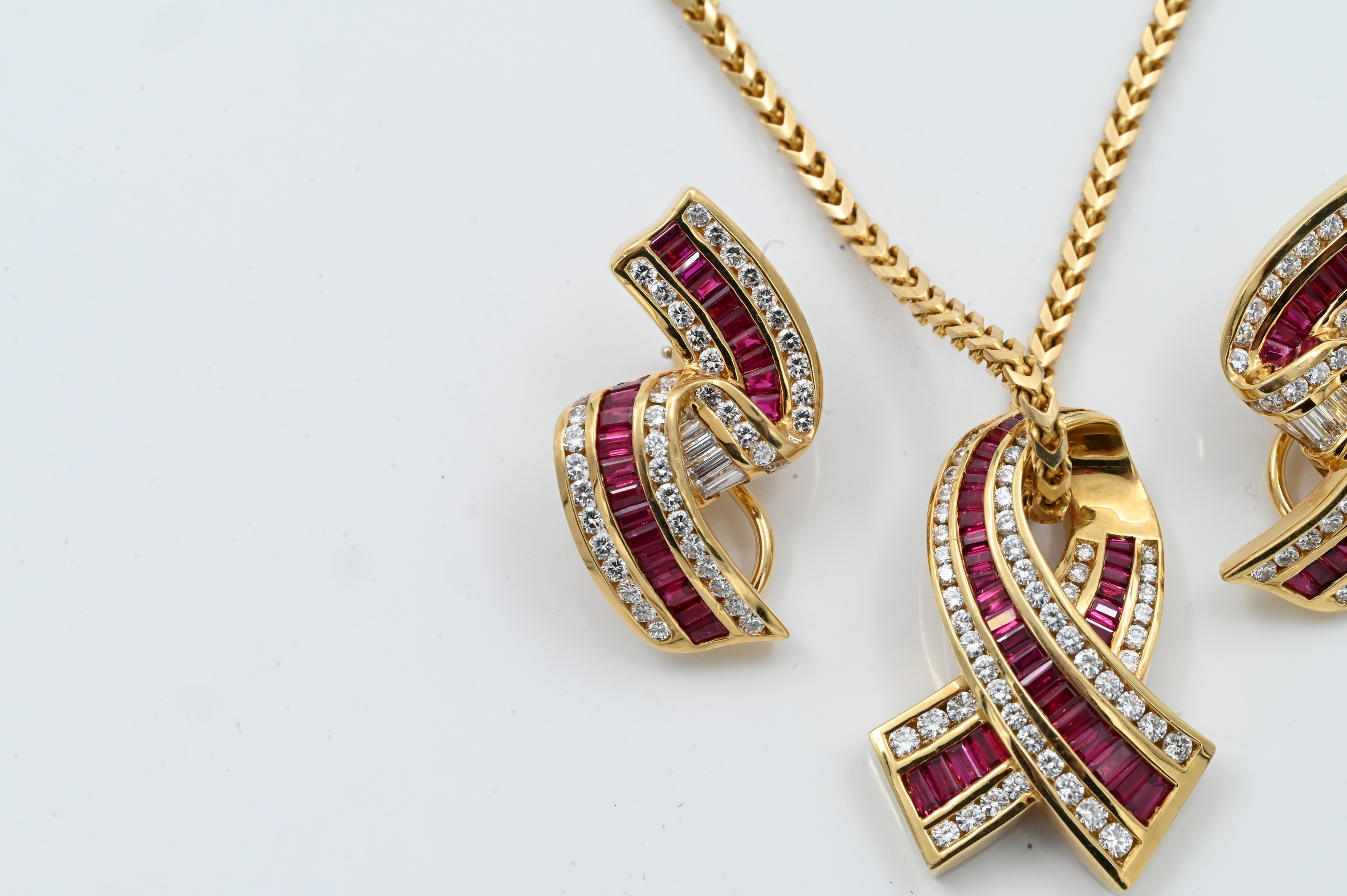 pendant set with 35 channel set baguette rubies and 57 round diamonds height 1 3/8 inches 12.1 grams, earrings each set with 23 baguette rubies, 42 round diamonds and 6 baguette diamonds