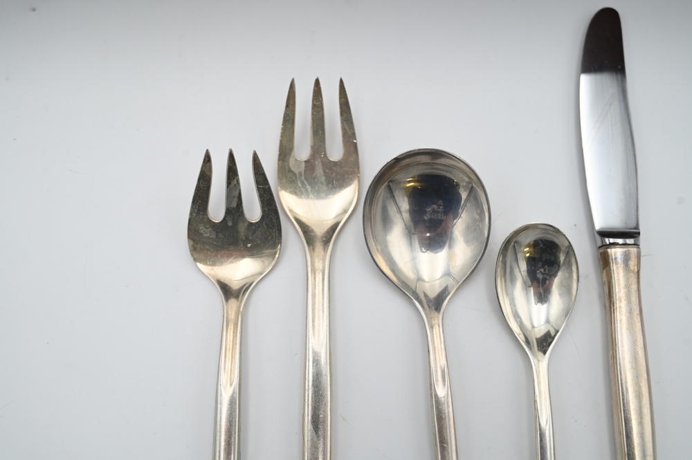 76 Piece Anton Michelsen Sterling Silver Flatware Set, in Tulip pattern, to include 12 dinner forks, 12 salad forks, 12 soup spoons, 12 tablespoons, 12 teaspoons, 2 butter knives, 1 ladle, 1 server, 12 weighted dinner knives, 95.8 weighable t.oz. plus 12 handles.