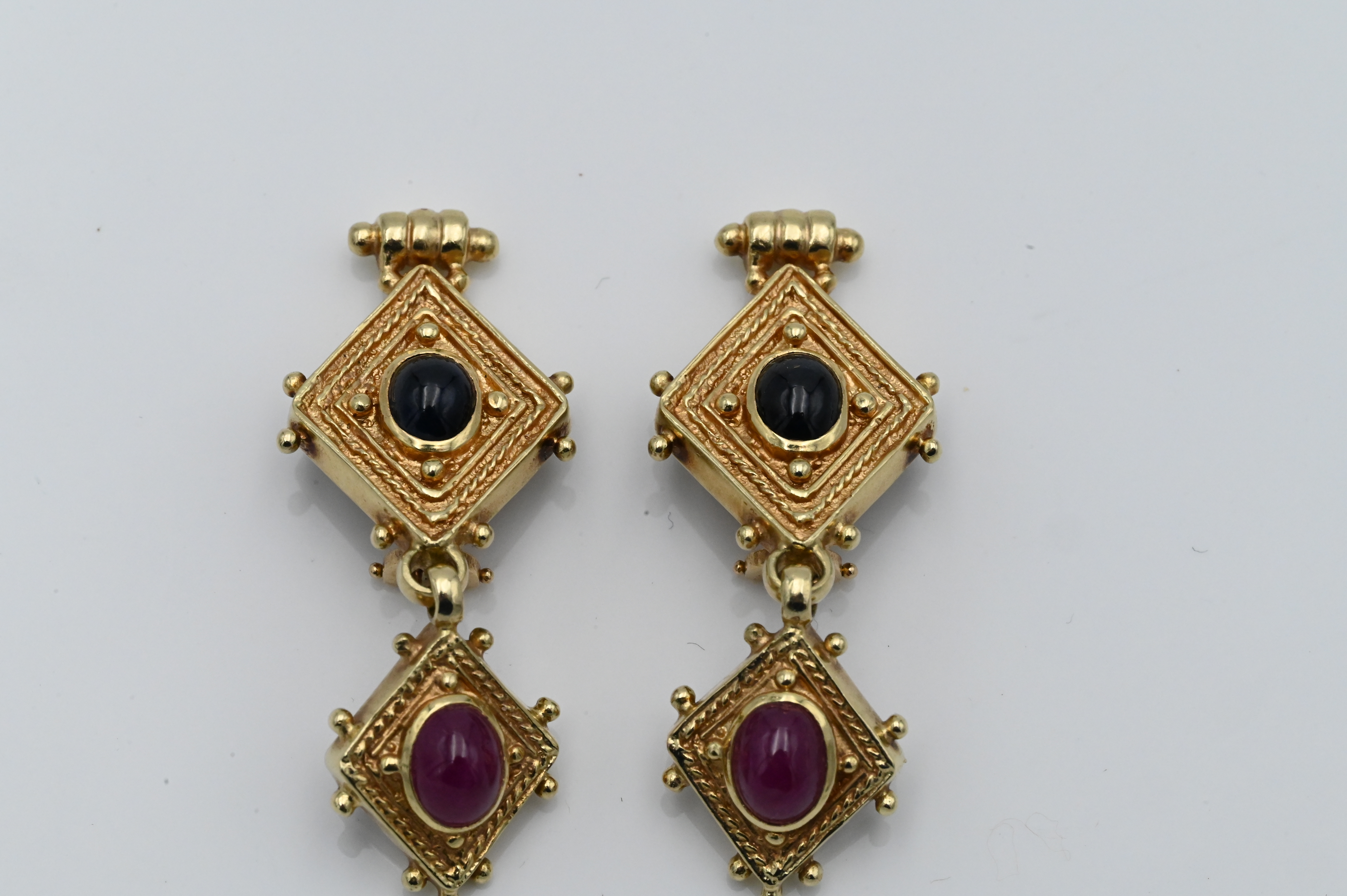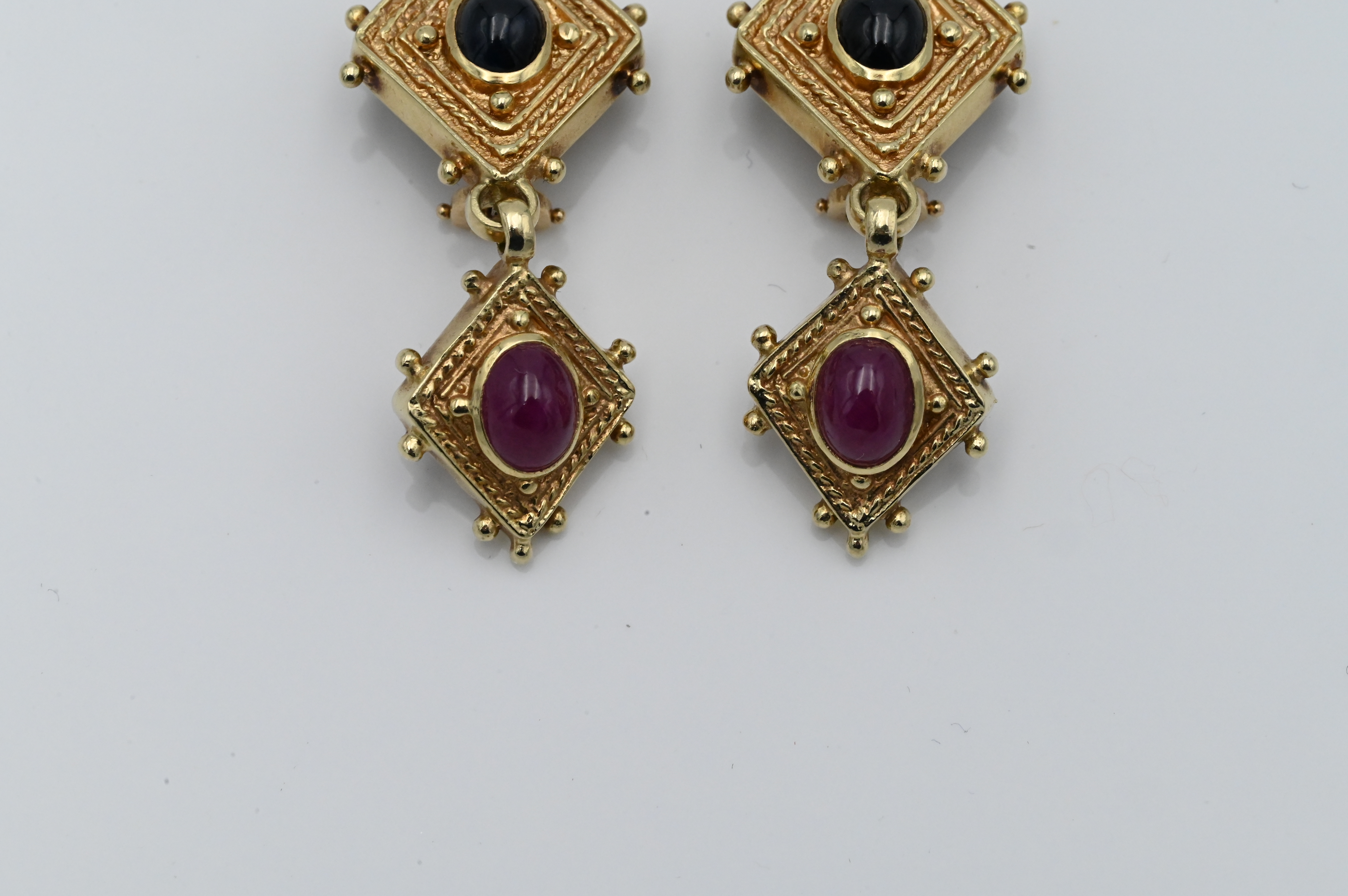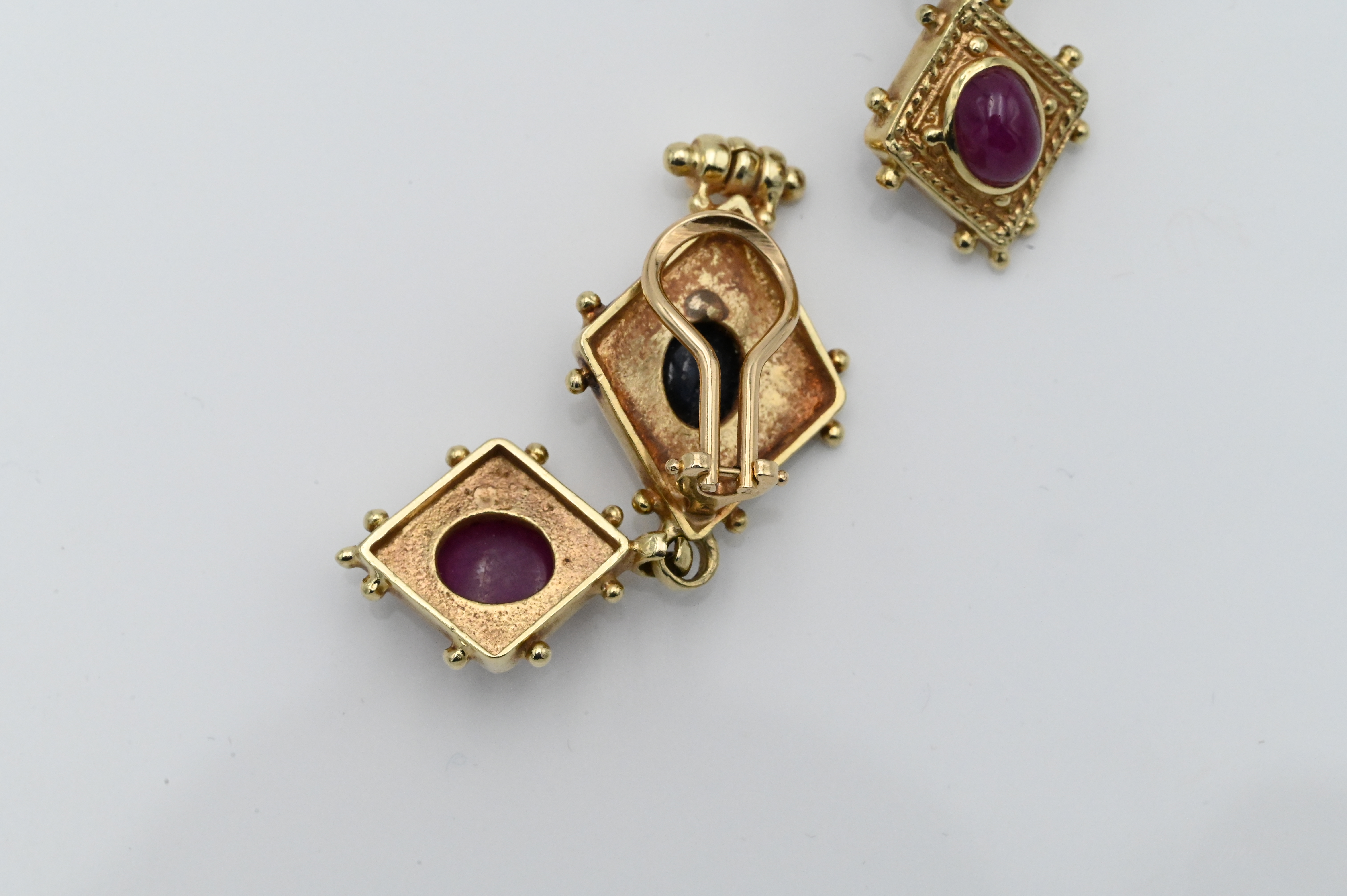 A Pair of 14 Karat Yellow Gold Ear Clips, each having two parts, mounted with oval cabochon cut stone, 19 grams.