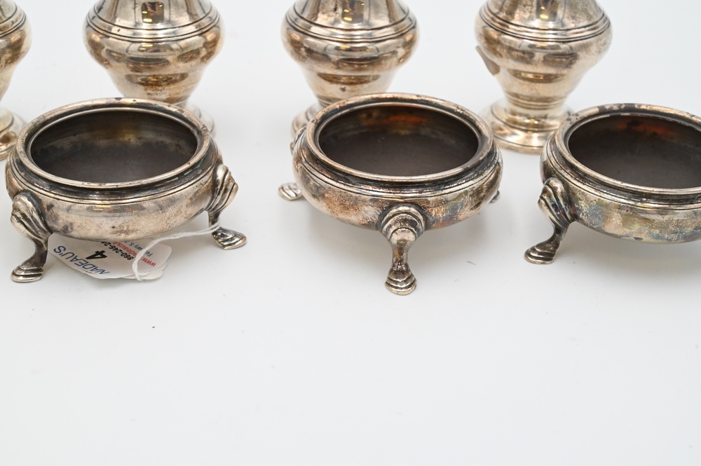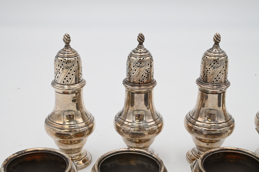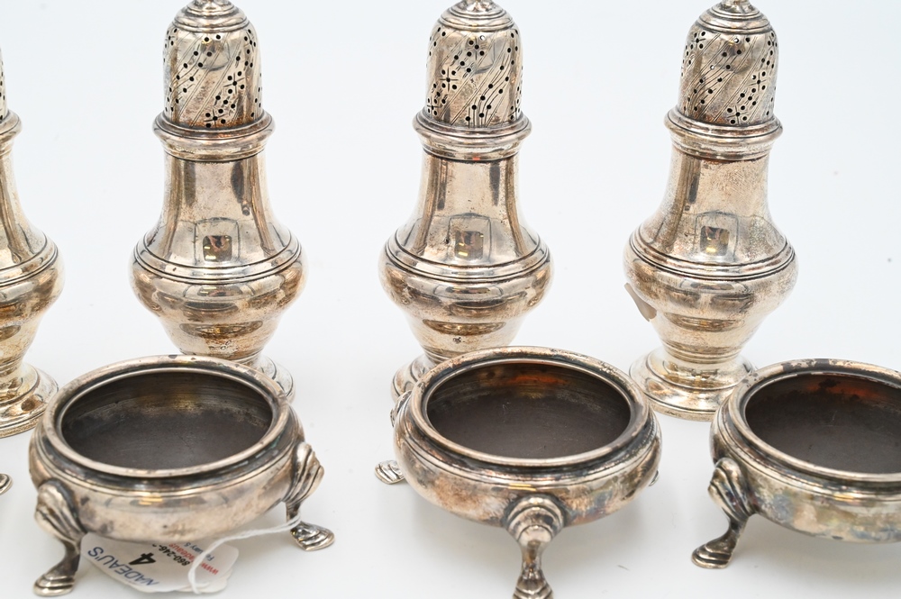 Eight Piece Tiffany Sterling Silver Lot, to include four open salts and four pepper shakers, in form of English 18th century silver, 24 t.oz.
