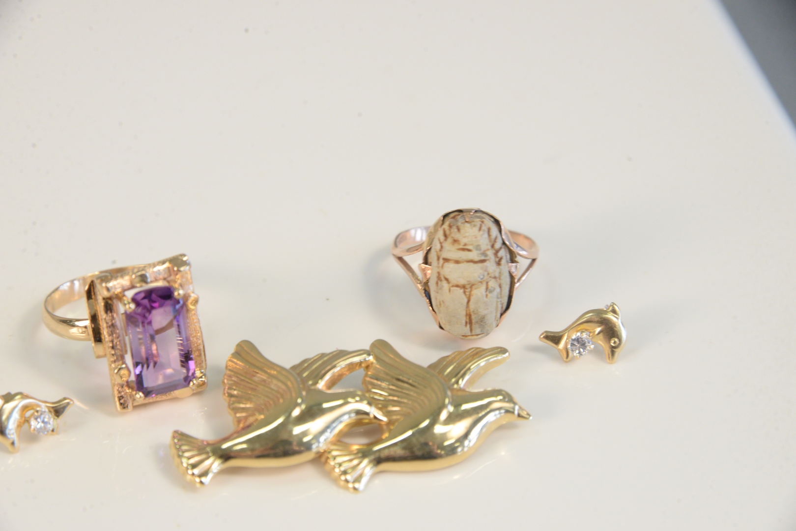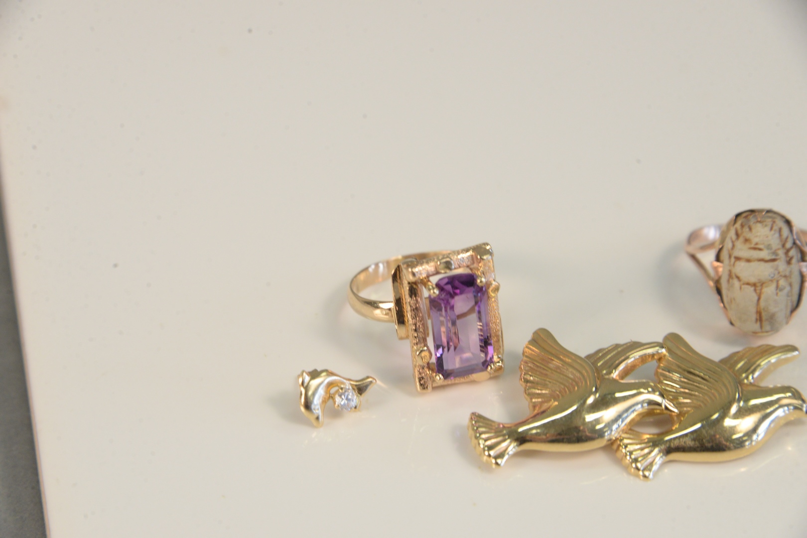 Lot 4: Four Piece Gold Lot to include amethyst ring, scarab ring, bird brooch, and dolphin earrings 13 grams total weight