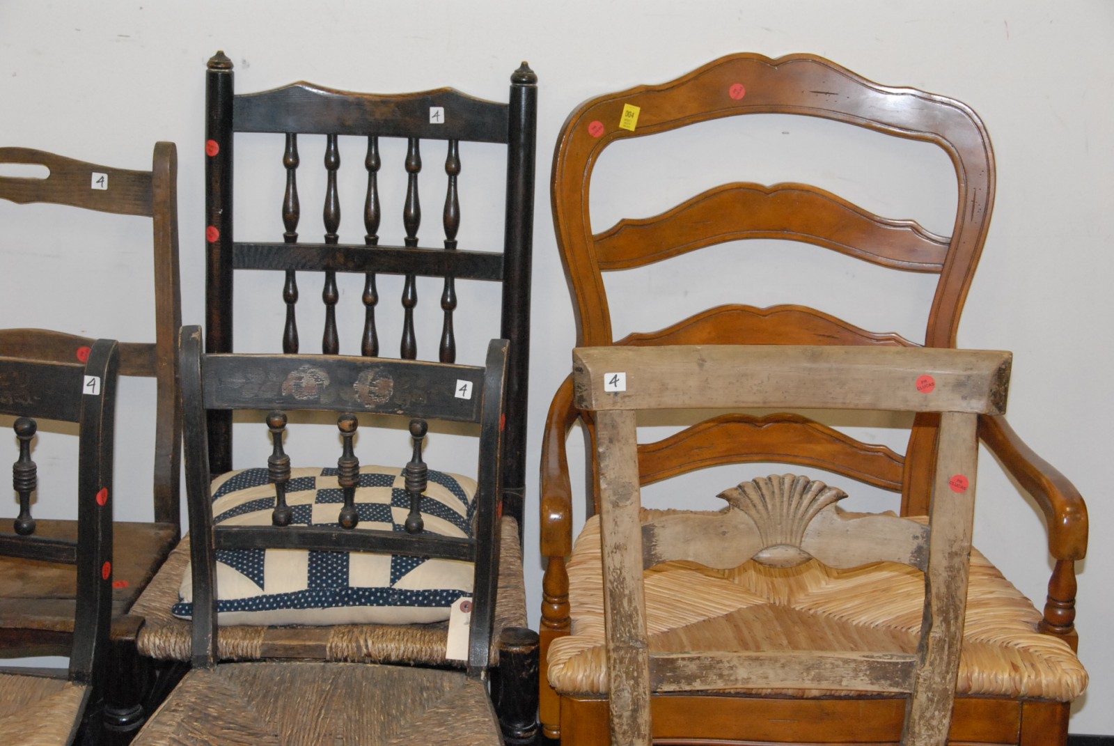 Group lot of chairs, 6 chairs plus 2 stools with rush seats