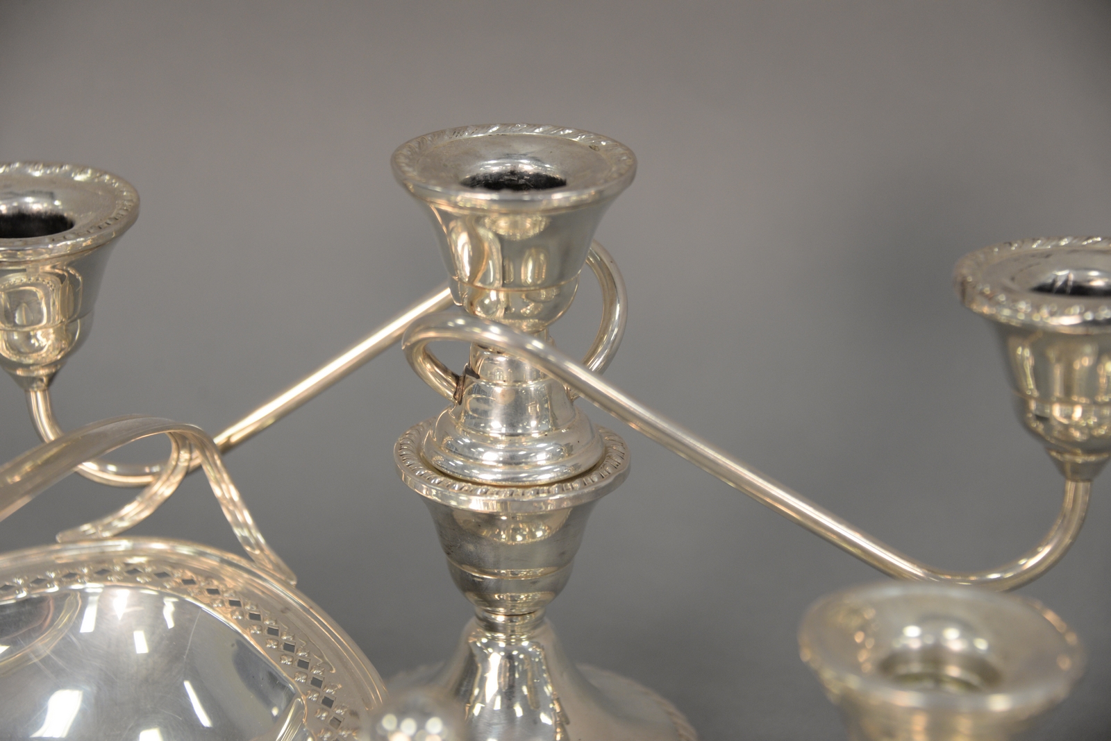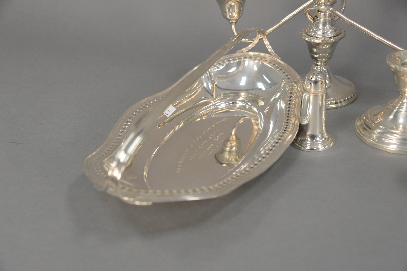 Lot 4: Group of sterling silver to include two oval trays, pair of weighted candelabras, four candlesticks, and a salt and pepper. handled …