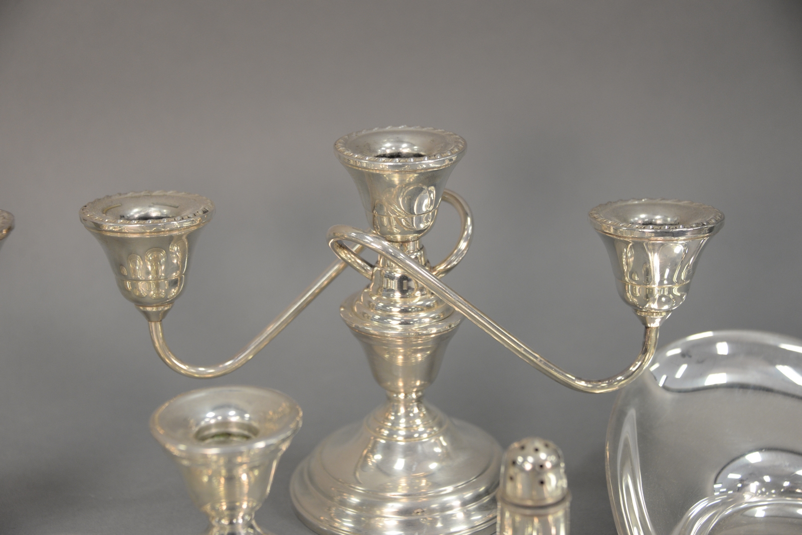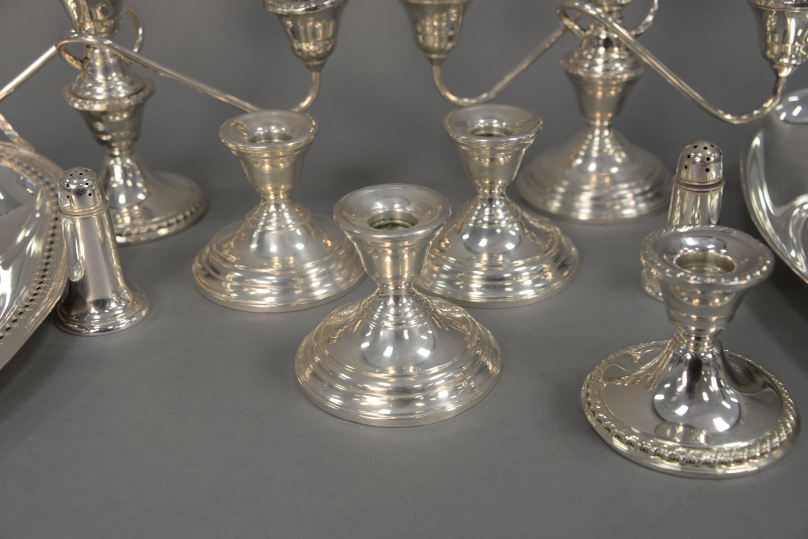 Group of sterling silver to include two oval trays, pair of weighted candelabras, four candlesticks, and a salt and pepper. handled tray: 12in., 20.2 weighable t oz.
