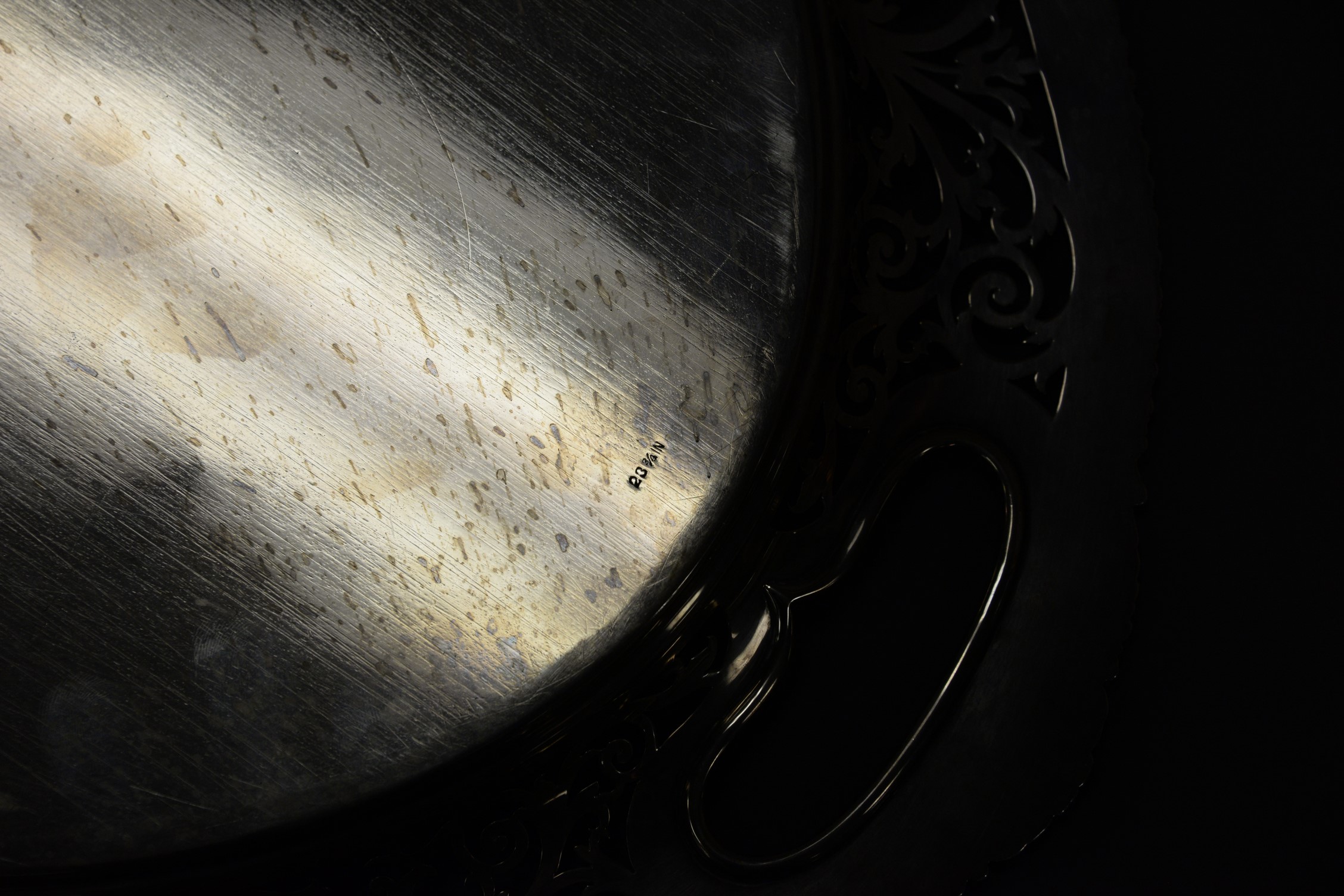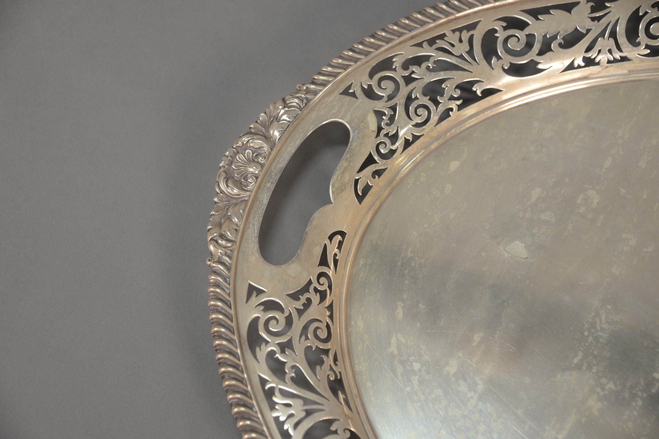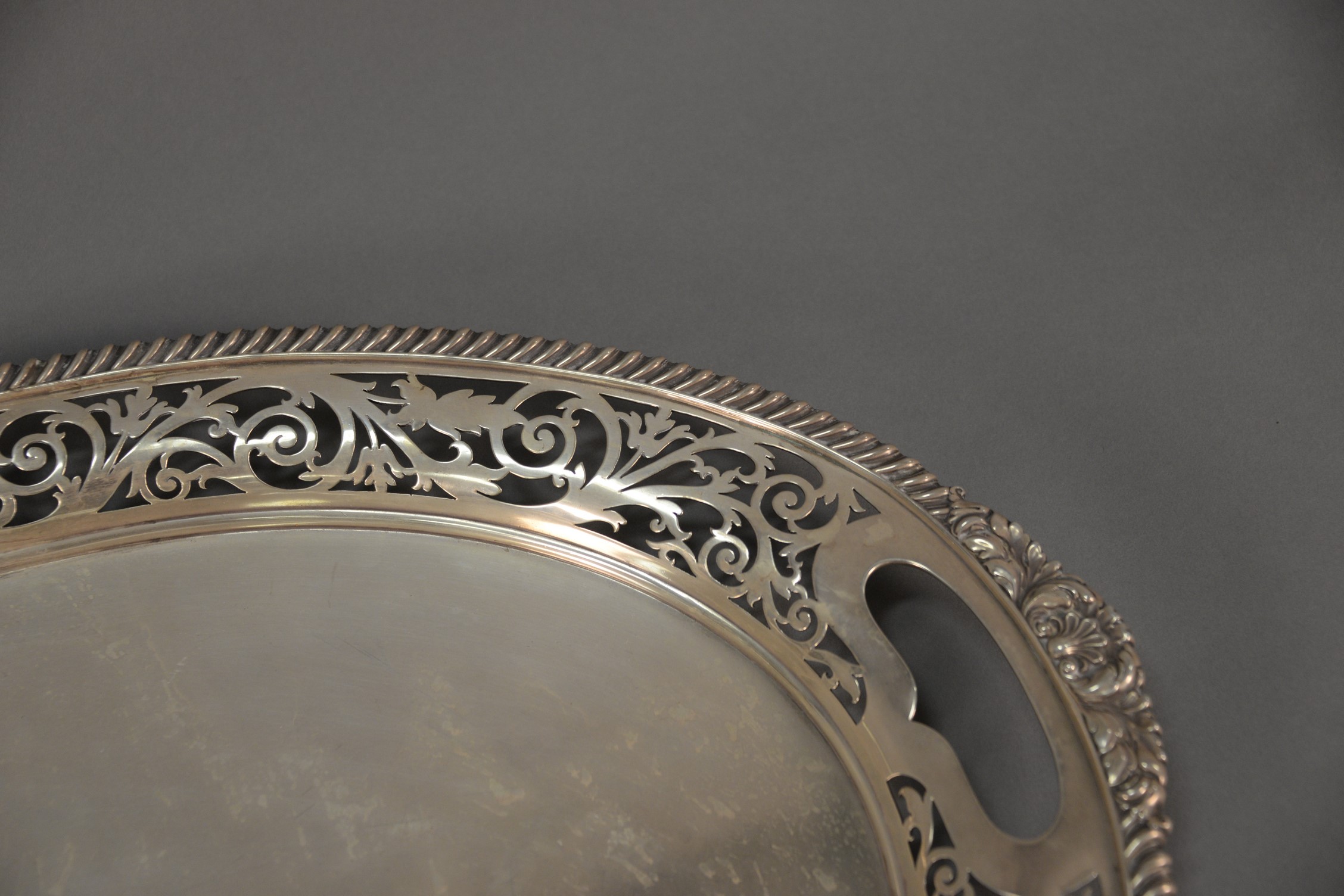 Lot 4: Large sterling silver oval tray having reticulated rim and handles, monogrammed in the center. lg. 23 3/4 in. 80.8 t oz.
