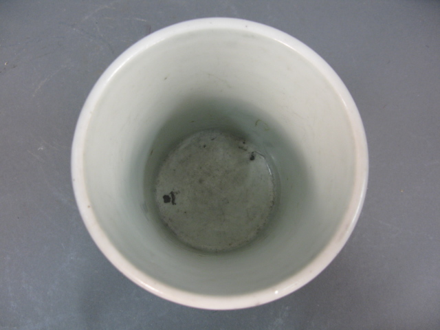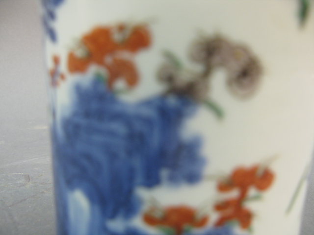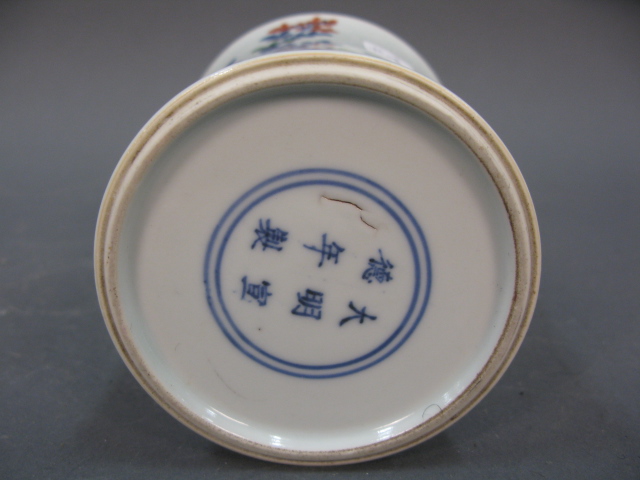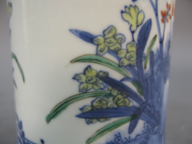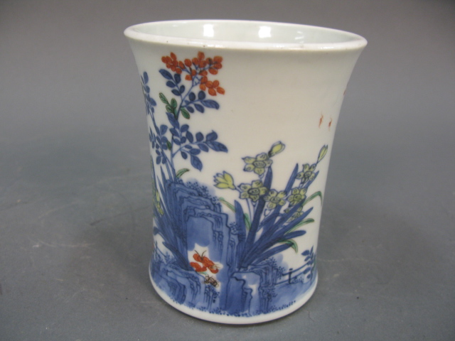 Oriental porcelain brush pot having painted trees six character on bottom.