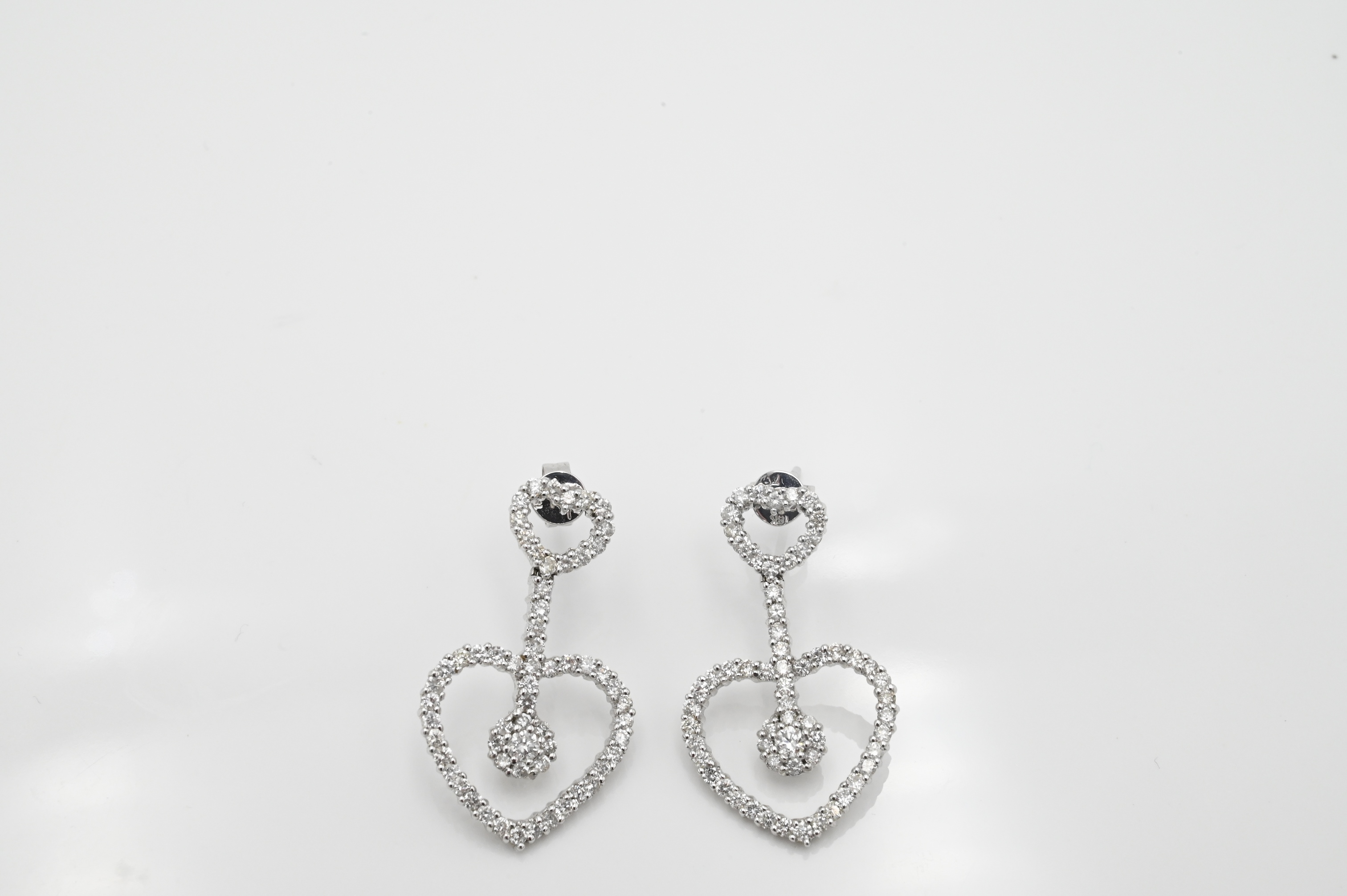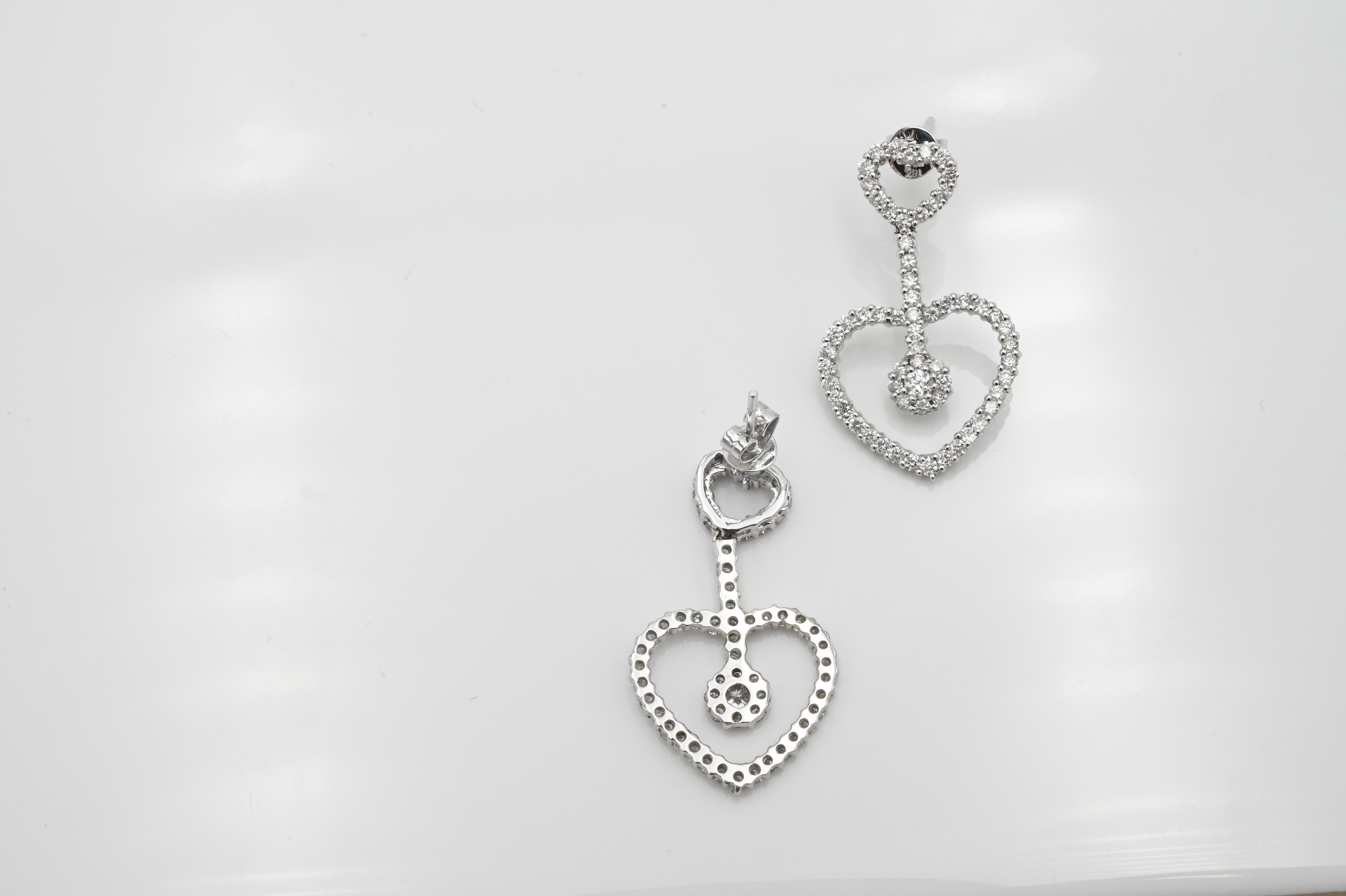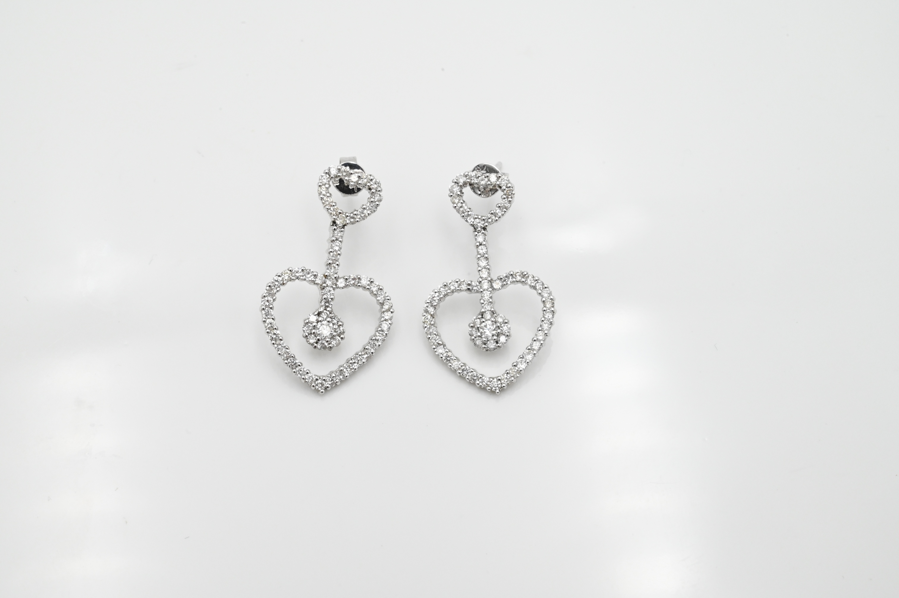 Pair of 18 Karat White Gold Pierced Earrings, having double hearts, set with diamonds, length 1 1/4 inches, 5.8 grams.