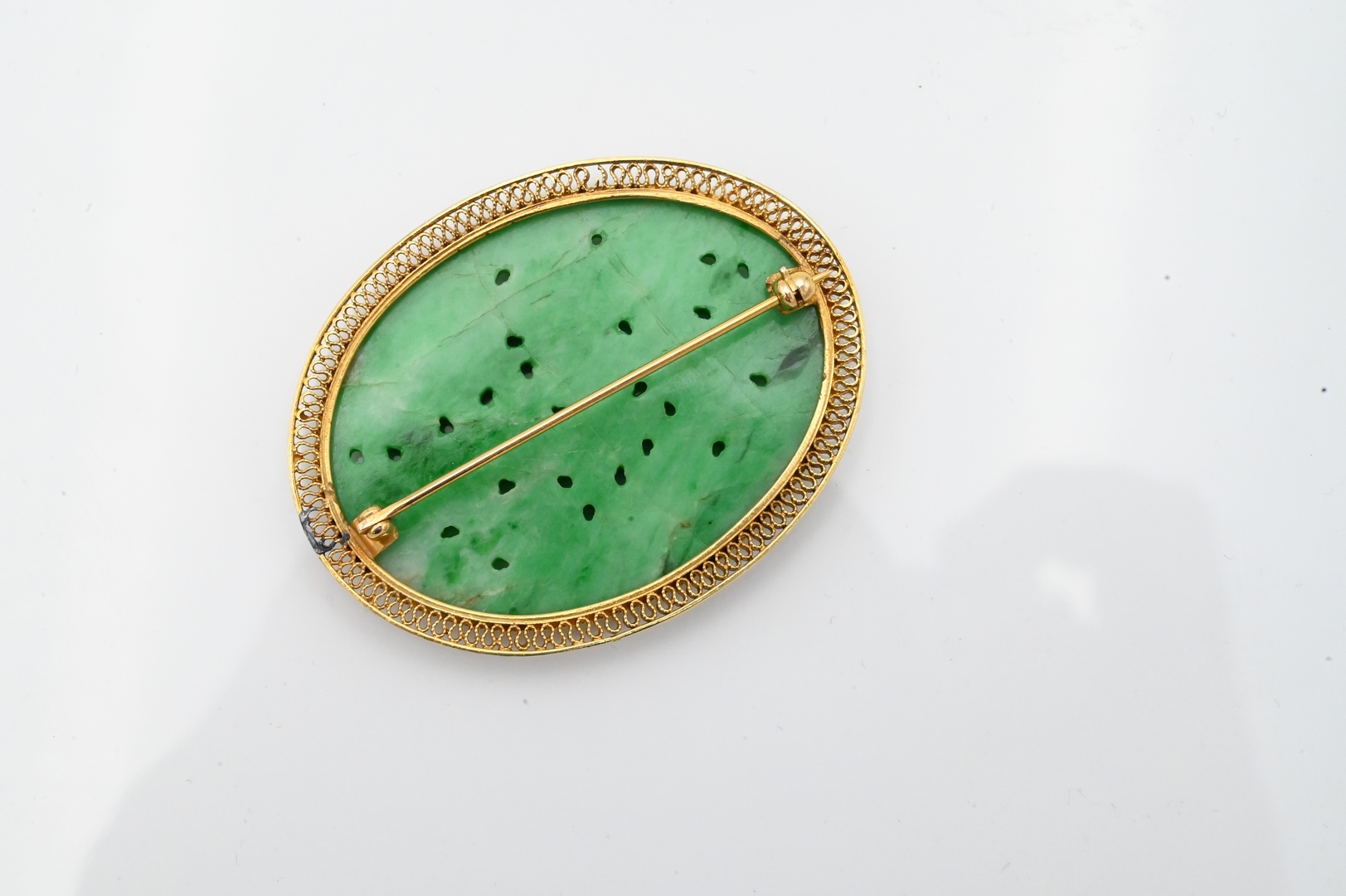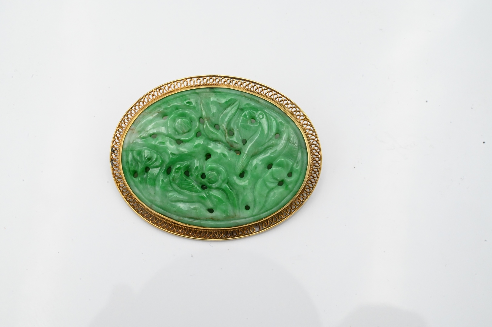 Pierced Jadeite and Gold Oval Shaped Brooch, 2″ x 1 1/4″.