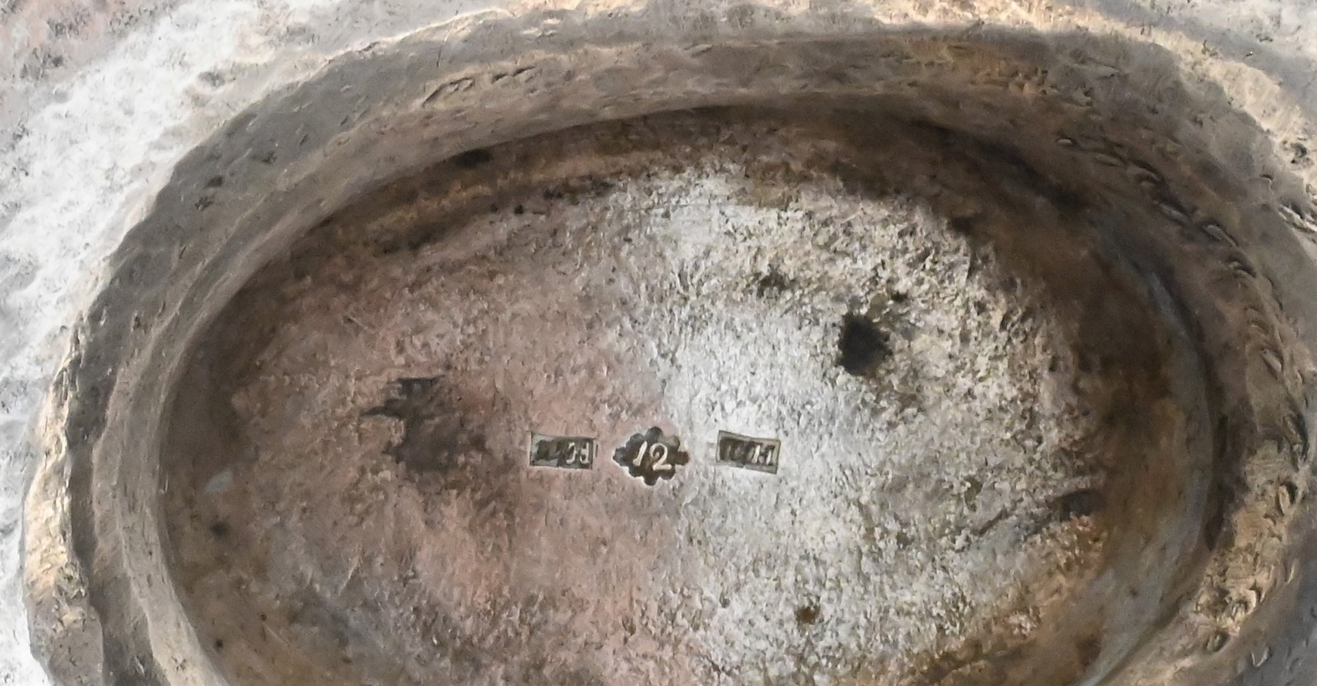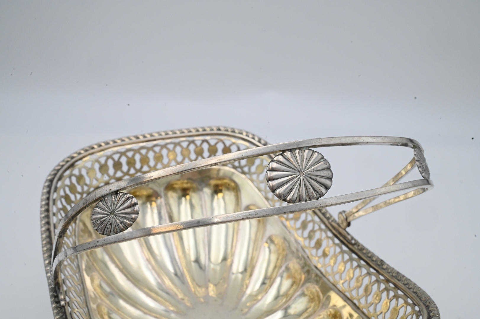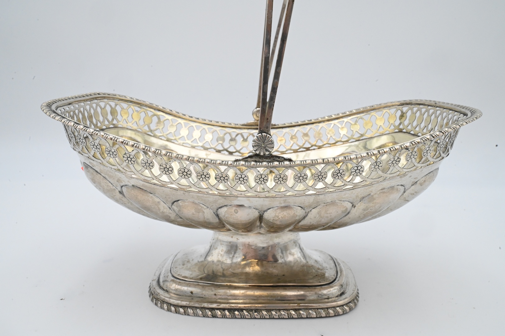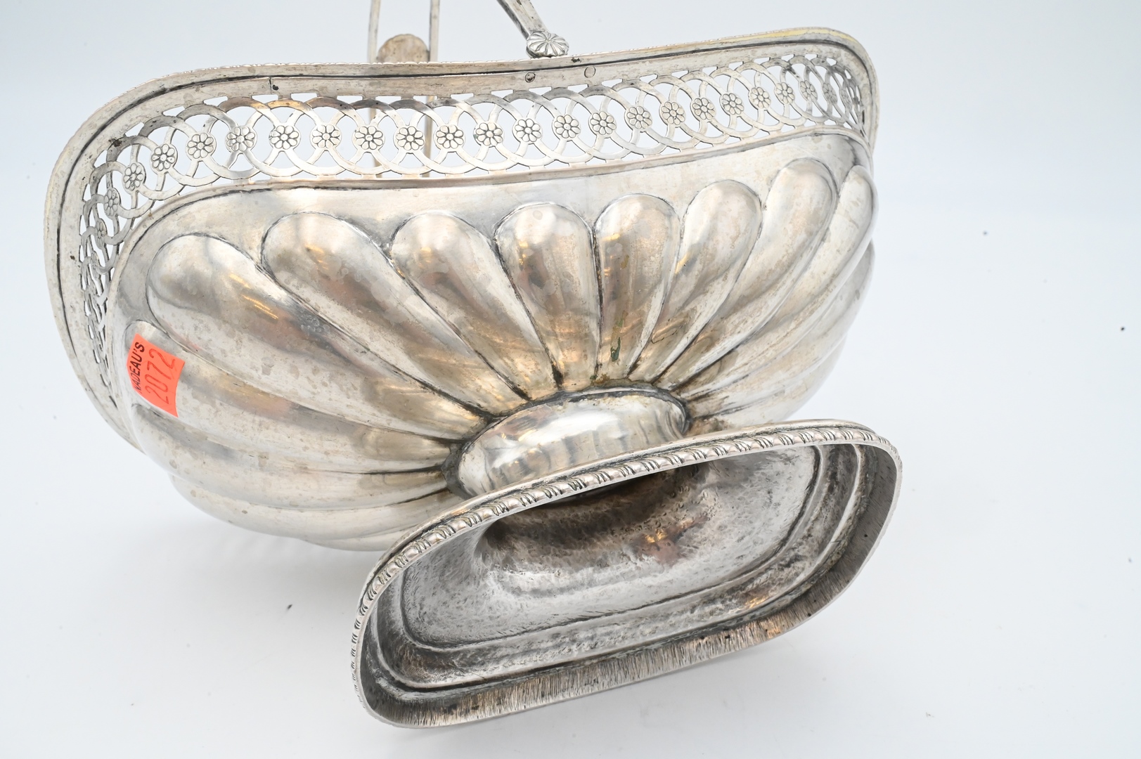 Silver Basket, having swing handle, melon shaped body, probably Austrian, marked with a “12”, height 10 1/2 inches, length 11 inches, 23.9 t.oz.