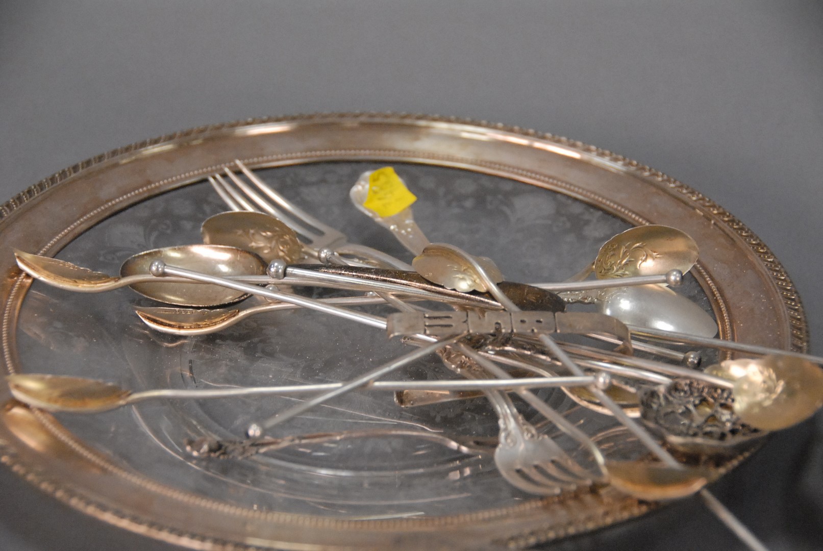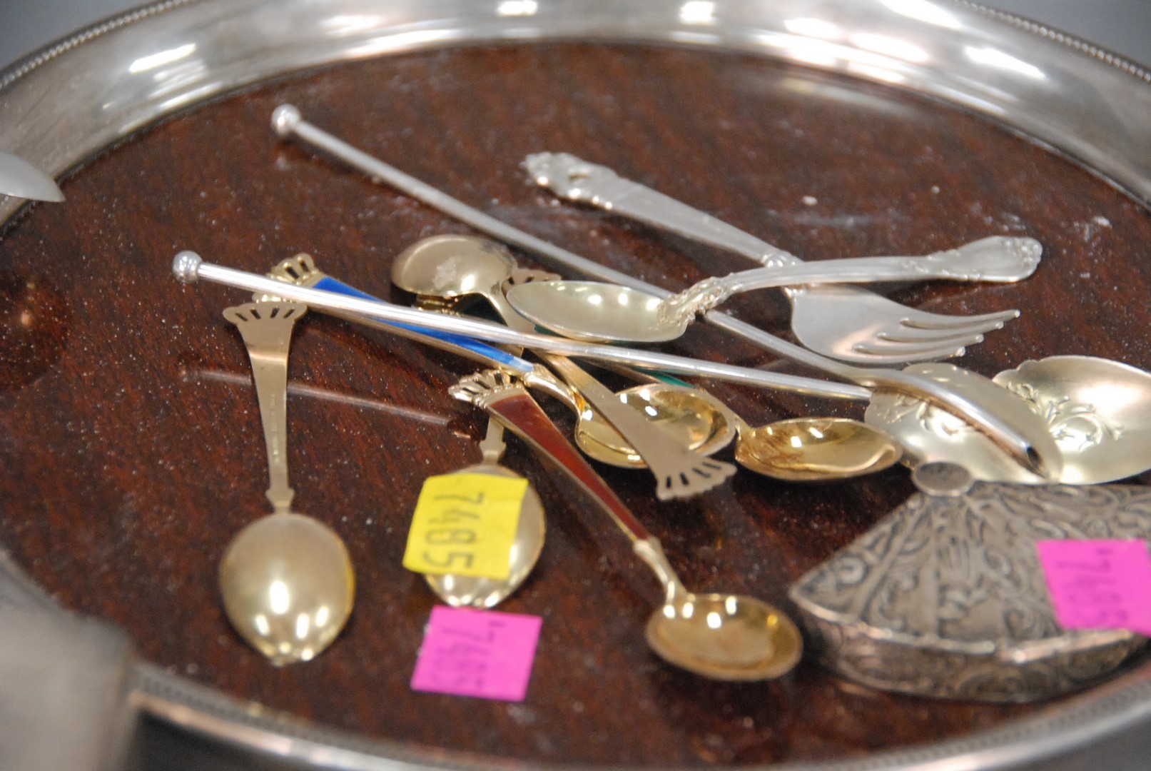 Lot 4: Sterling silver box lot including enameled spoons, ice tea spoons, fan box, sterling silver rim plates. 18 weighable t oz.