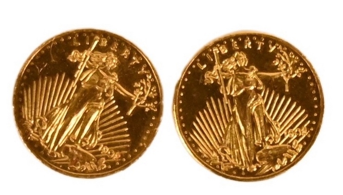 Lot 4: Two 1908 Saint Gaudens Twenty Dollar Gold Pieces, marked United States of America Twenty Dollars Liberty 1908, miniature replicas, 1.6 grams total weight.