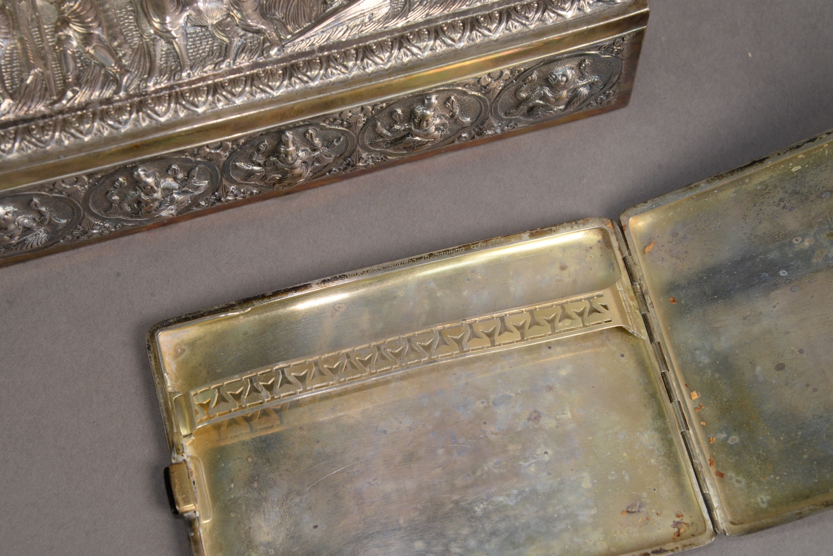 Two Silver Boxes to include a sterling cigarette case marked sterling and 18K made in France, along with a middle eastern silver embossed box, 5.5 t.oz.