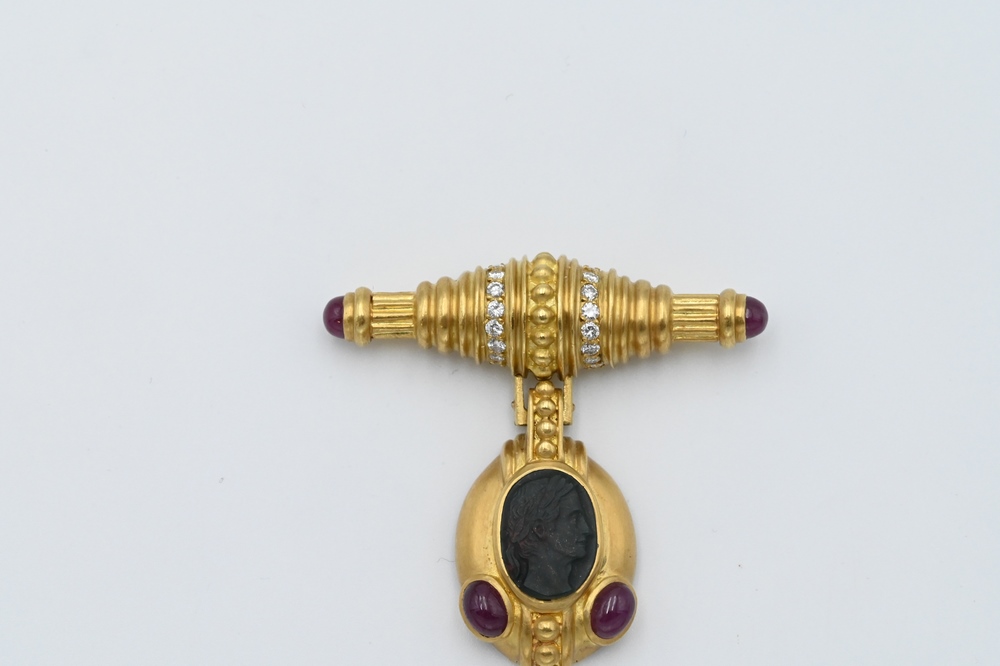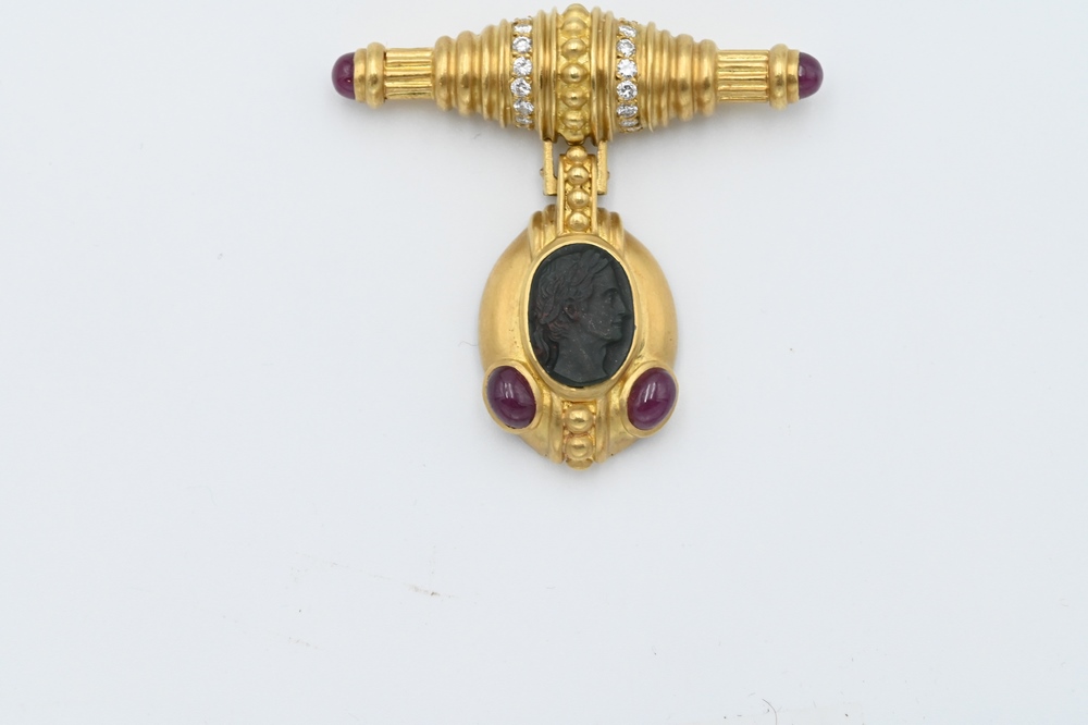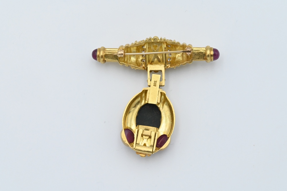 18 Karat Yellow Gold Brooch in the Manner of Elizabeth Locke, having t-bar, set with 16 diamonds and ruby end with attached pendant having classical oval stone head along with 2 cabochon cut rubies, unsigned, 2 x 2 inches, 32 grams.