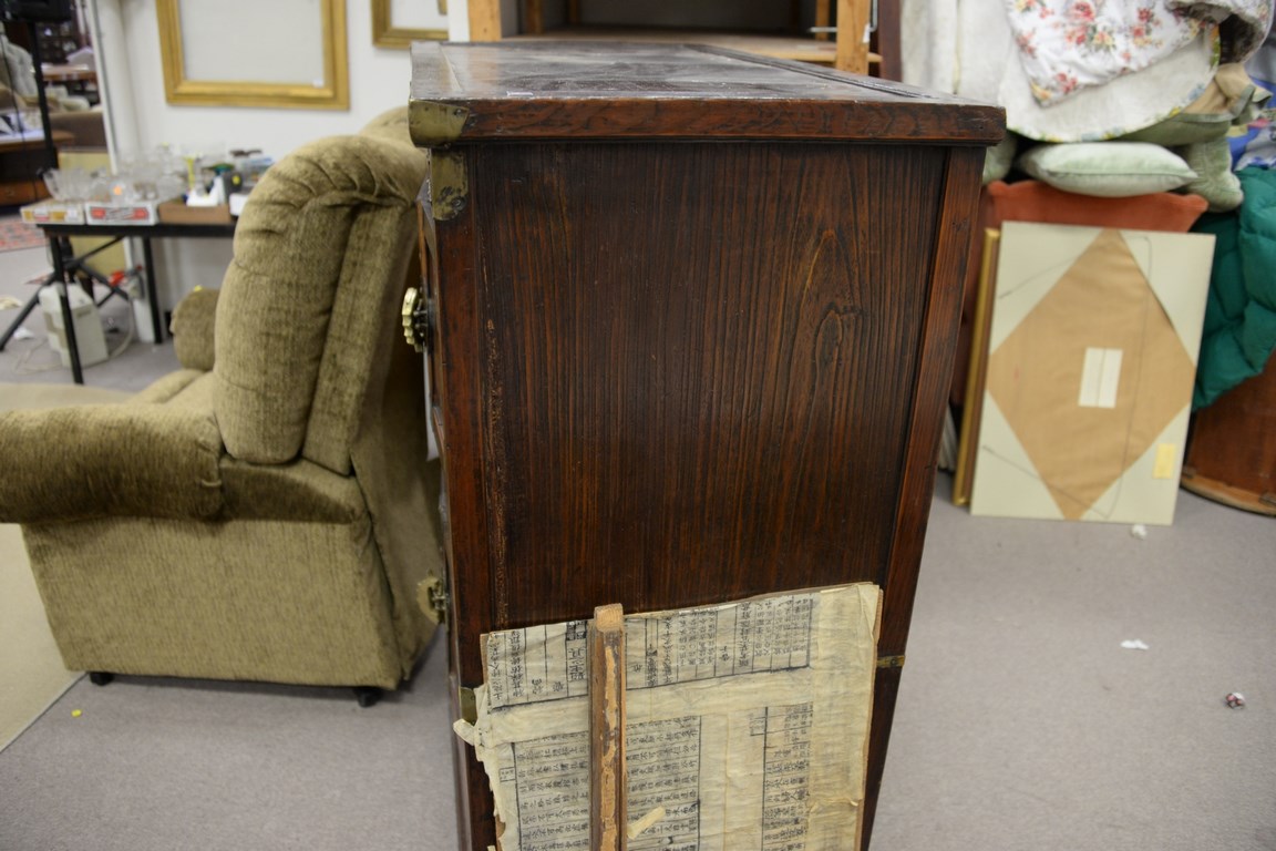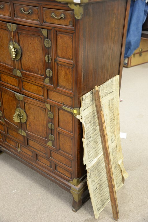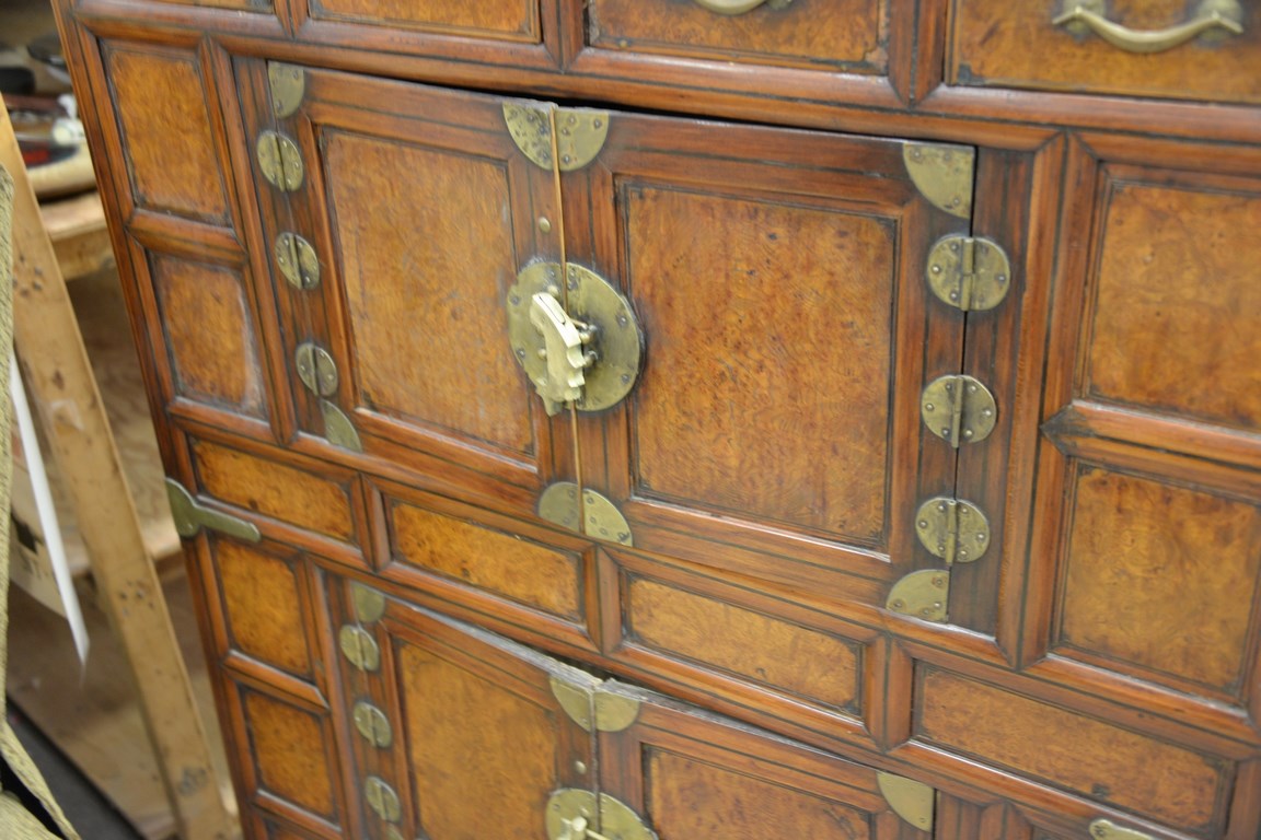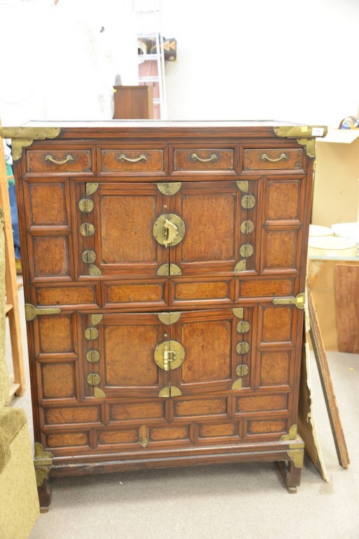 Lot 40: 19th century Oriental burl walnut cabinet having four drawers and two double doors on base, probably 18th century, bottom interior s…