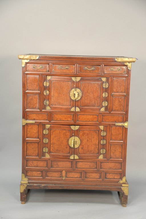 19th century Oriental burl walnut cabinet having four drawers and two double doors on base, probably 18th century, bottom interior shelf missing. ht. 56 in. wd. 42 in.