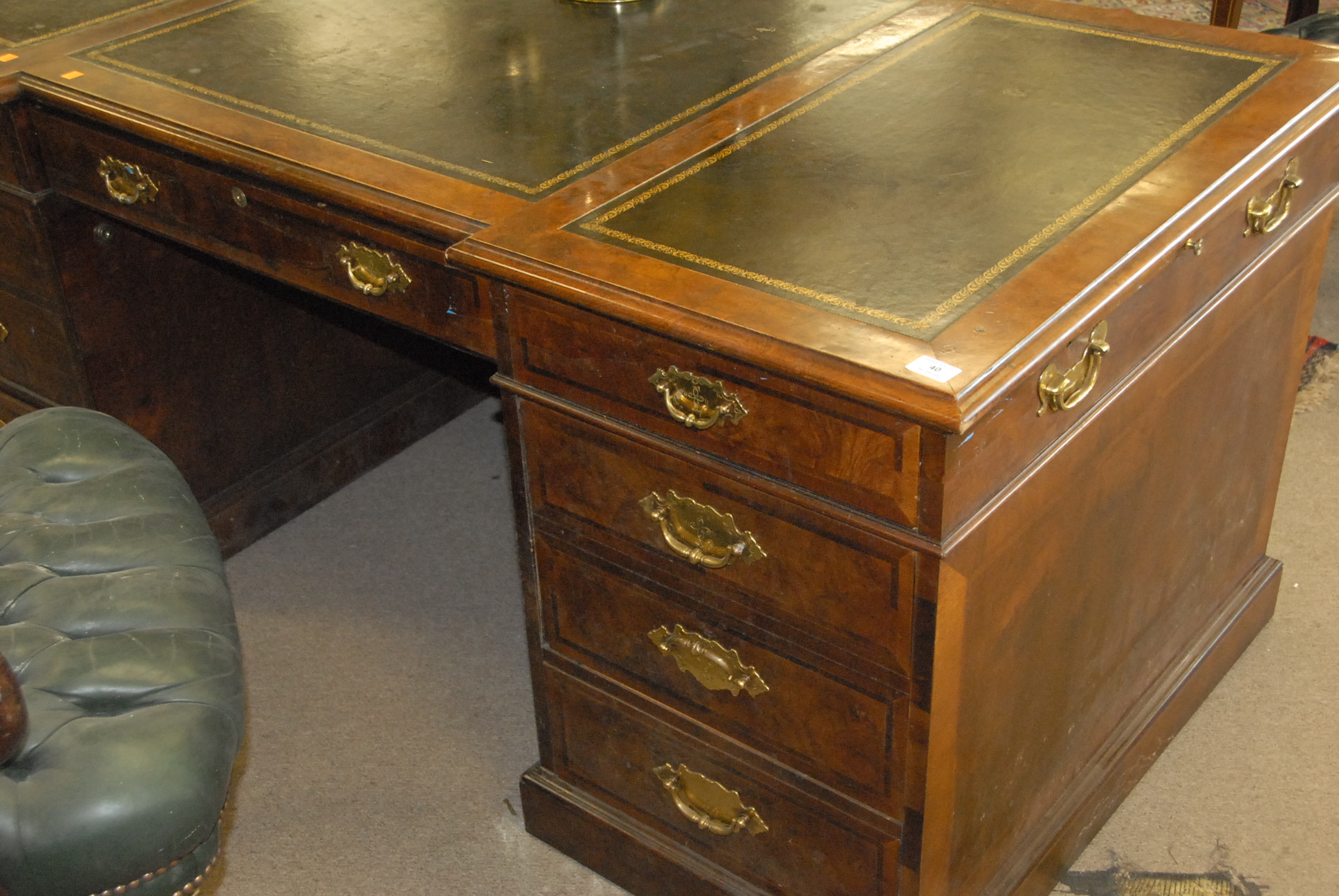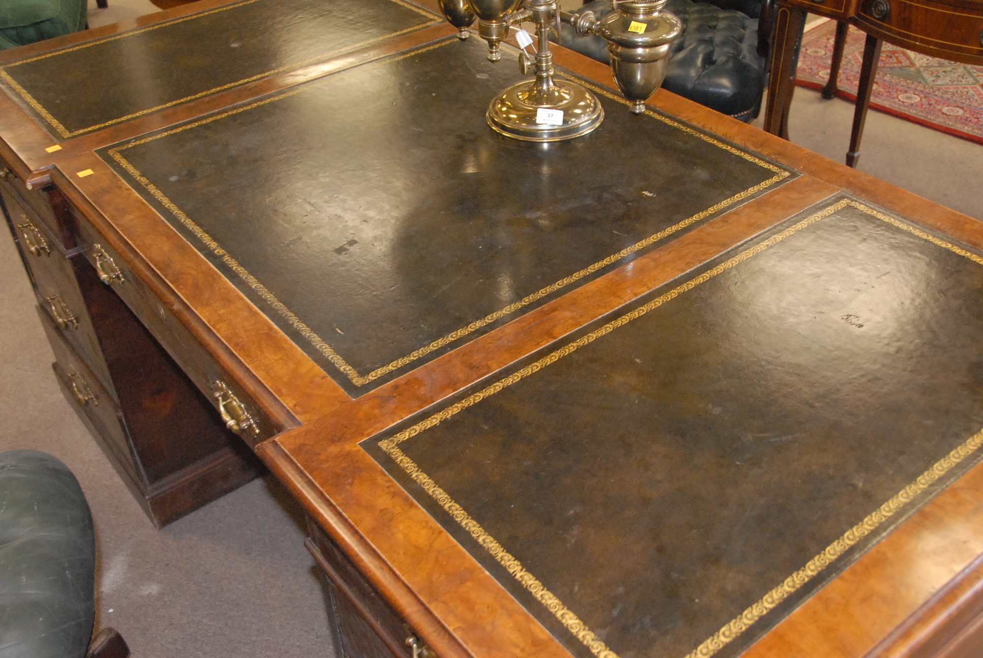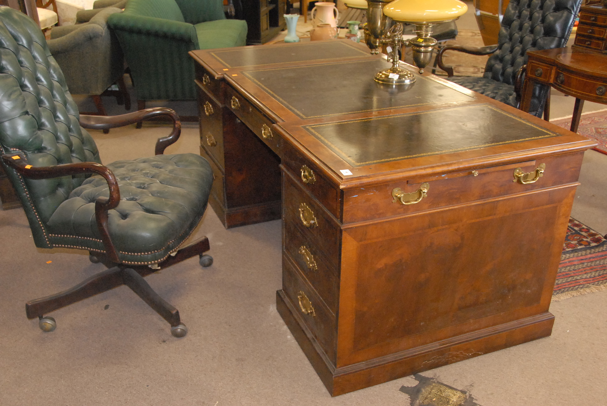Lot 40: Aston Court by Henredon burlwood leather top desk and green leather tufted office chair, lg. 6′, dp. 3′.