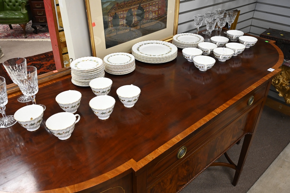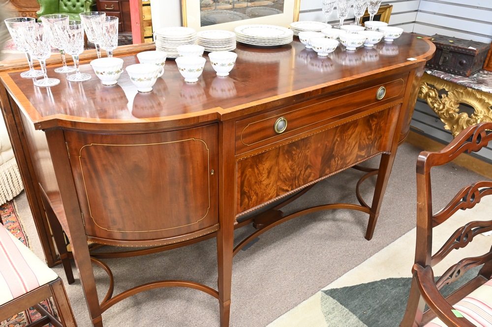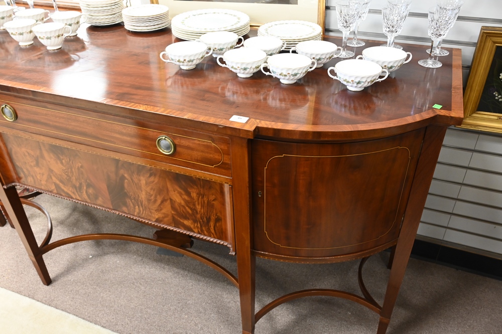 Lot 40: Custom Mahogany Bench Made Federal Style Sideboard, having two drawers flanked by doors, on square tapered legs with elliptical stretchers and banded inlaid top, height 38 inches, top 27 1/2 x 73 inches.
