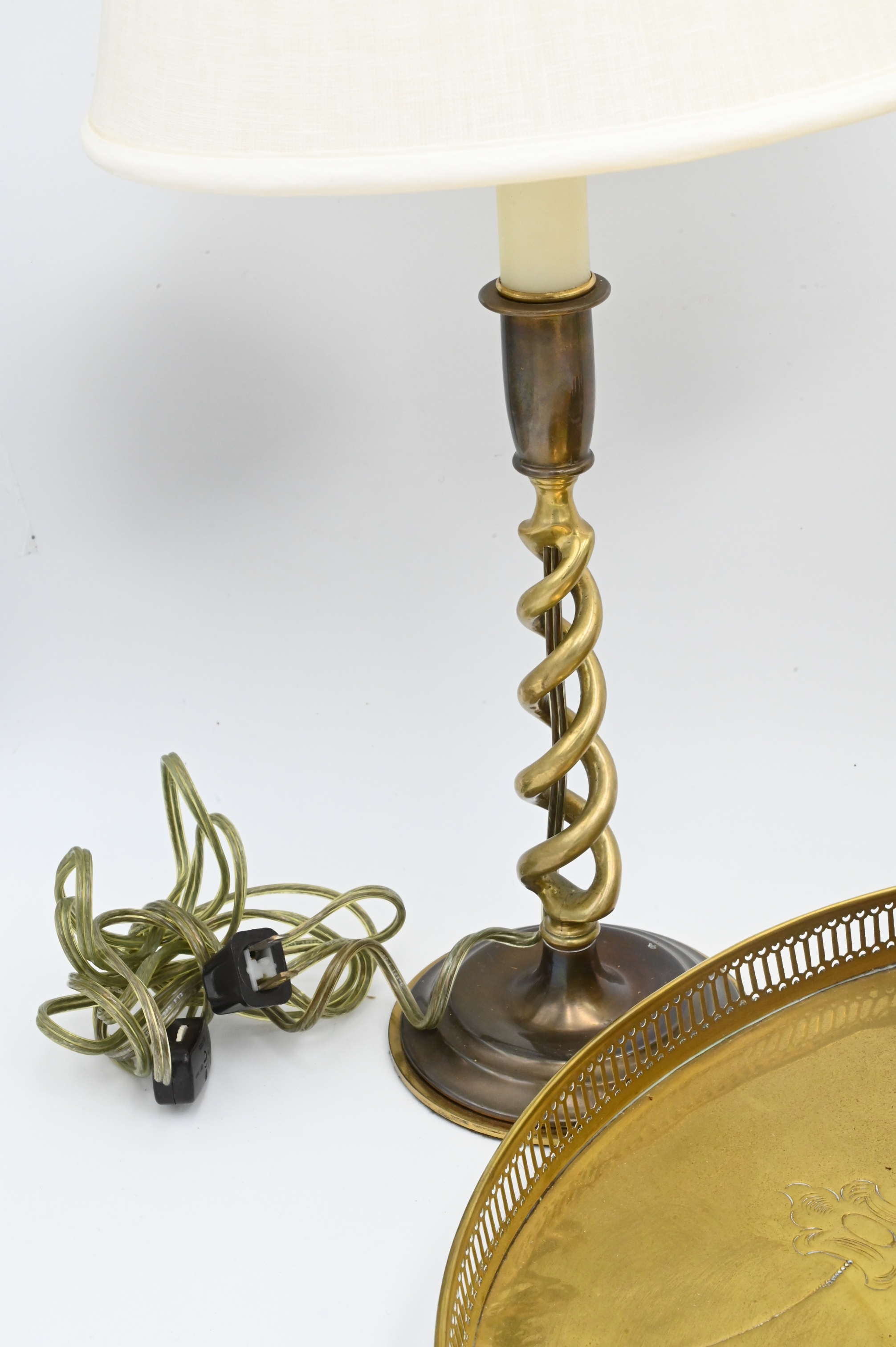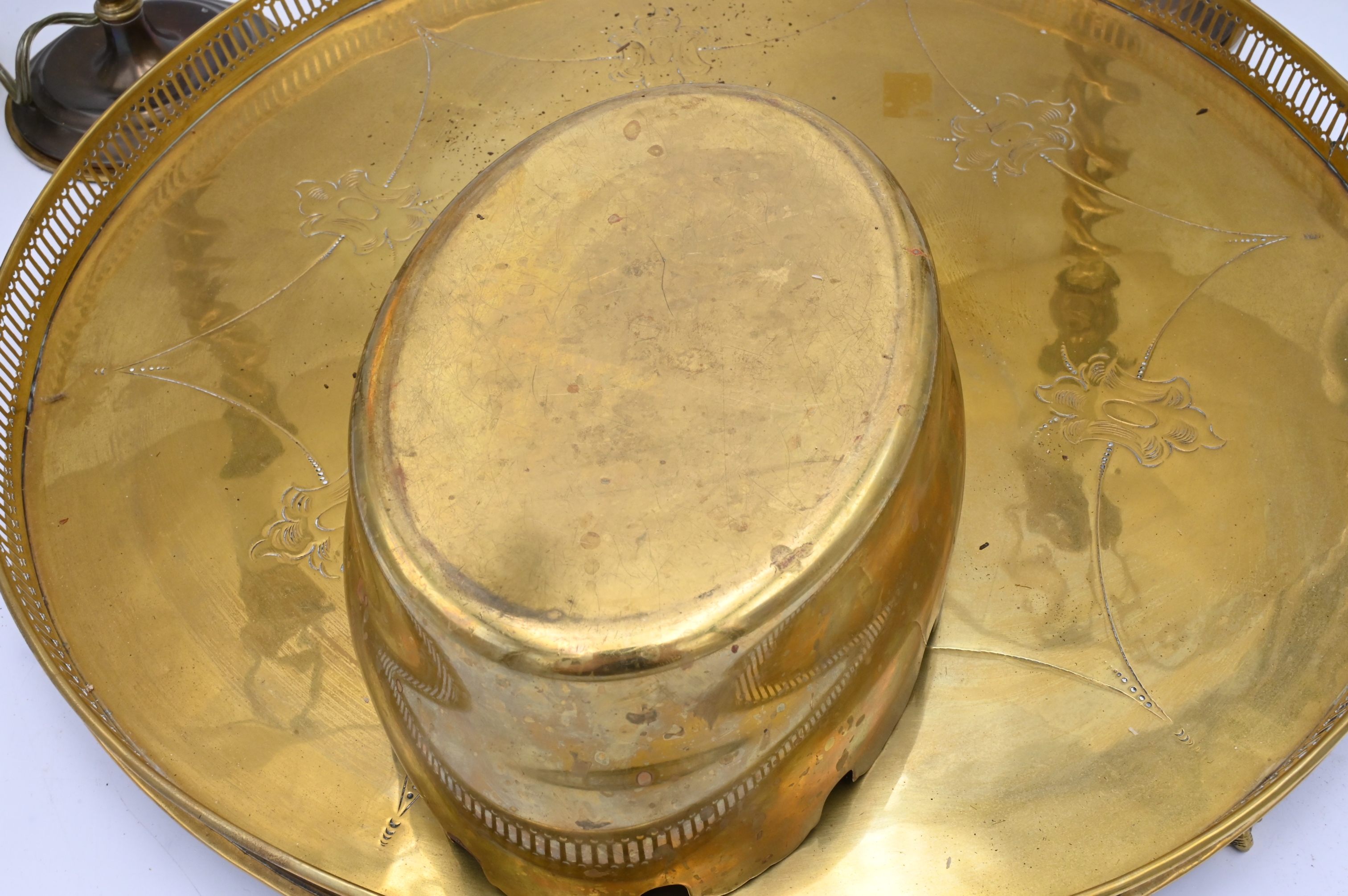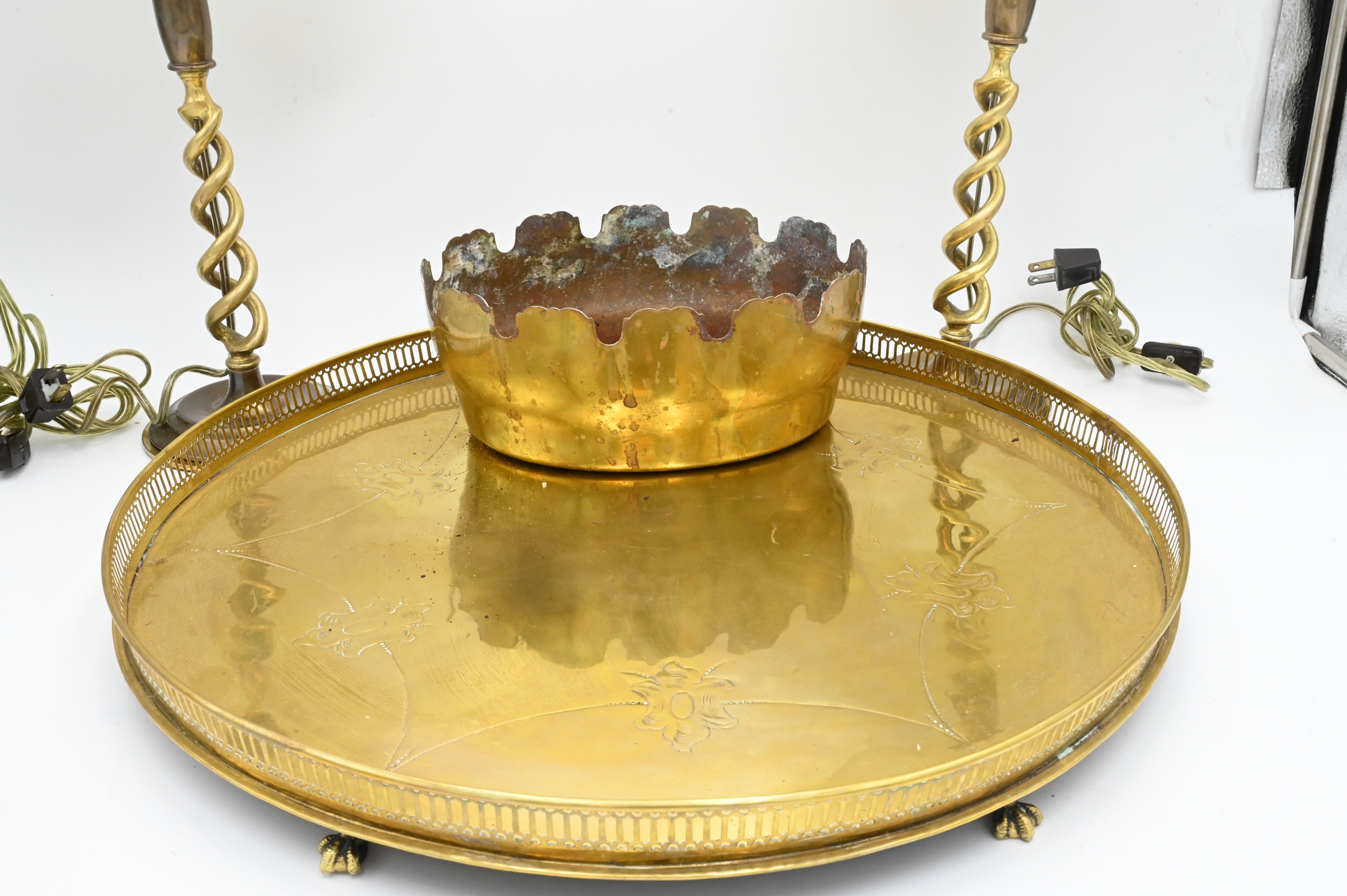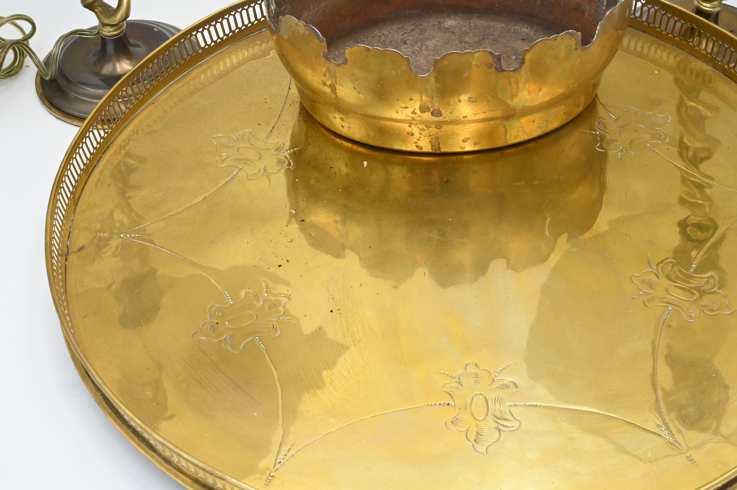 To include bass gallery incised round tray, England c. 1890, an oval planter with scallop rim and a pair of twist candlesticks made into table lamps