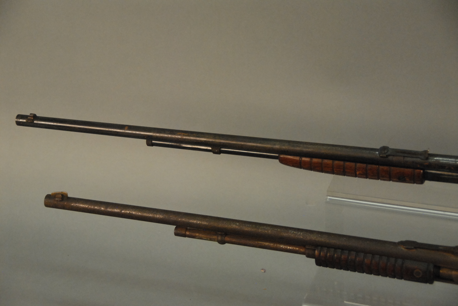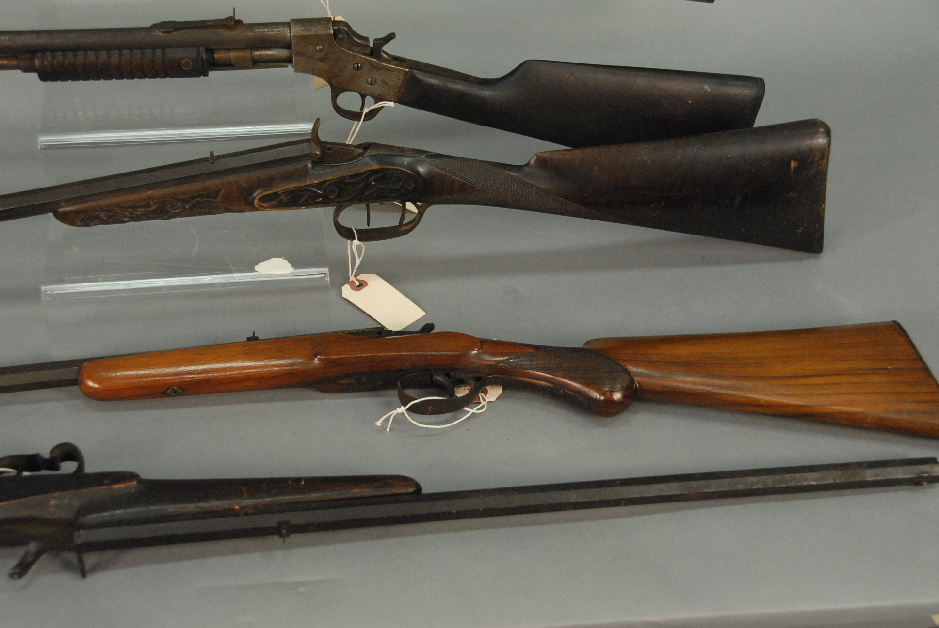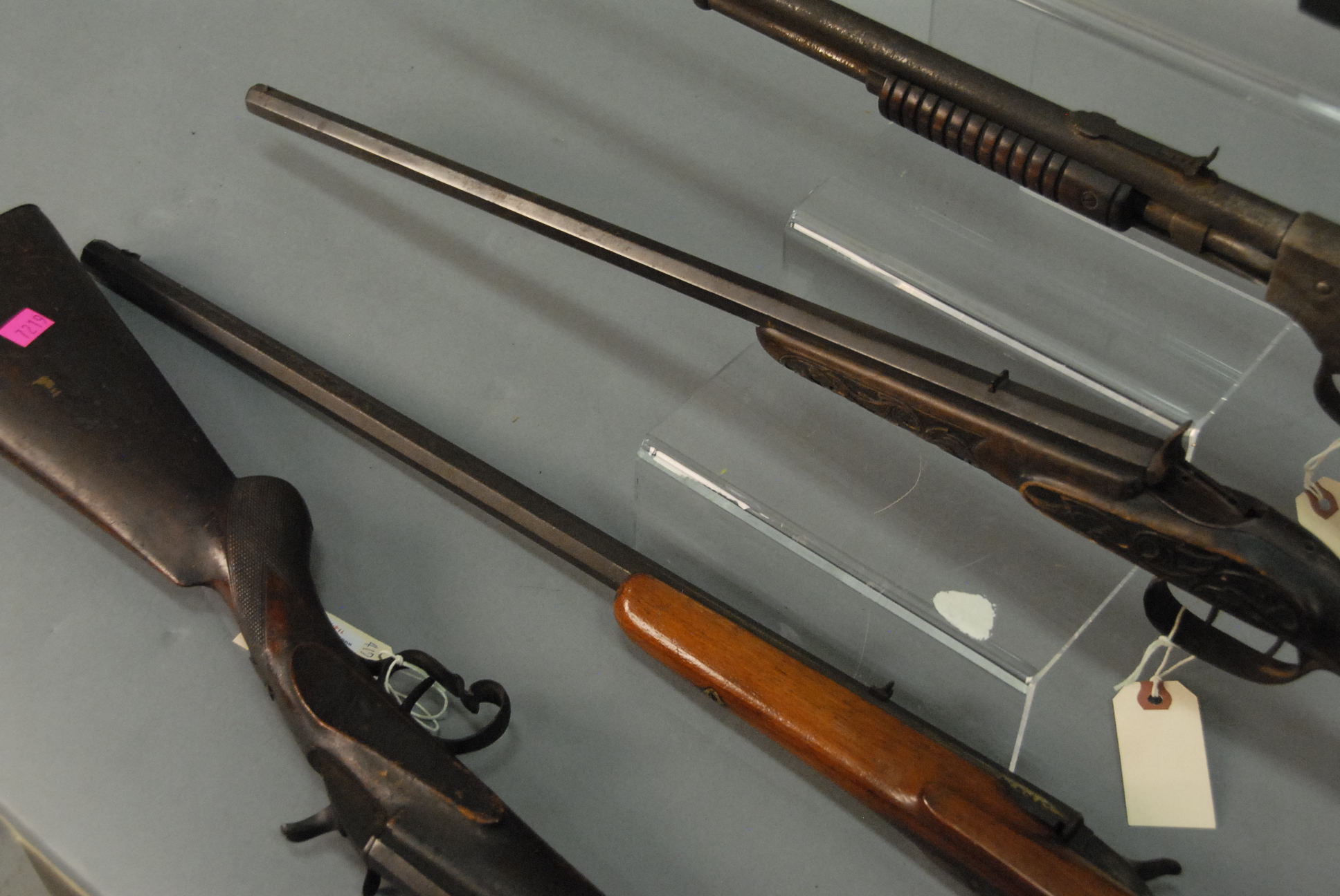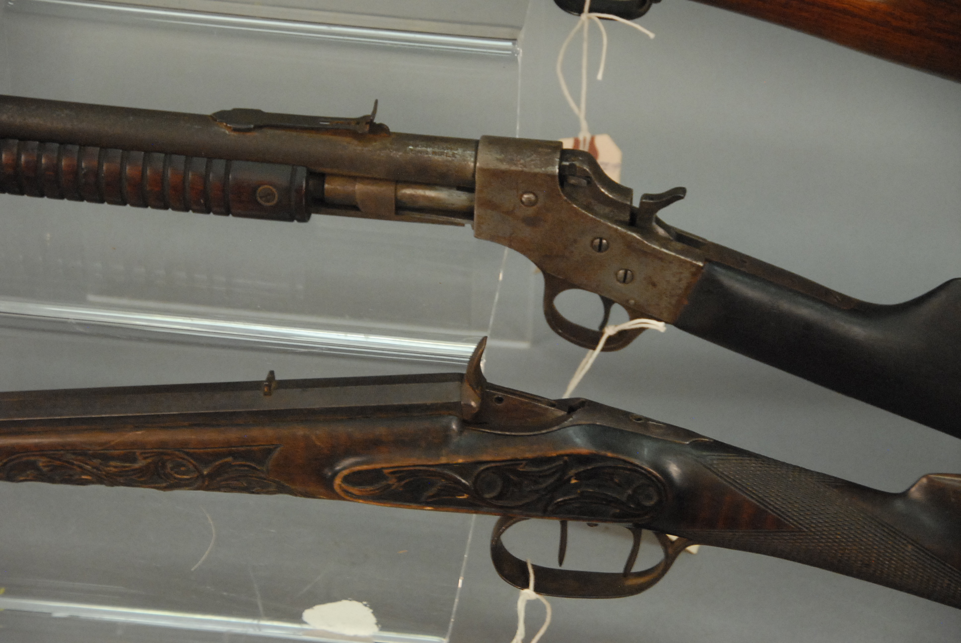 Group of five 22 caliber rifles including Remington model 12, 22 caliber pump action rifle with 22 barrel, s/n 348372A Belgium 22 caliber, octagon barrel rifle with 23 barrel, no s/n European octagon barrel 22 caliber rifle with 22 1/4 barrel, s/n MR European octagon barrel rifle with carved grip, 22 caliber, 21 1/2 barrel, no s/n and Steven’s 22 caliber, visible loading, 21 barrel, s/n 121 415, 416, 417, 418, & 444.