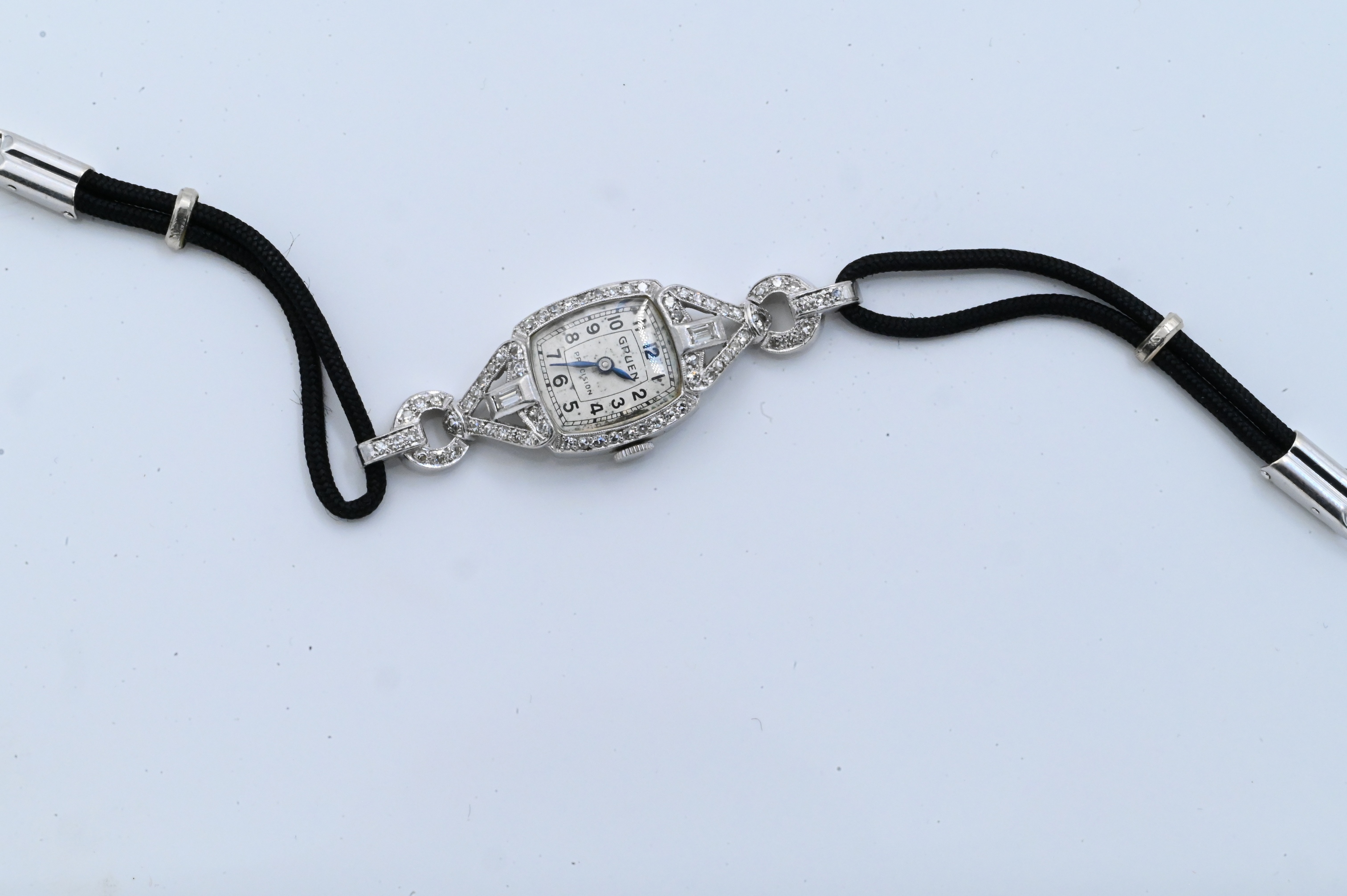 with silver-tone tonneau-shaped dial featuring black Arabic numerals and blued-steel hands measuring approximately 16 x 18 mm, framed by two baguette and small single-cut diamonds totaling approximately 0.60 ct., quartz movement (converted from original mechanical), case signed Gruen, number 72941, completed by double-strand black cord bracelet with metal fold-over clasp, total weight approximately 6.4 dwt (10.0 grams).