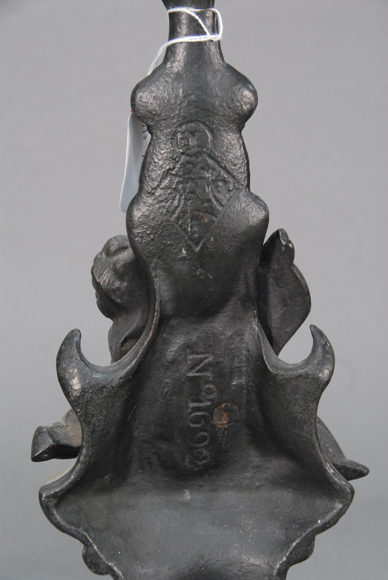 Lot 40: Iron door stop with English registry number, 2 putti, 2 dolphins, and northwind face, ht. 14 1/2.