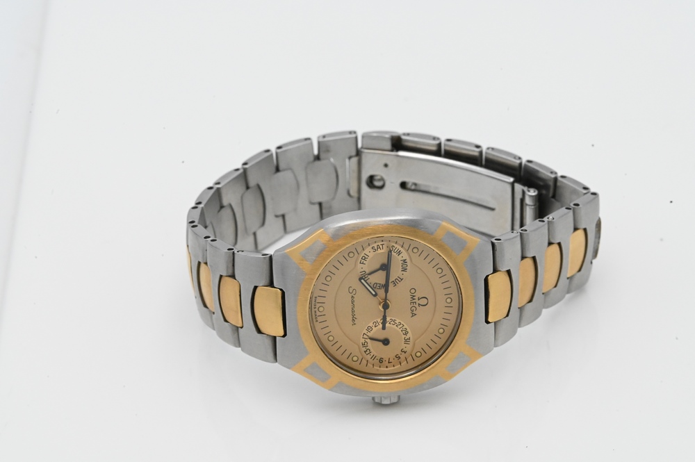Omega Seamaster Wristwatch, having day and date dials, 31.4 millimeters.