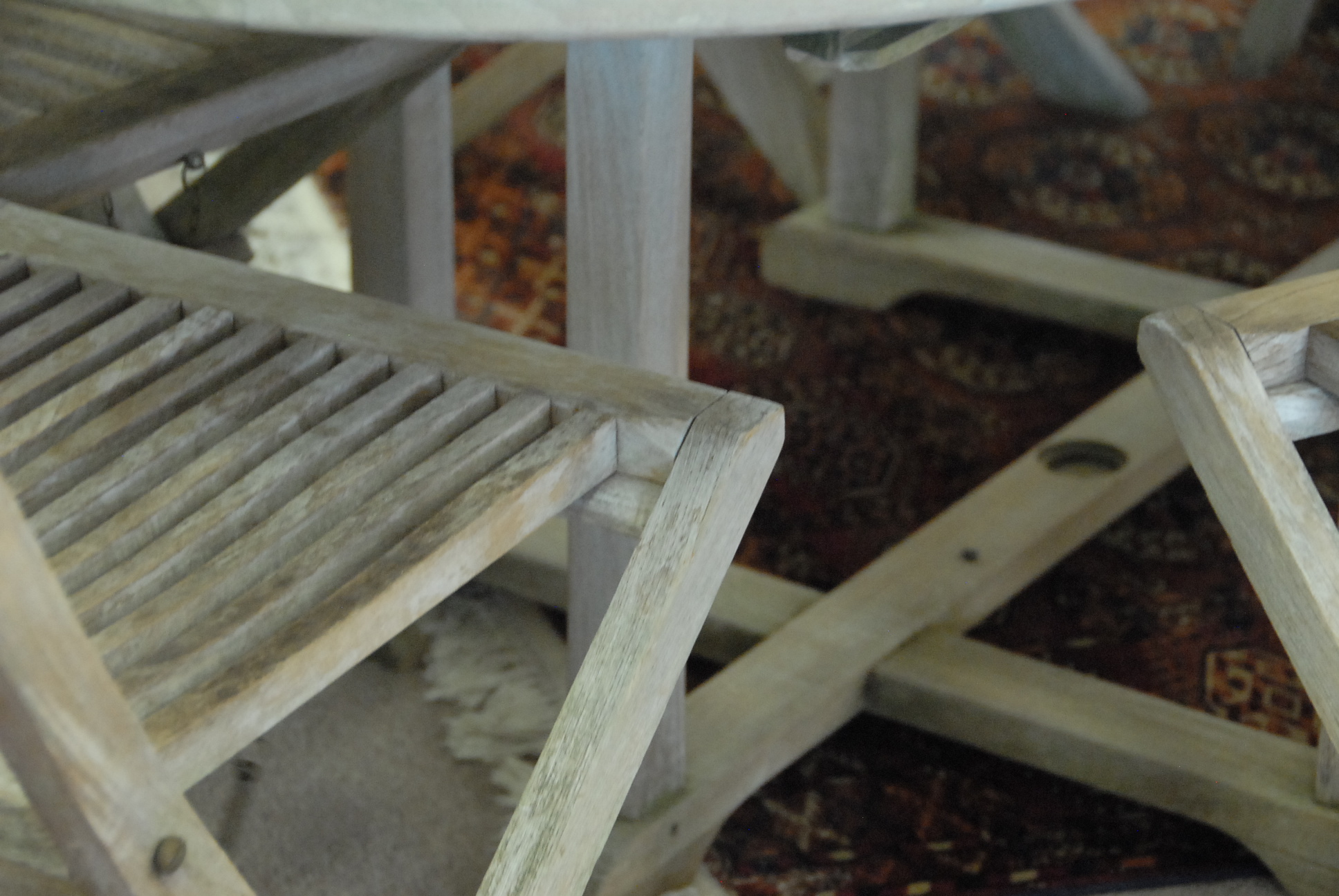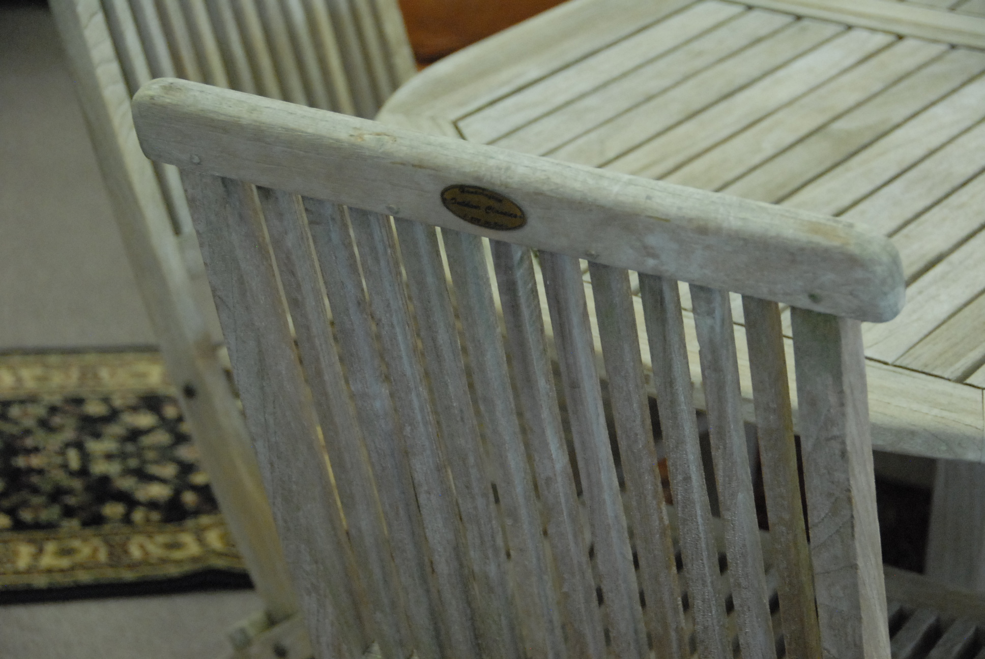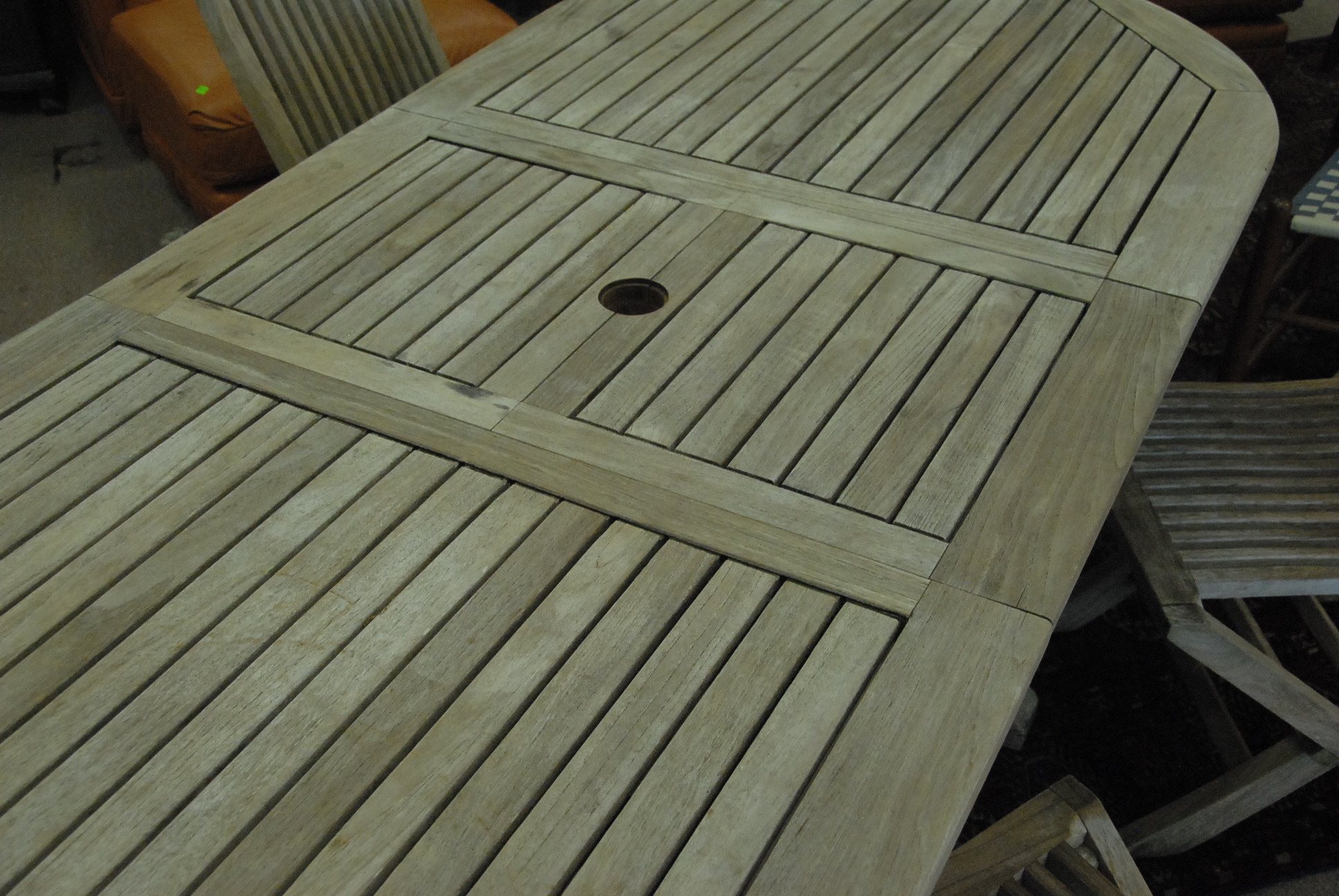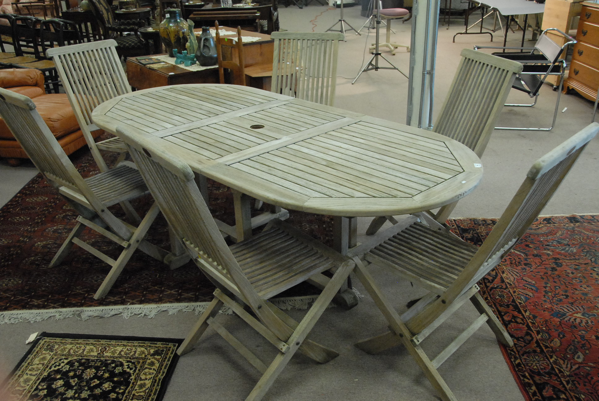 Outdoor Classics teak oval table and six chairs, ht. 29in. top: 39 x 86.