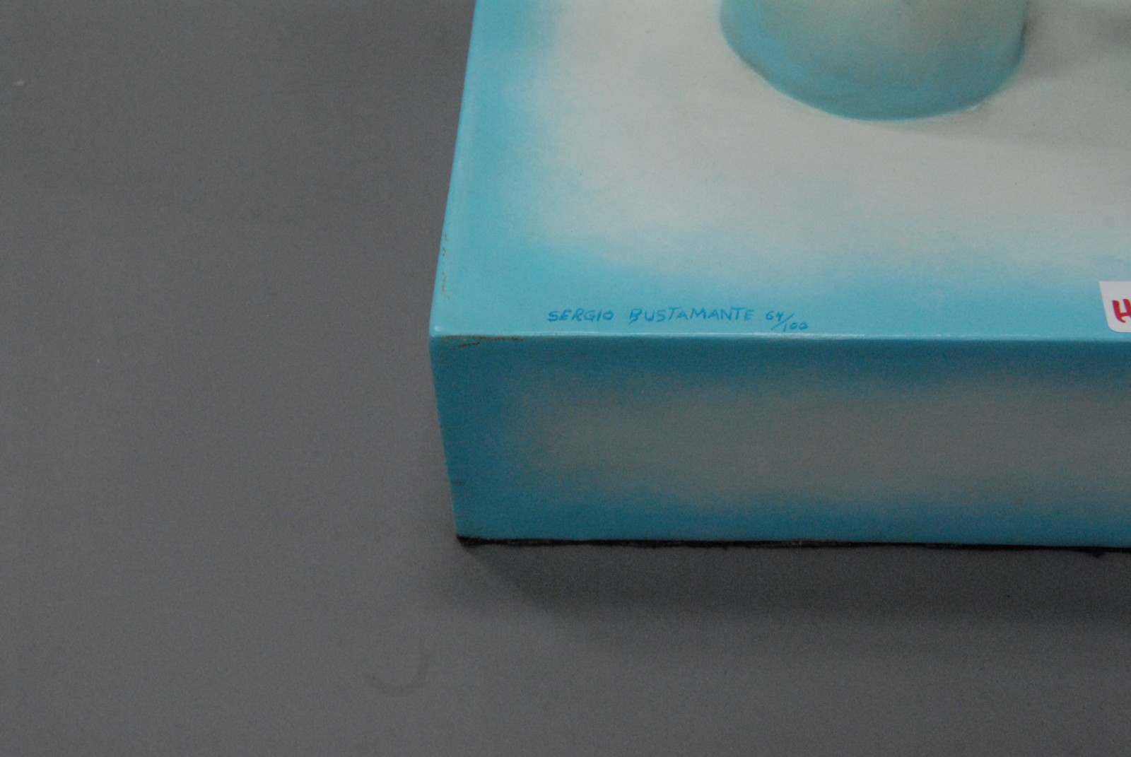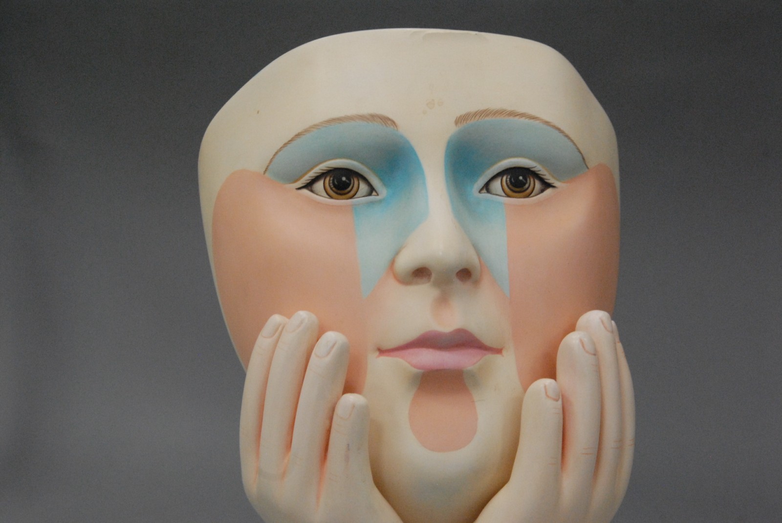 Sergio Bustamante signed 64 out of 100, face in hands sculpture, minor paint lifting at top of mask