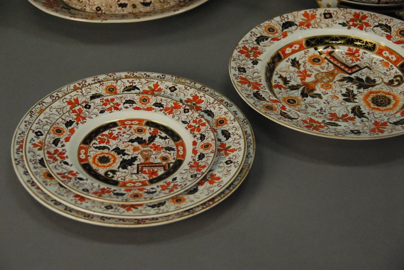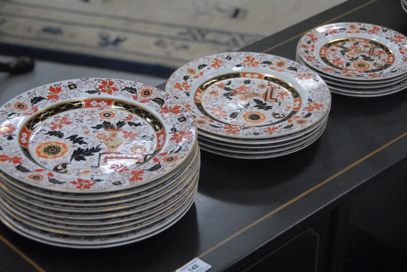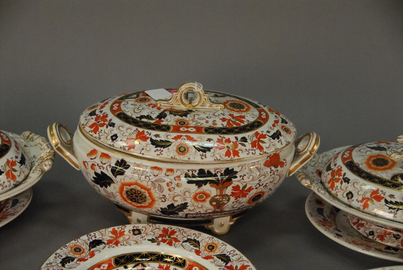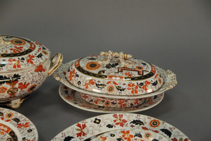 Lot 40: Set of thirty-four Imari pattern china including three covered tureens, platters, plates, and bowls.