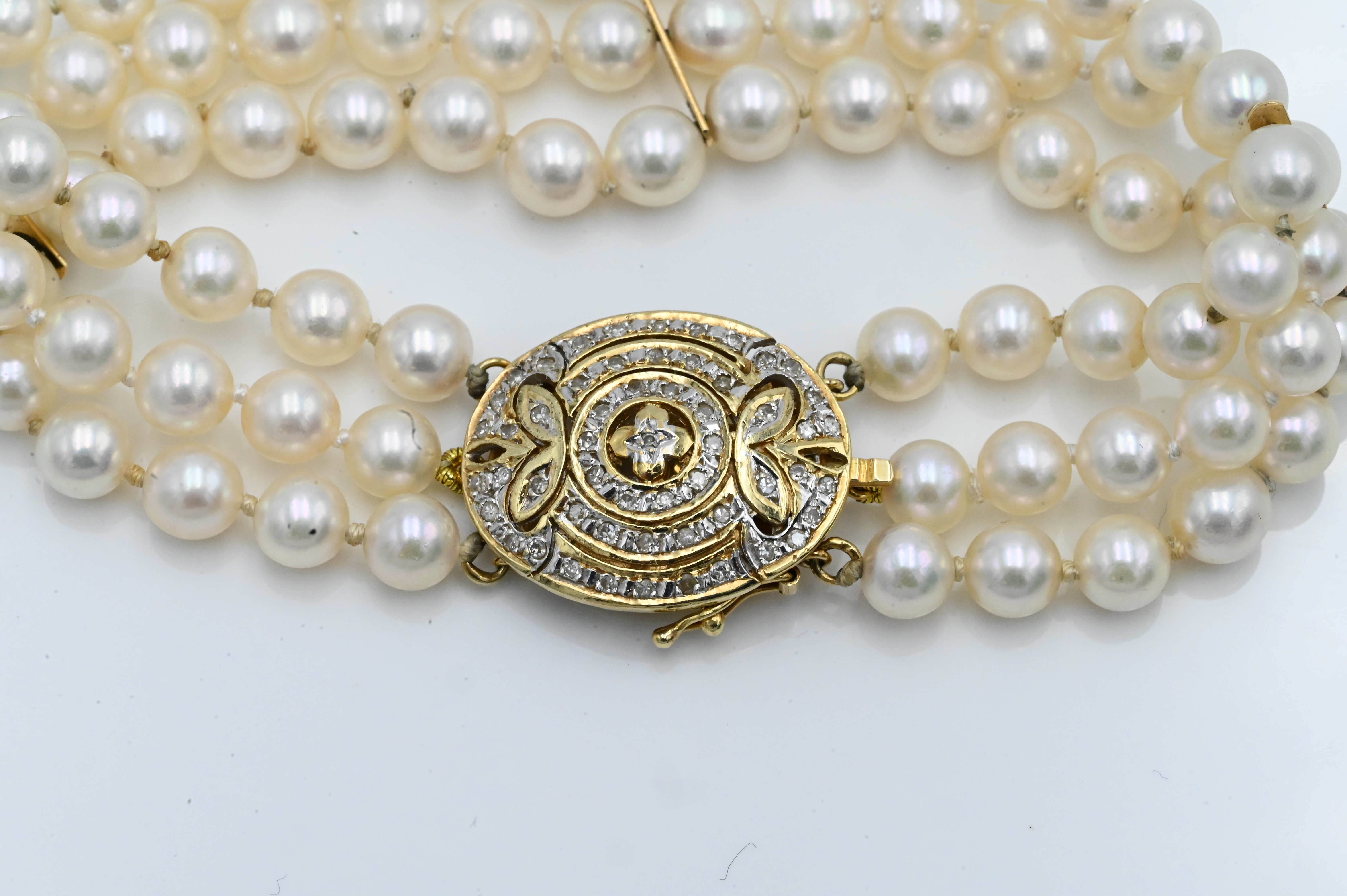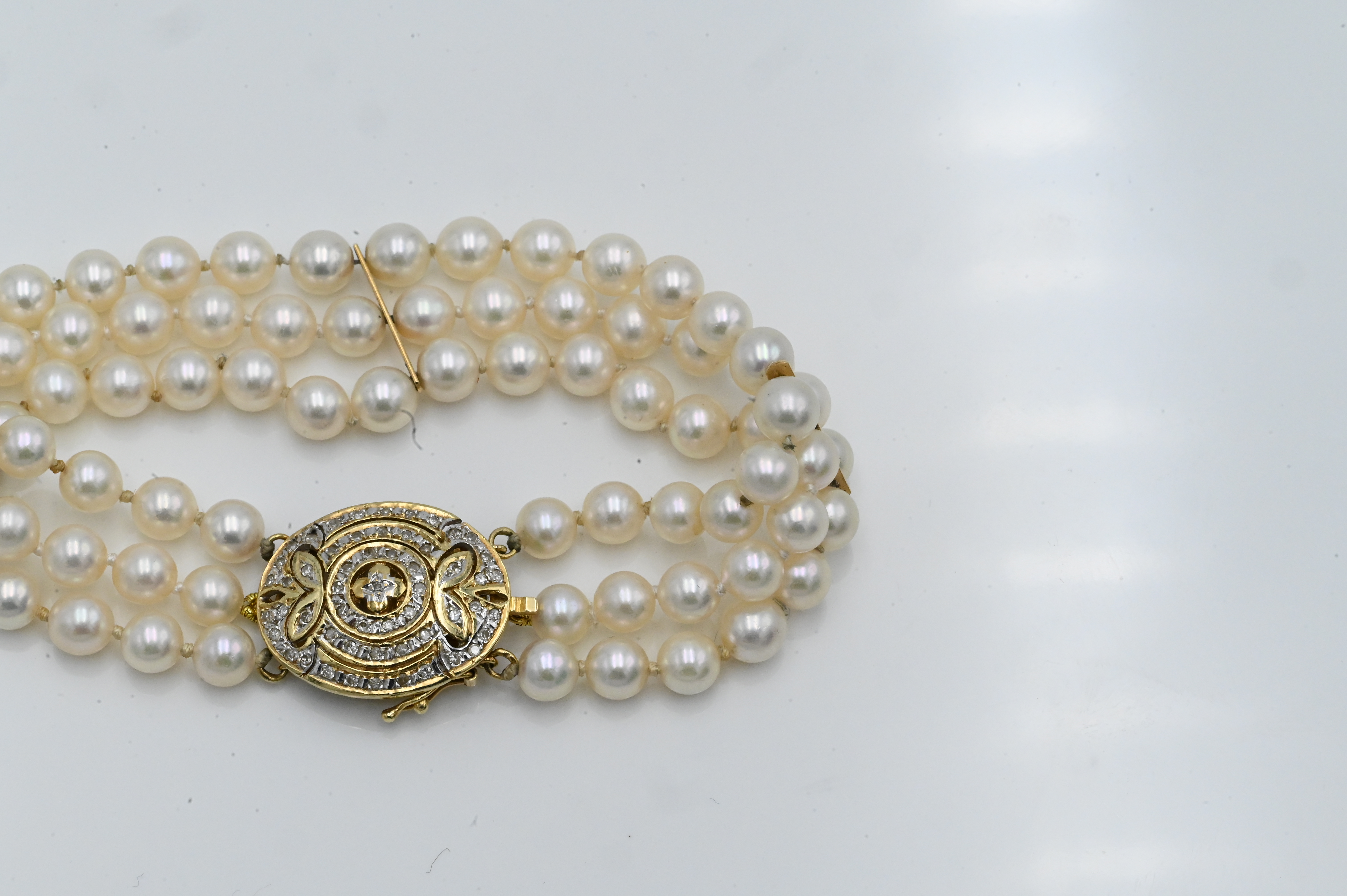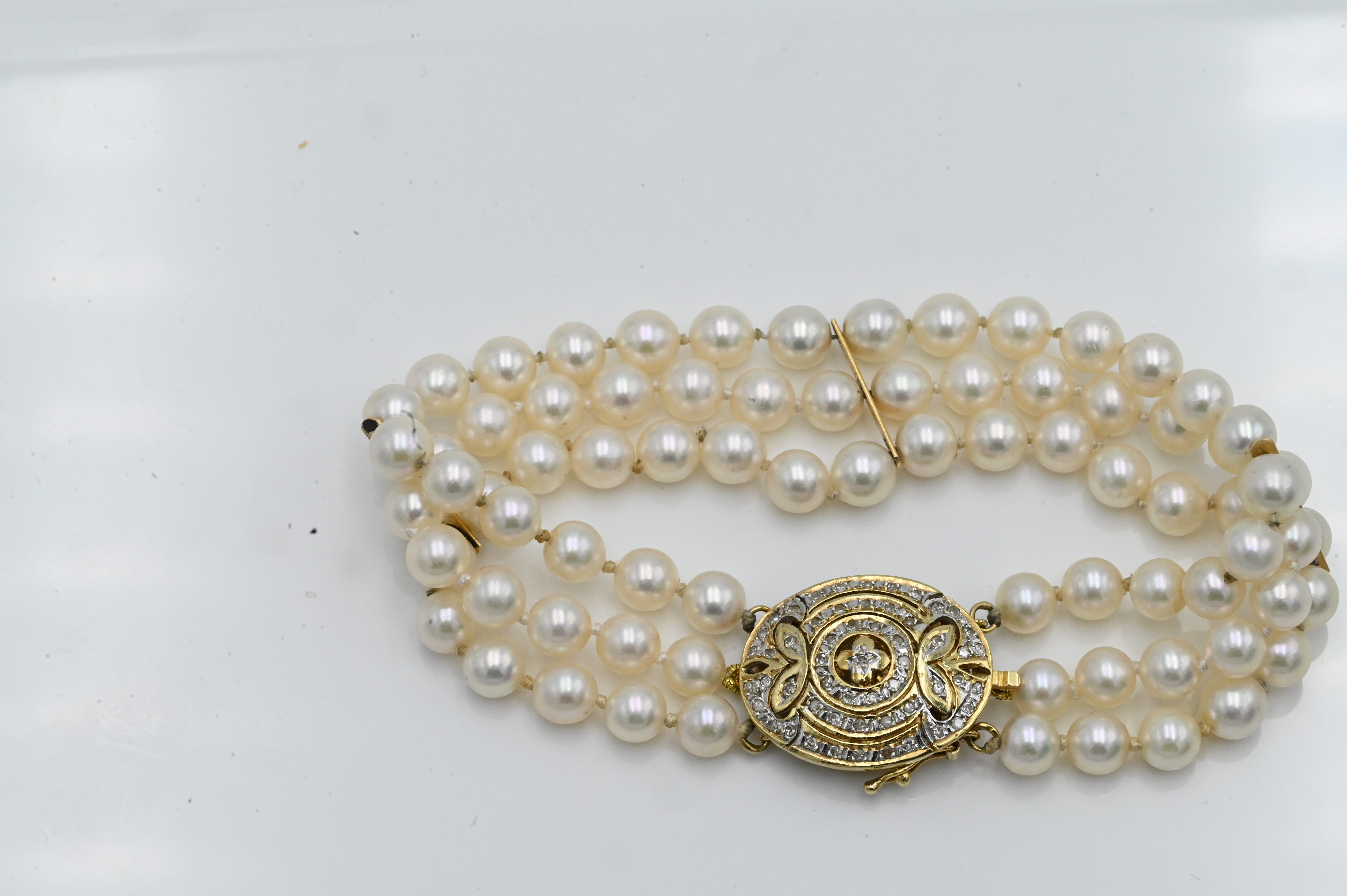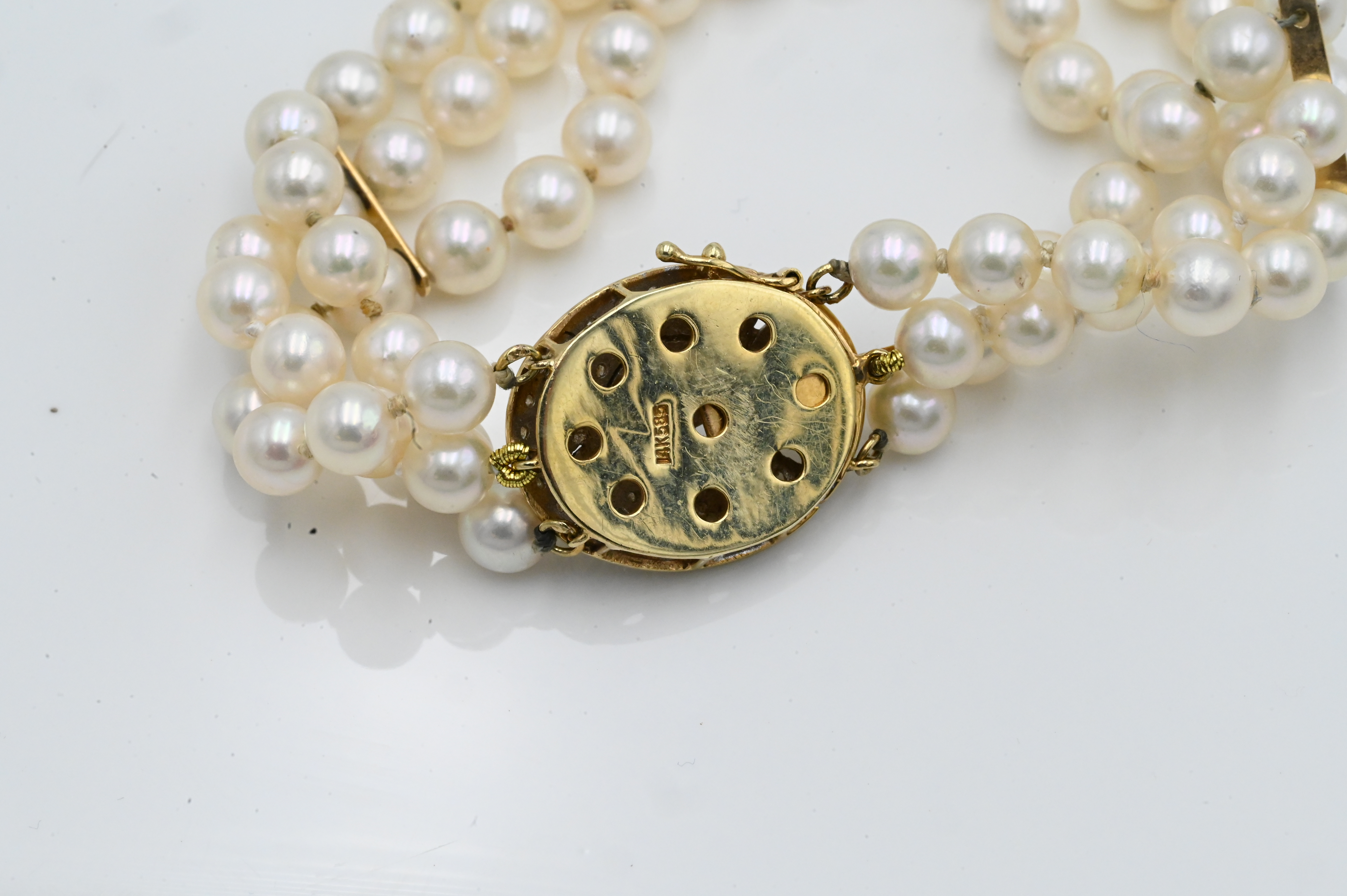 Three Strand Pearl Bracelet, having 14 karat and diamond clasp, 7 1/2 inches.