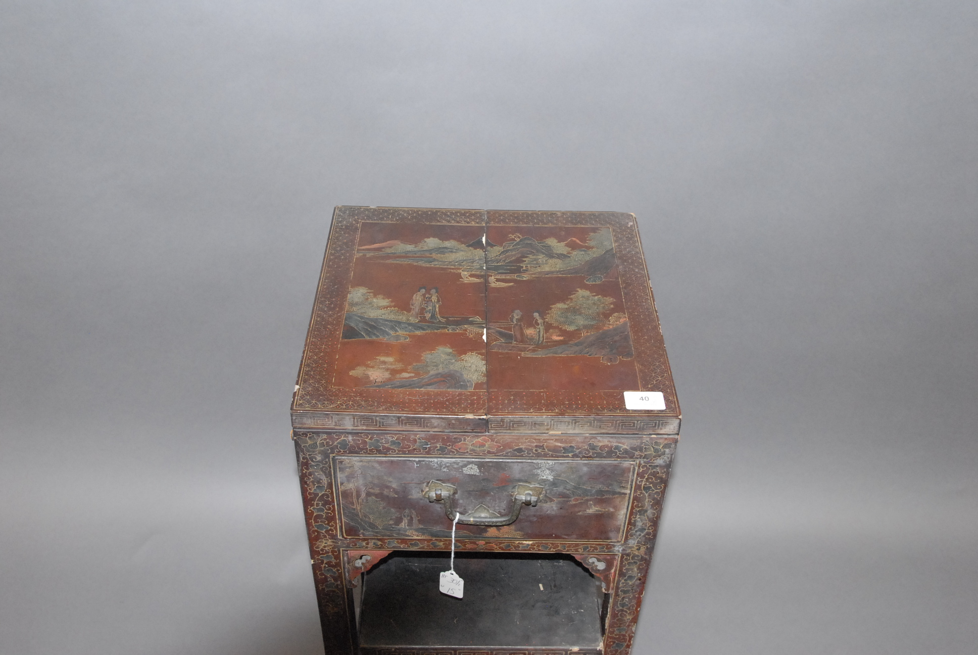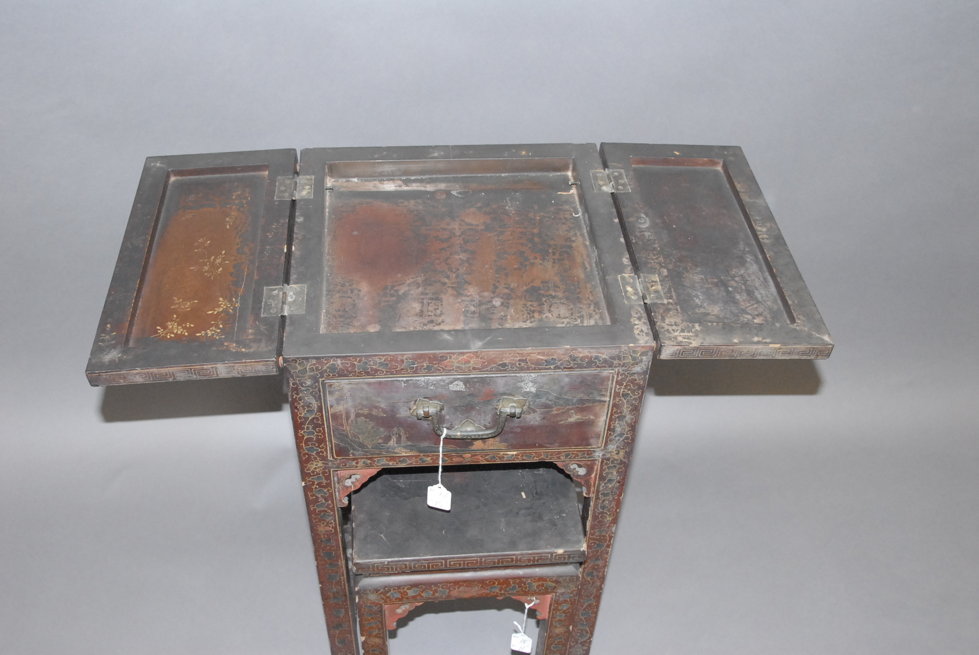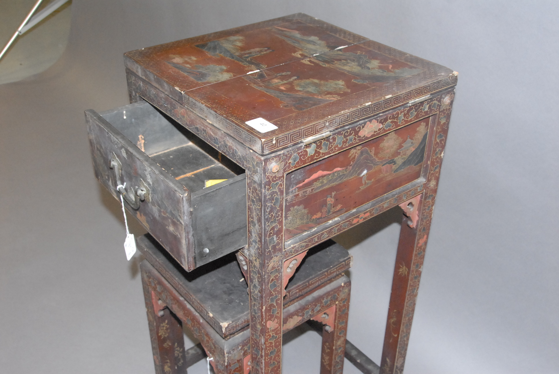 Two piece lot Chinese lacquer sewing stand paint decorated with landscape scene and scrolling blossoming flowers with flip lid and one drawer.