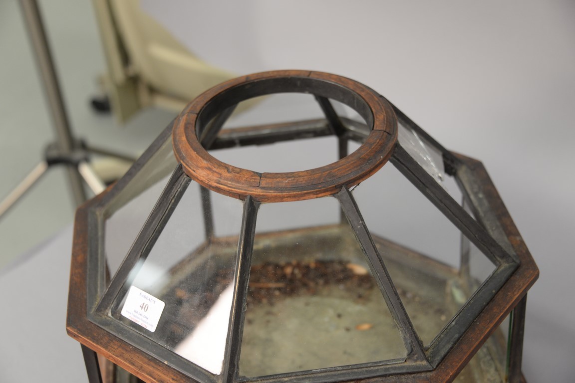 Lot 40: Walnut terrarium in the shape of an octagon some glass missing/broke. ht. 13in., wd. 16in. Provenance: Estate of Arthur C. Pinto, MD