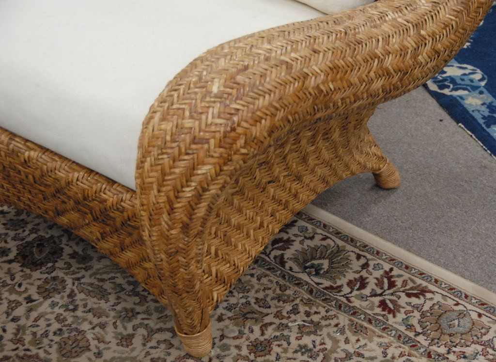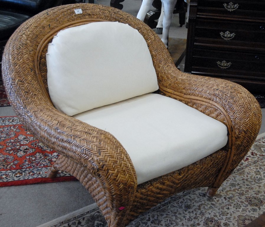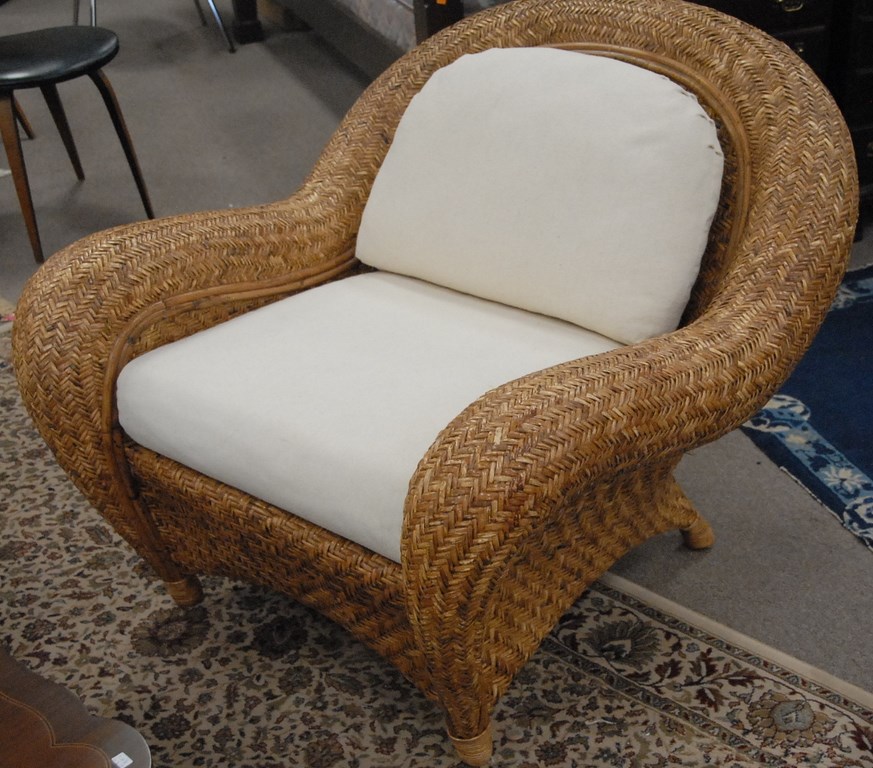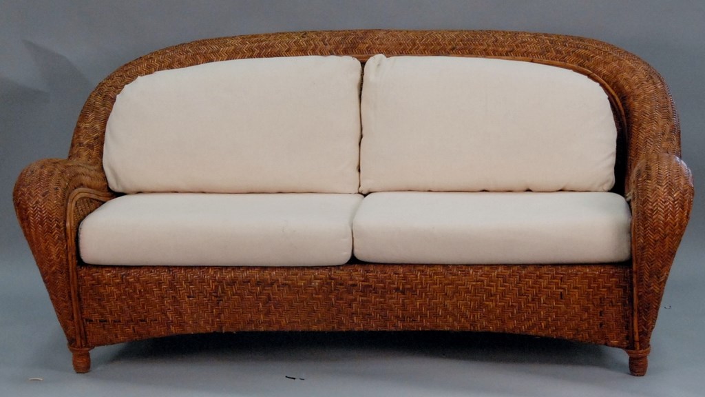 Woven wicker three piece set with upholstered cushions, sofa: lg. 73in.
