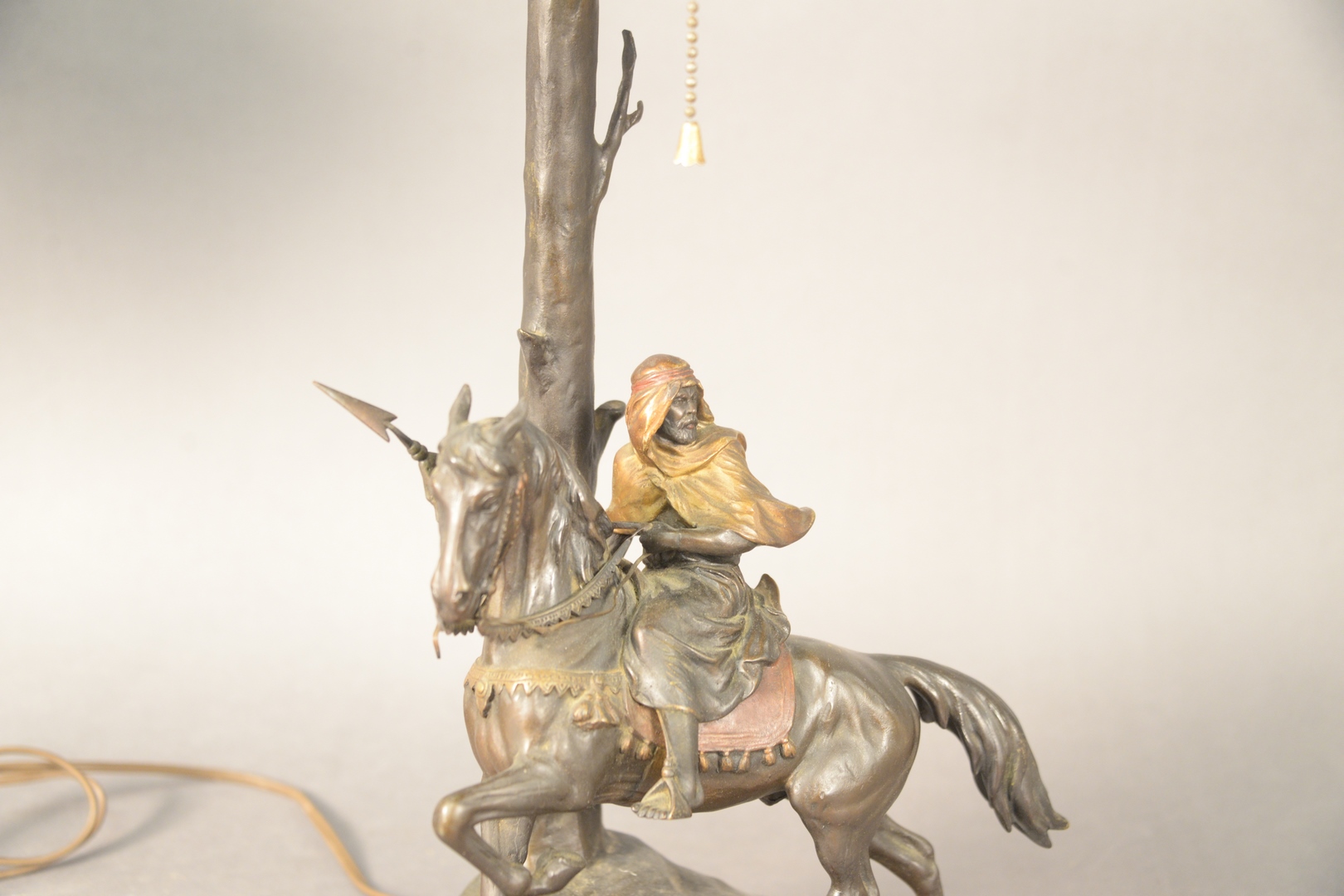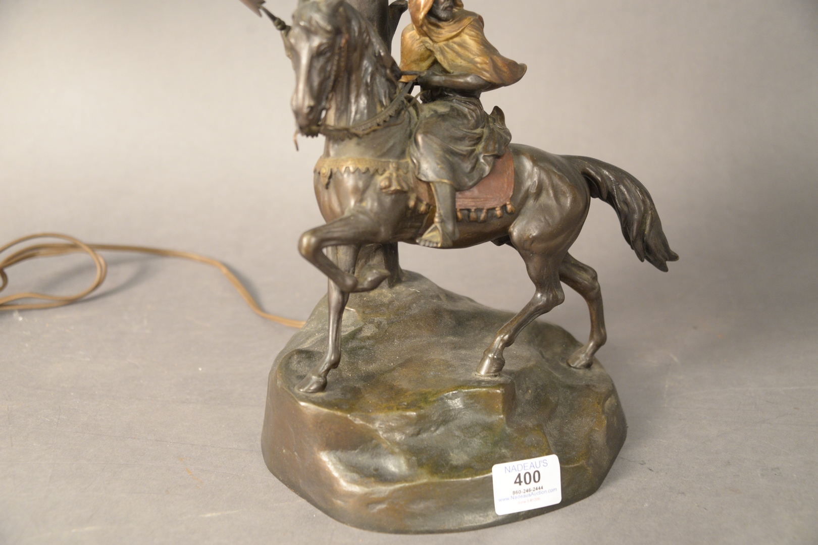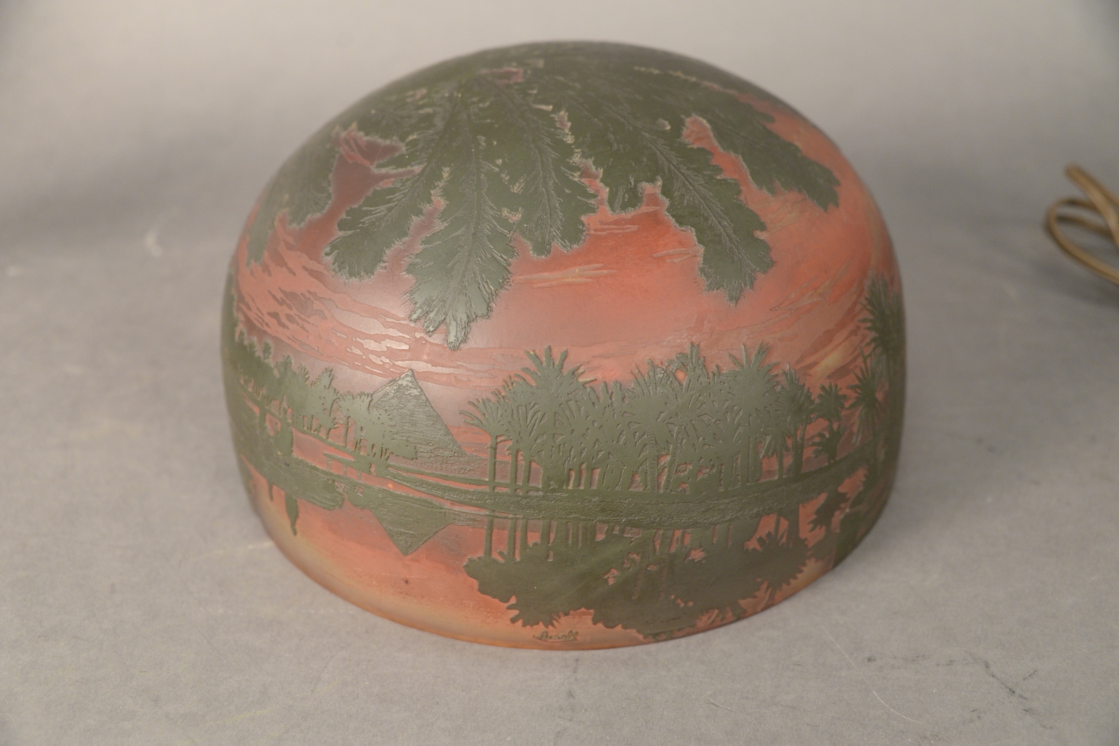 Lot 400: Arsall/Gadek Orientalist Cameo Glass and Bronze Table Lamp, having etched glass shade with orientalist scene of a Middle Eastern man on a camel with Egyptian pyramids, circa 1900 or later, bronze signed Gadek Austria, height 23 1/2 inches.