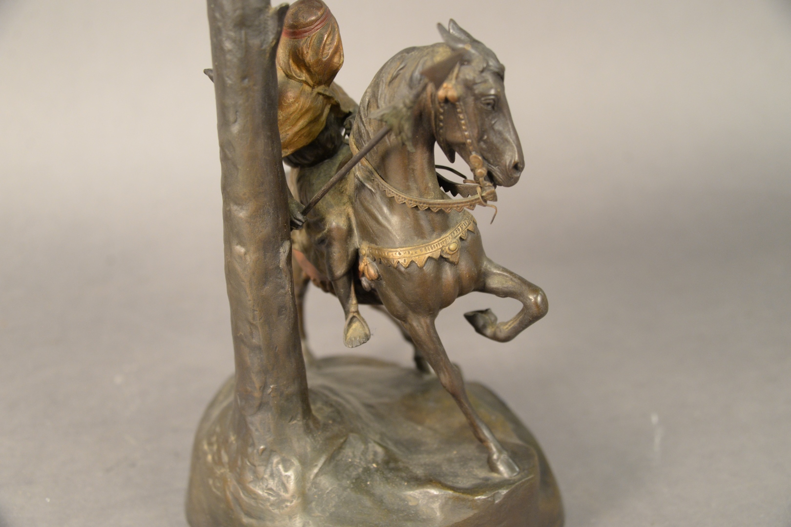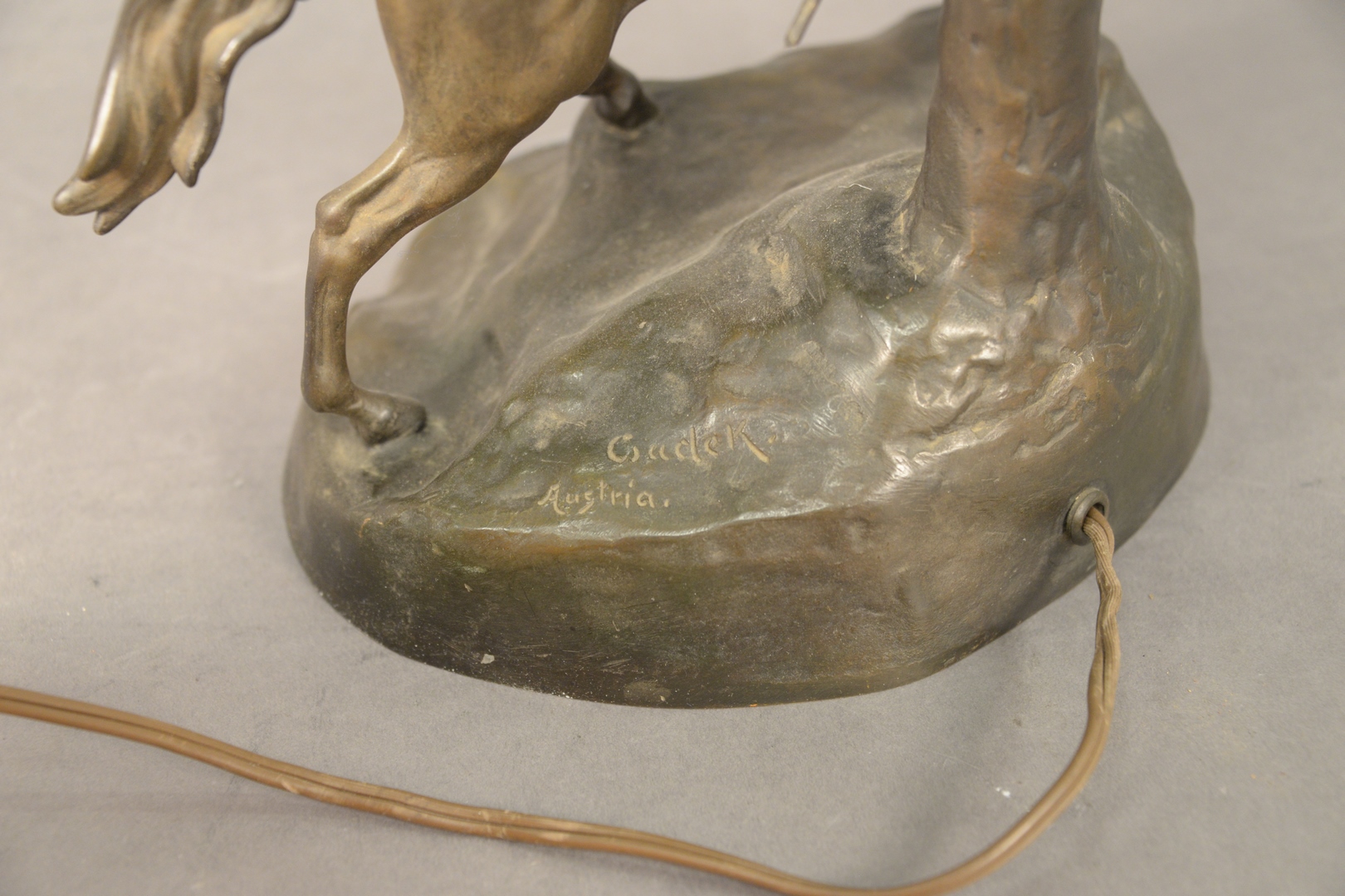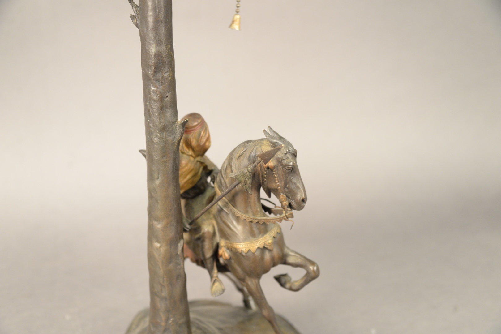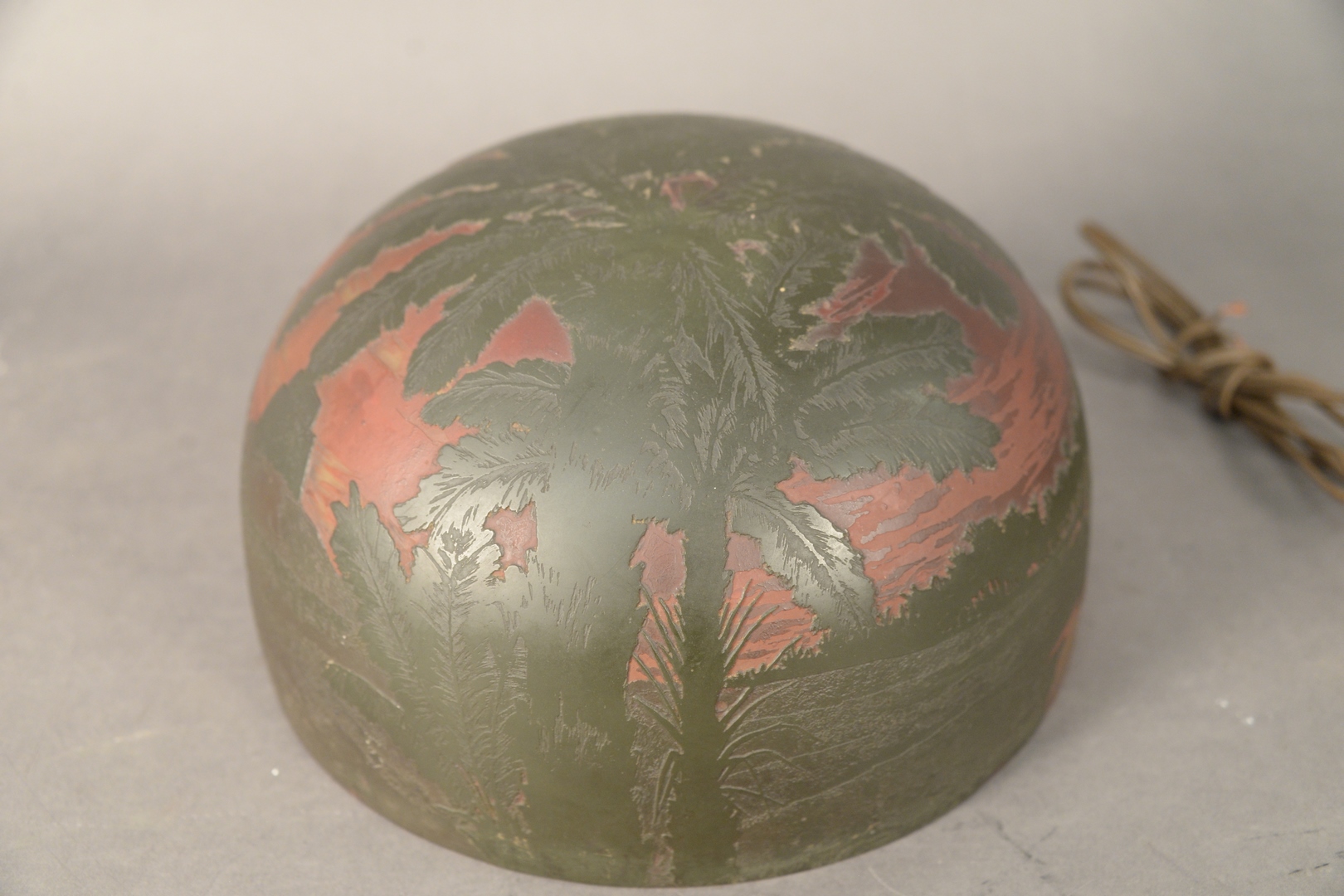 Lot 400: Arsall/Gadek Orientalist Cameo Glass and Bronze Table Lamp, having etched glass shade with orientalist scene of a Middle Eastern man on a camel with Egyptian pyramids, circa 1900 or later, bronze signed Gadek Austria, height 23 1/2 inches.