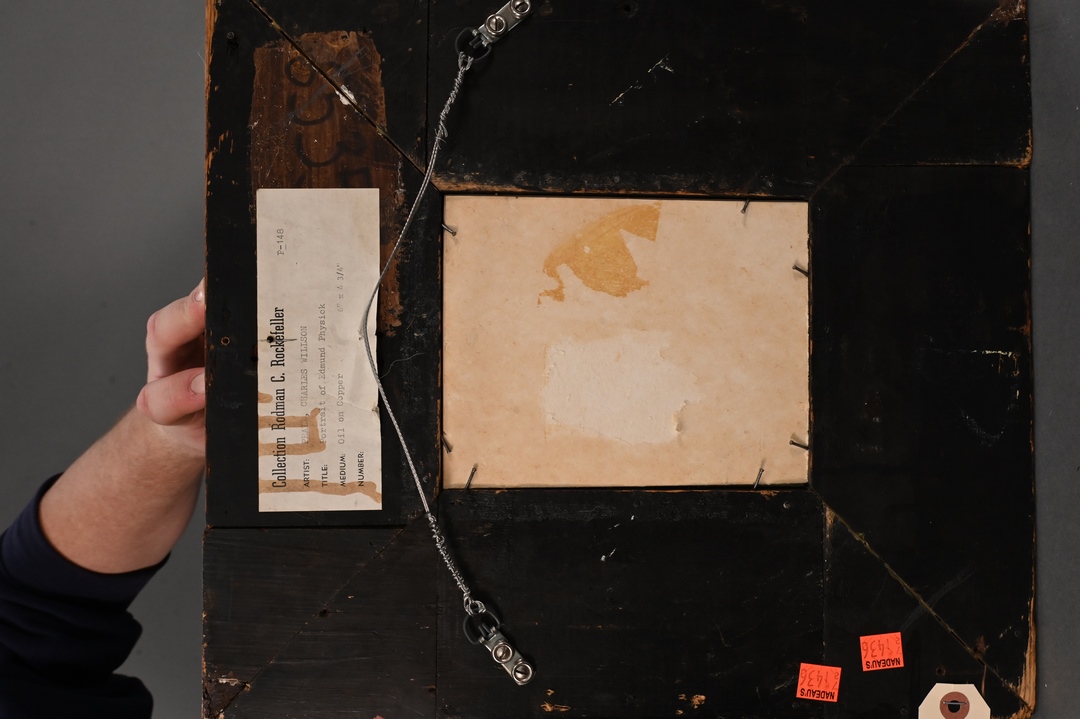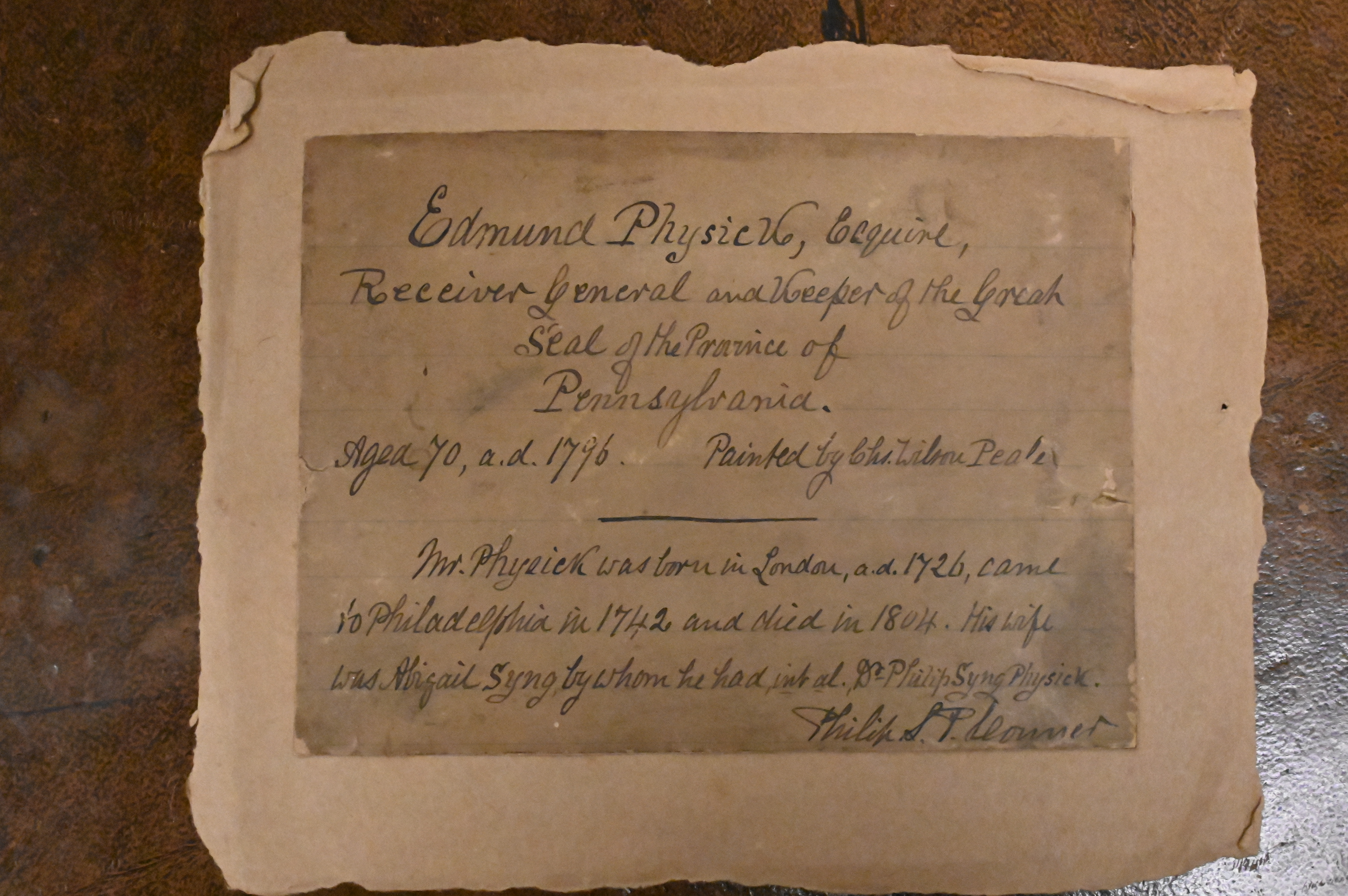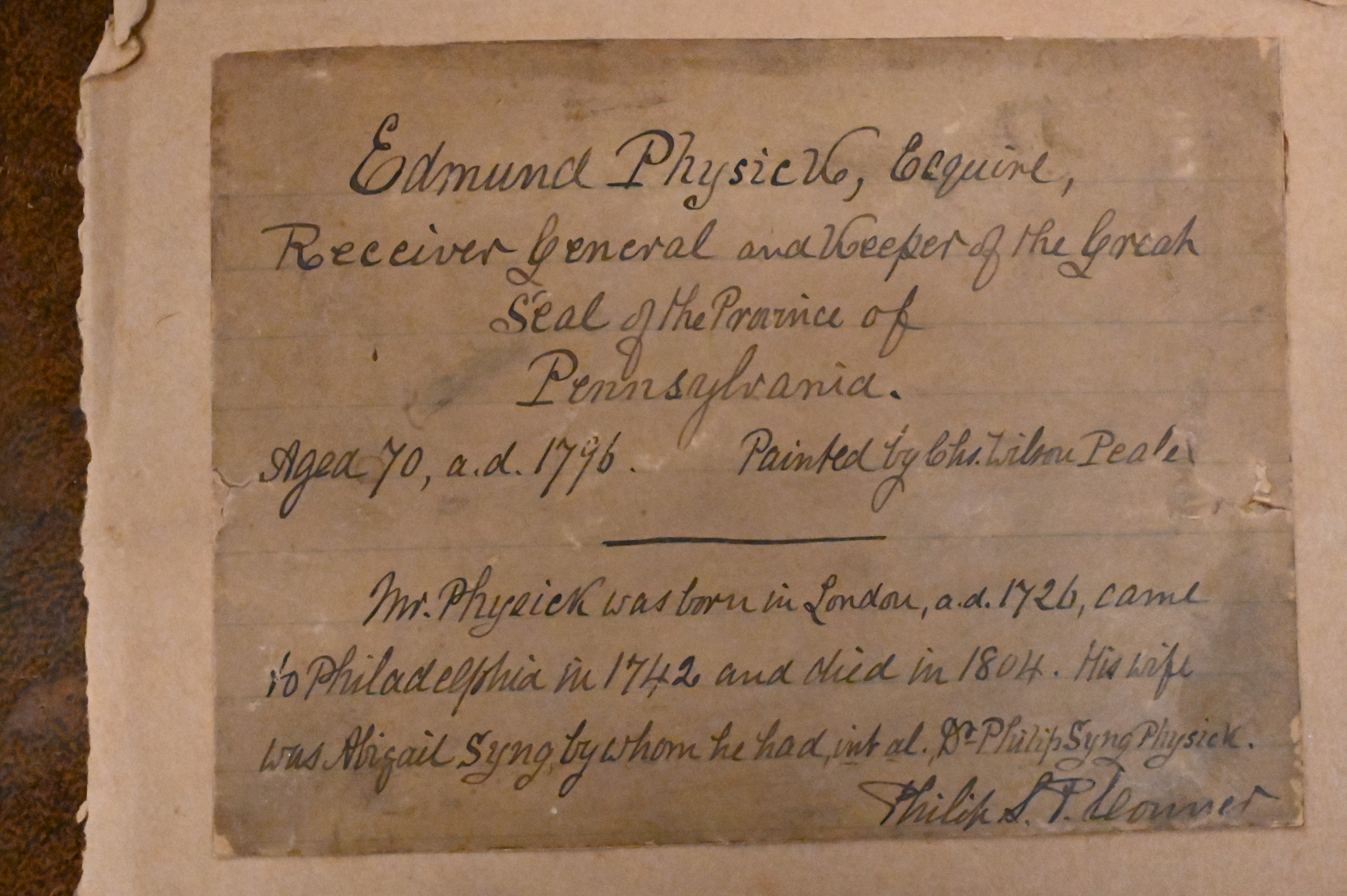 the following is sourced from Sotheby’s: Edmund Physick (1726-1804) an Englishman, was Receiver General and Keeper of the Great Seal of the province of Pennsylvania. After the Revolution, he remained as attorney and confidential agent for the Penns. His major concern was the handling of sales of proprietary lands. Physick and his wife, Abigail Syng, were the parents of the noted physician, Philip Syng Physick. A prototype by F. Gutekunst of the painting and a brief note discussing the work written by Philip S. Connor (relative of Mrs. Wister listed below) will accompany the lot