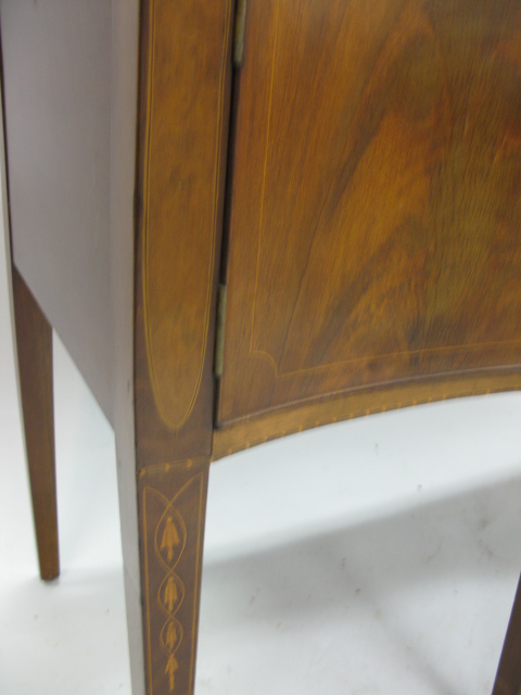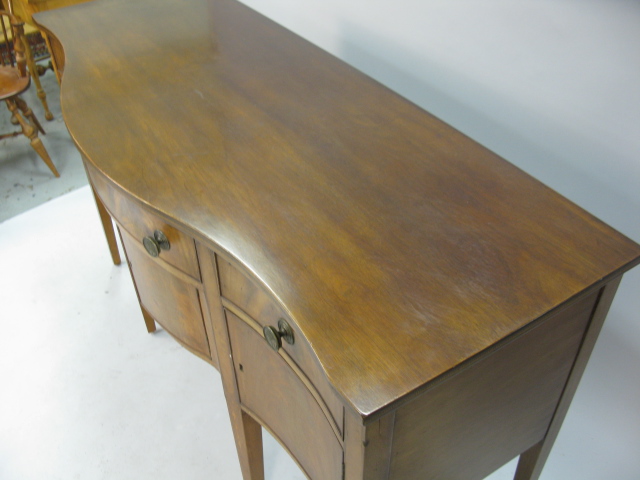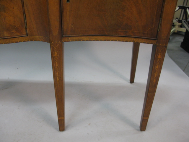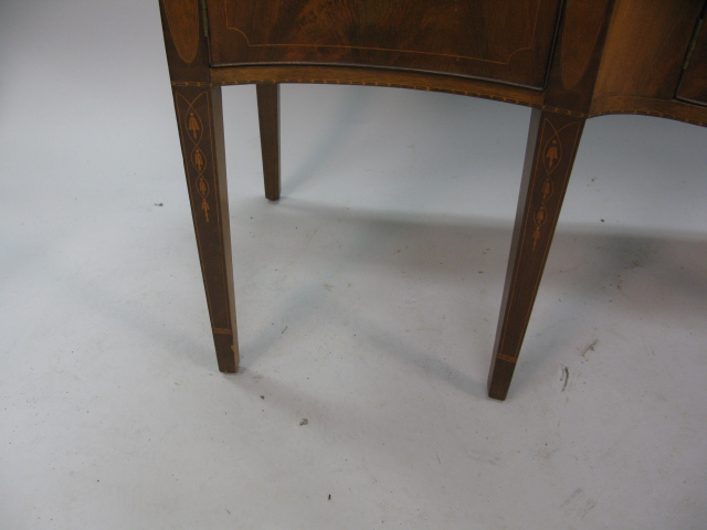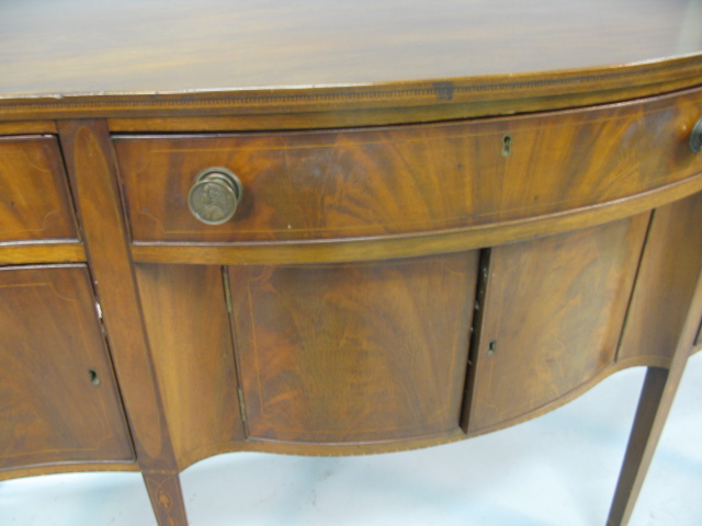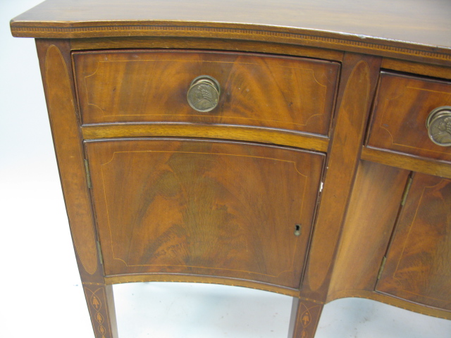 Federal style mahogany sidebaord with three drawers over four doors set on square tapered legs with line panel, bellflower inlay and period Benjamin Franklin brass pulls, made up of old wood.