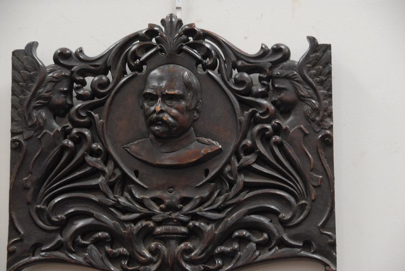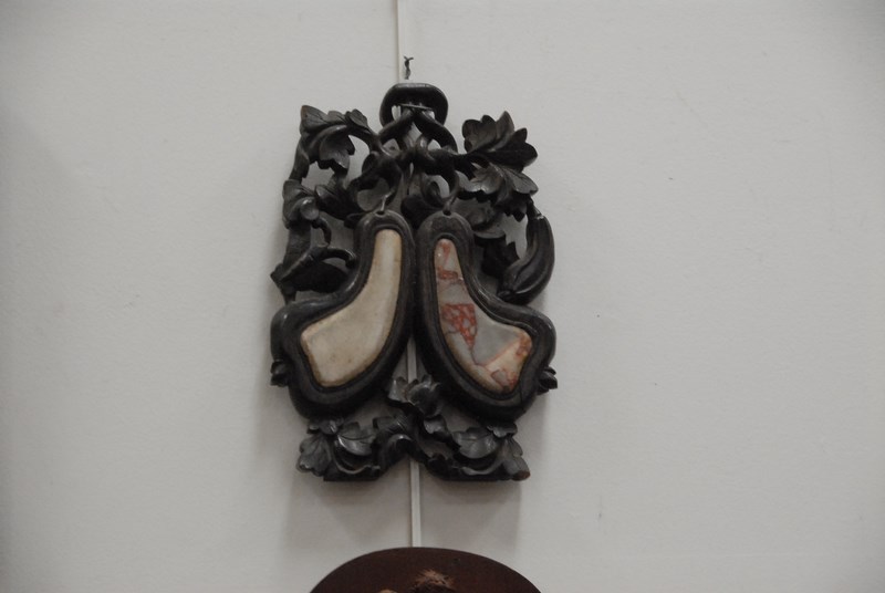Lot 400: Five piece group to include carved plaque with bust of man, small plaque with cherubs, two Asian pieces, and a collage.