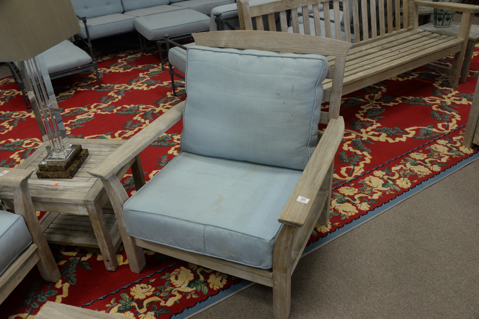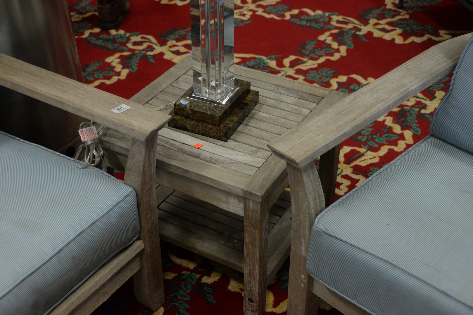 Lot 400: Four Piece Teak Outdoor Group to include pair of Kingsley Bate teak armchairs, along with a pair of outdoor classic tables, width 34 inches, depth 32 inches.