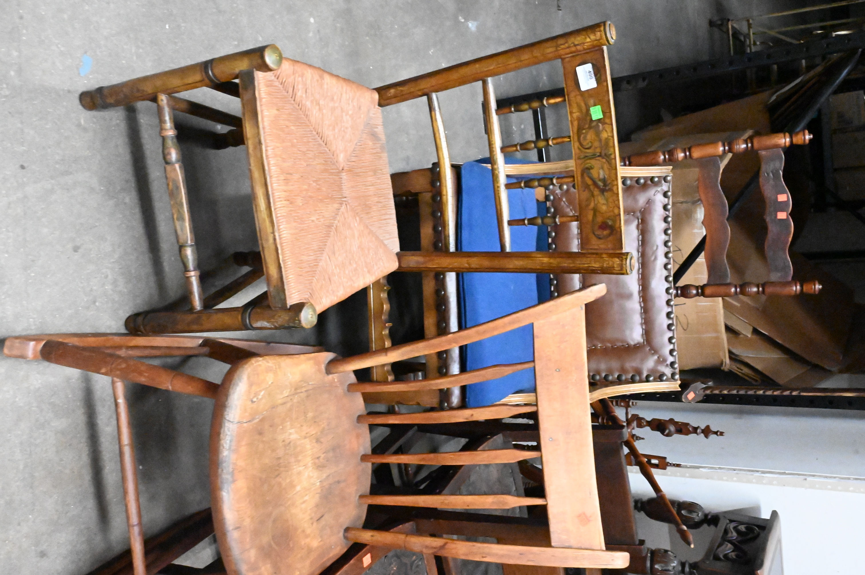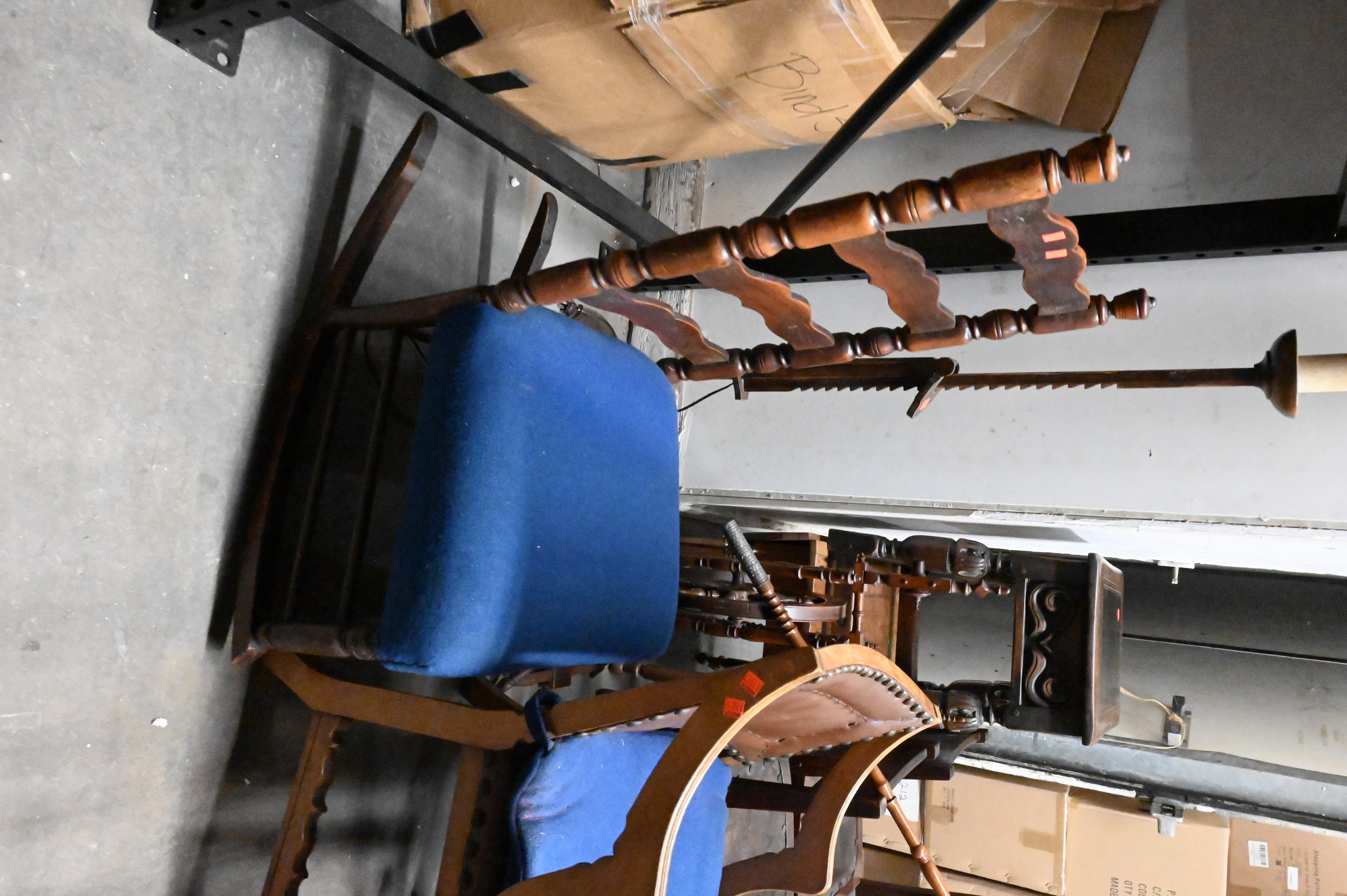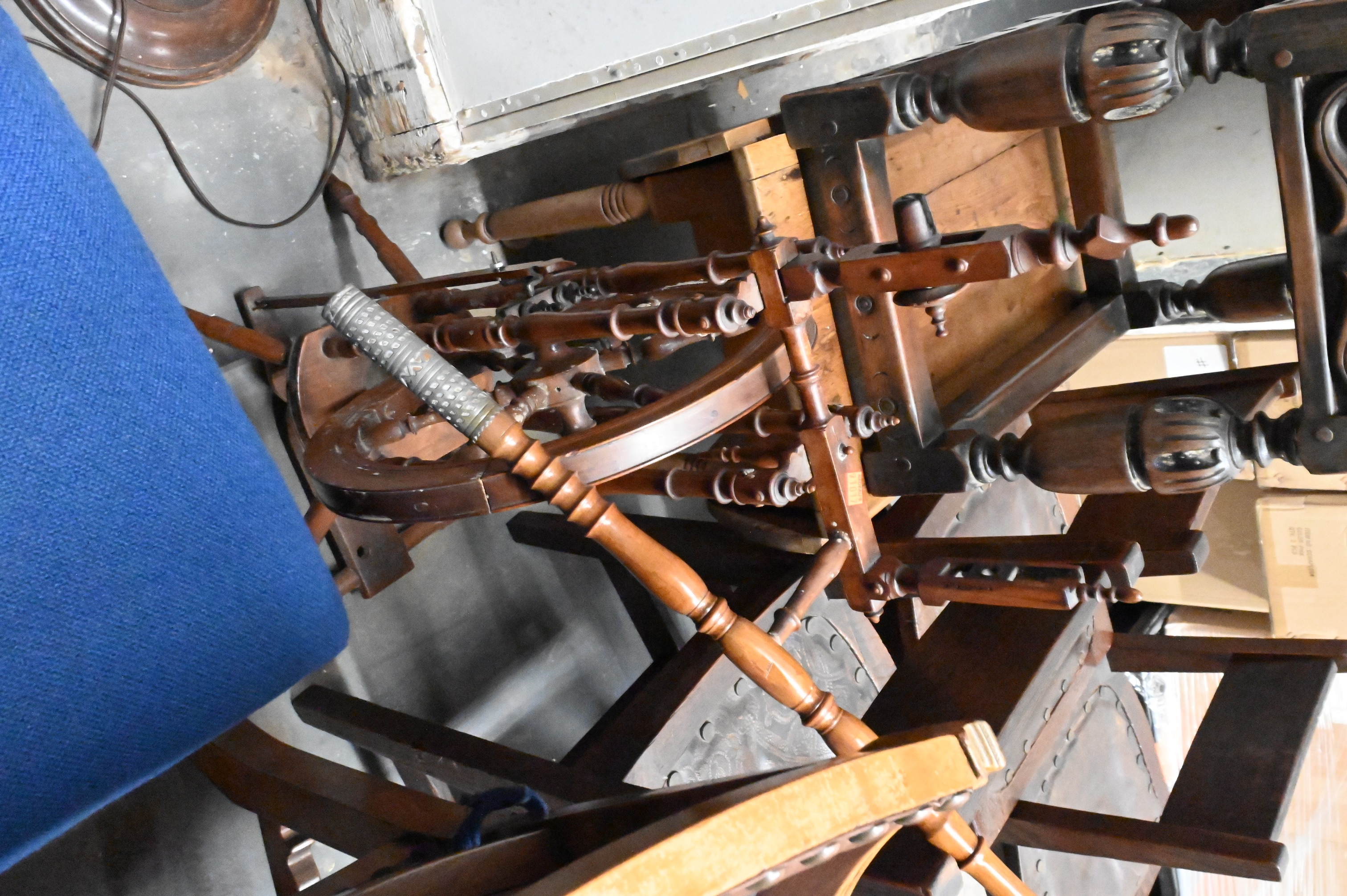 to include a ladder back rocker, two small tables, three chairs, a candlejack style floor lamp, a spinning wheel, and four small oak chairs
