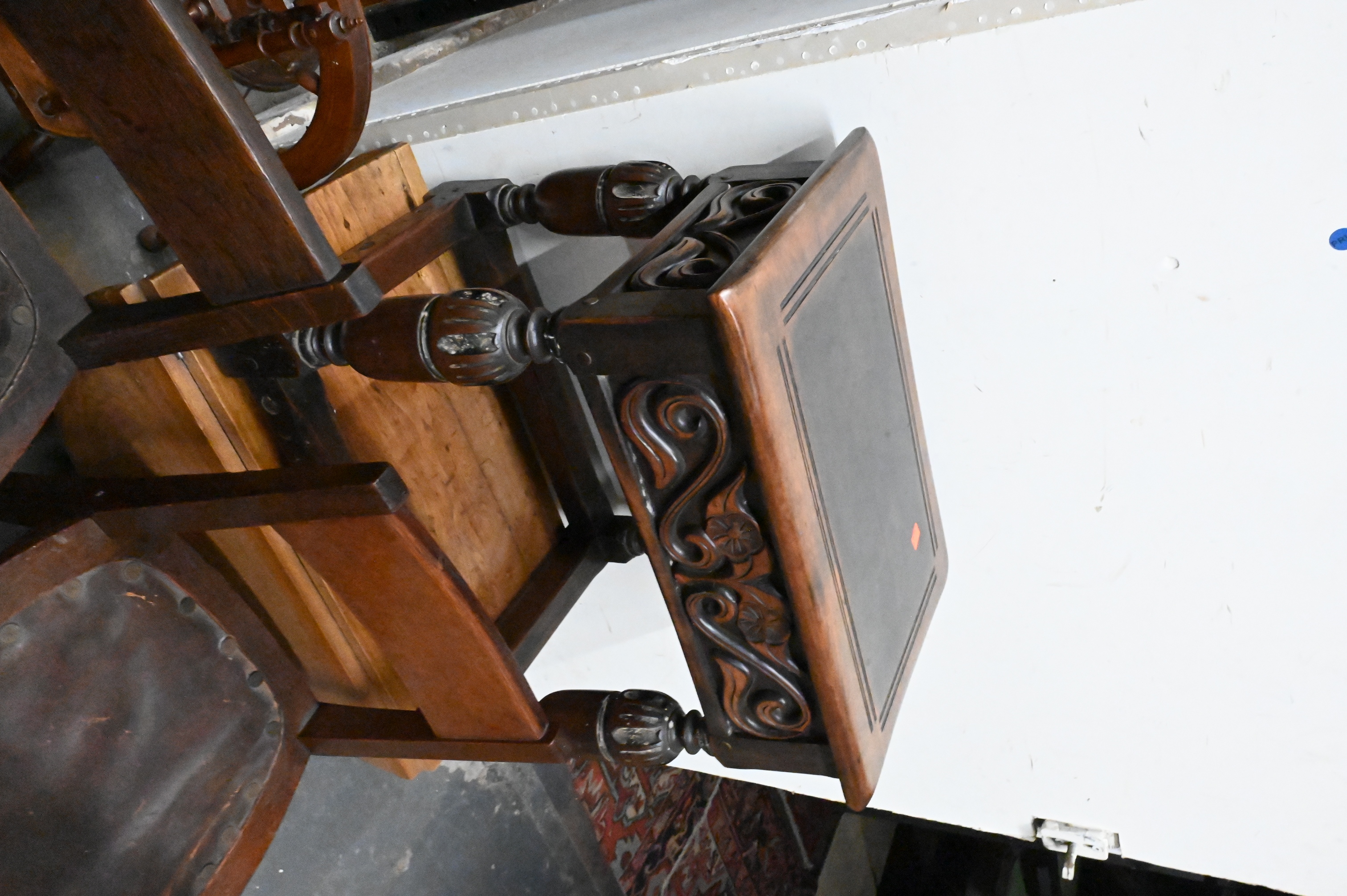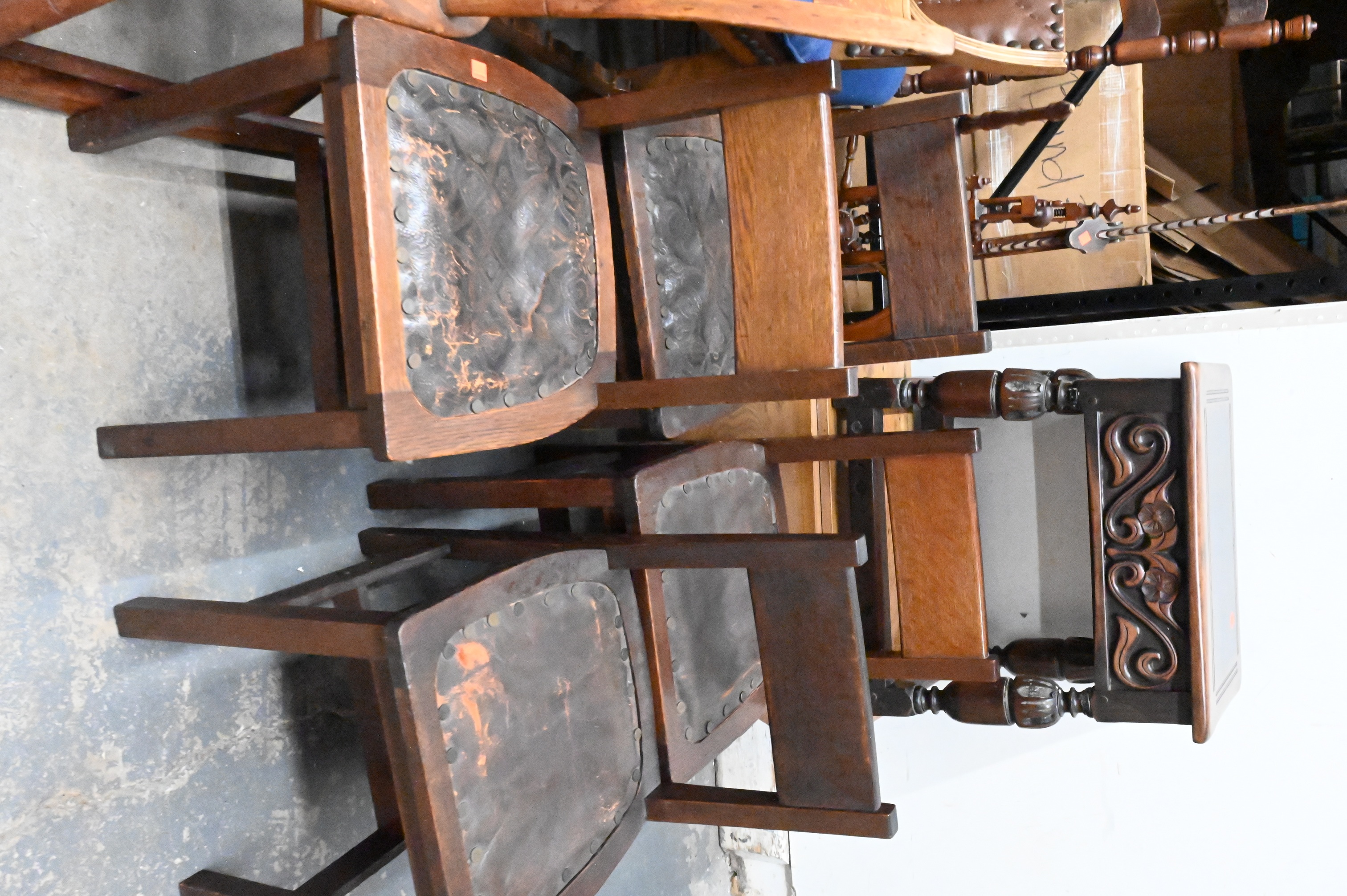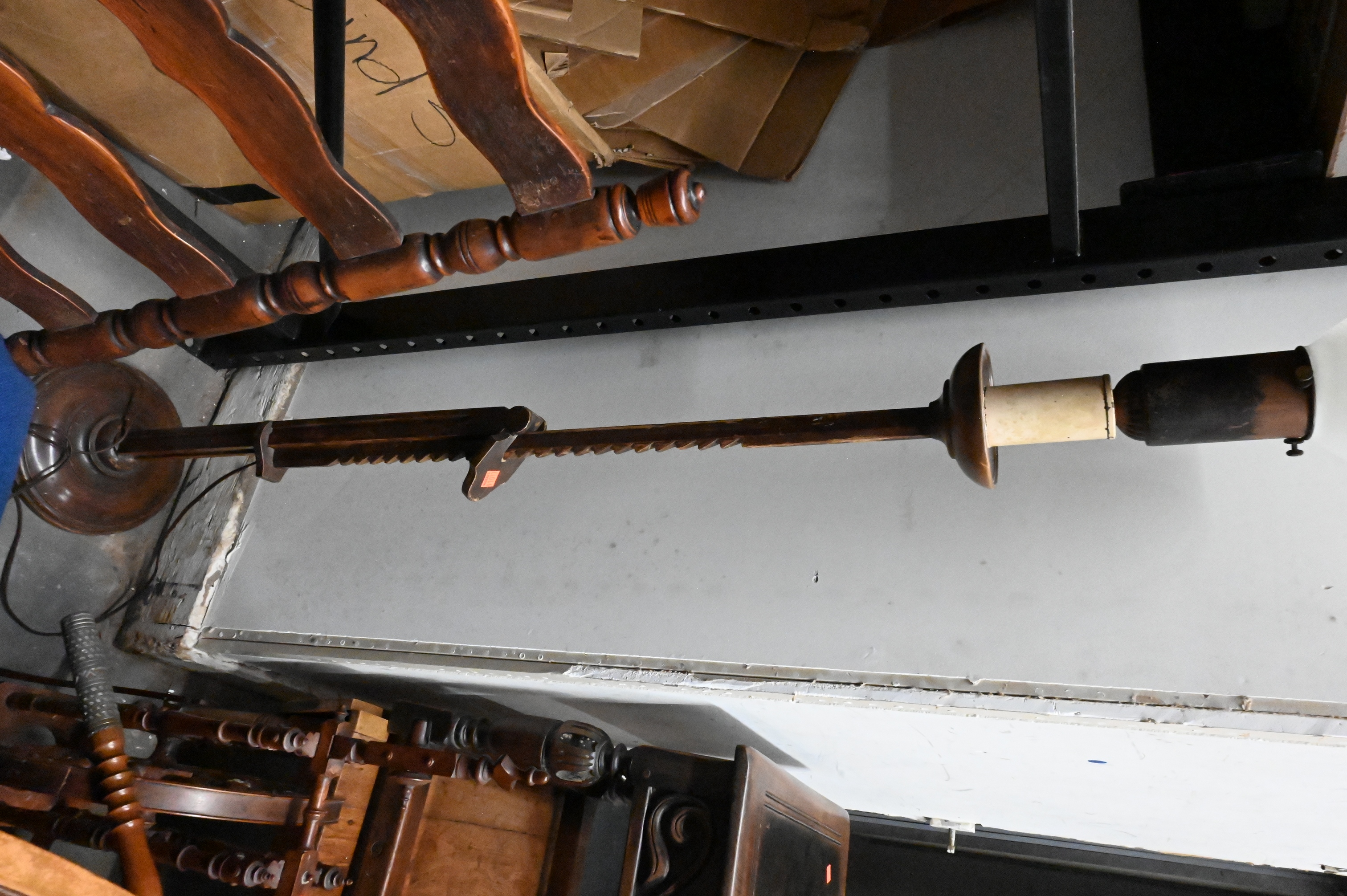 to include a ladder back rocker, two small tables, three chairs, a candlejack style floor lamp, a spinning wheel, and four small oak chairs