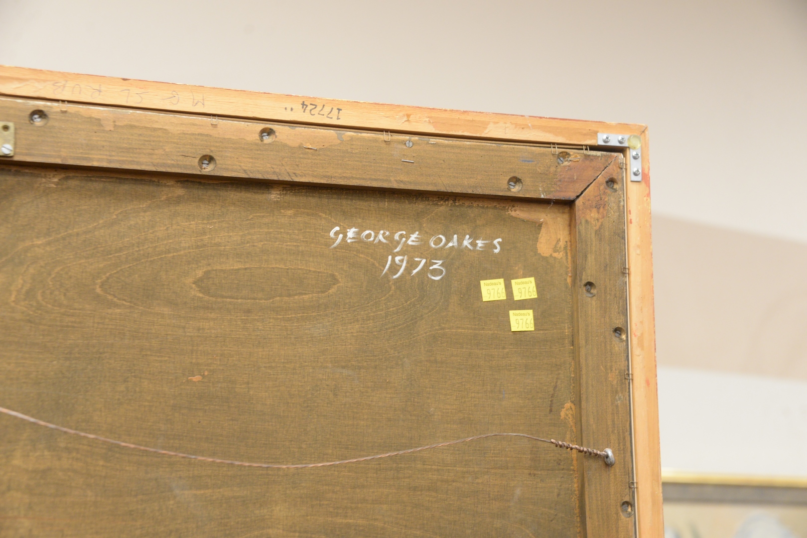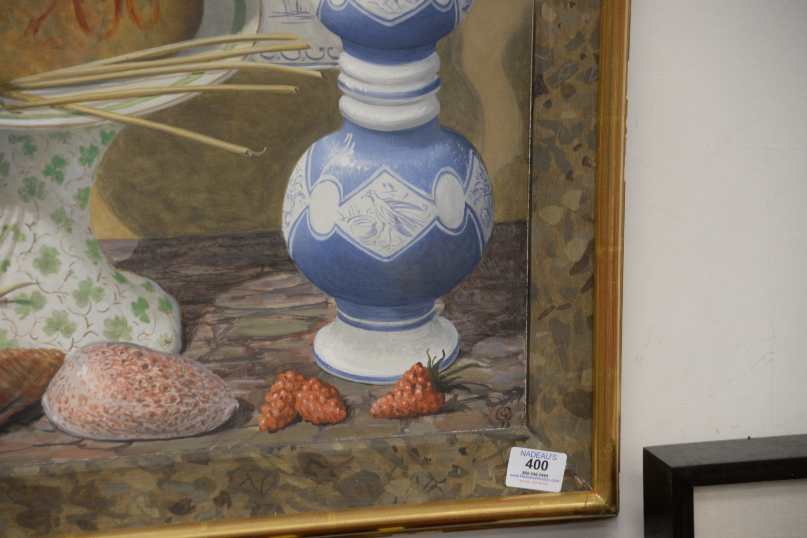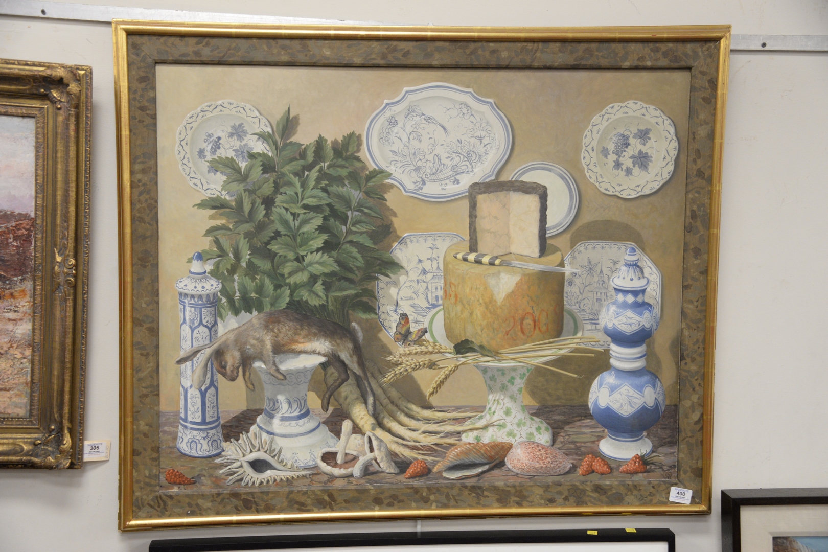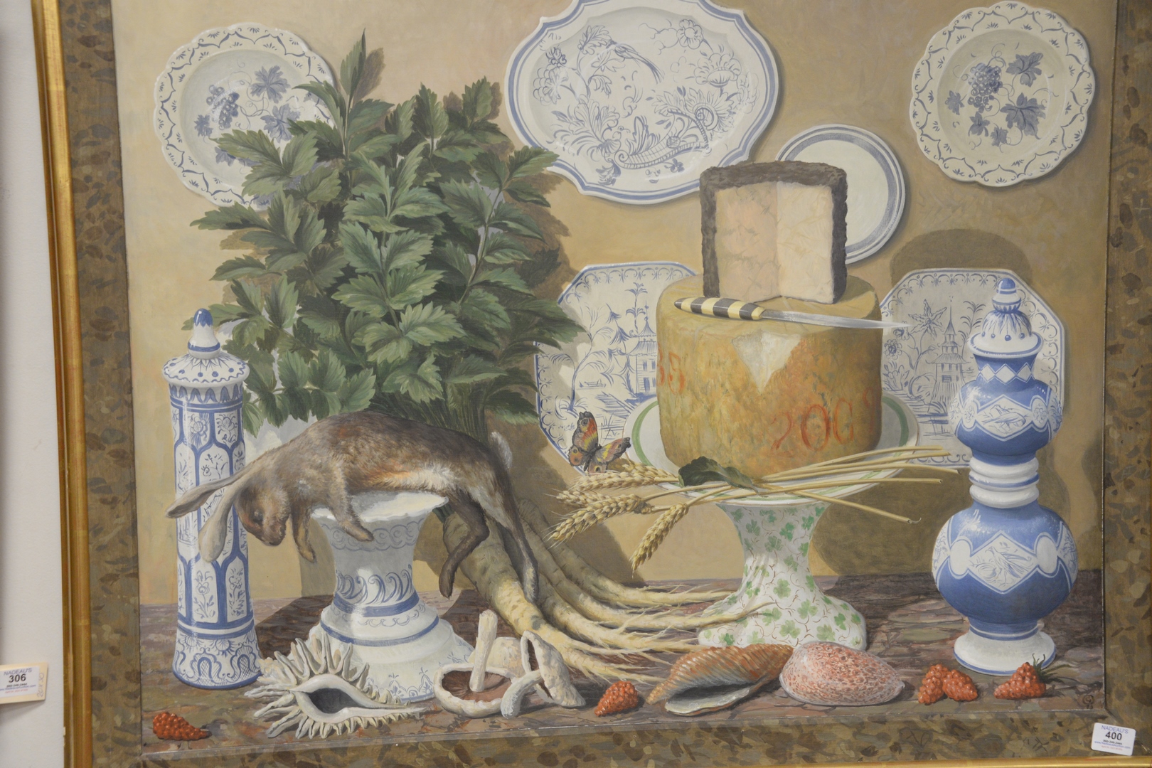 Lot 400: George Oakes British, 1940 – 2017 Trompe l’oeil, Still life with blue and white porcelain, rabbit, cheese, shells, mushrooms, and fruit, oil on board, monogrammed lower right G.O., 28 1/4 x 35 1/4.